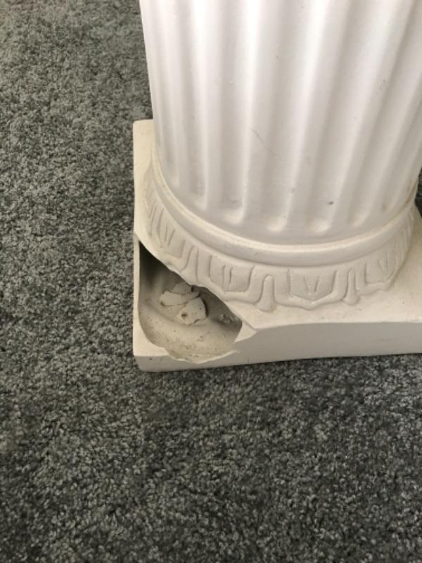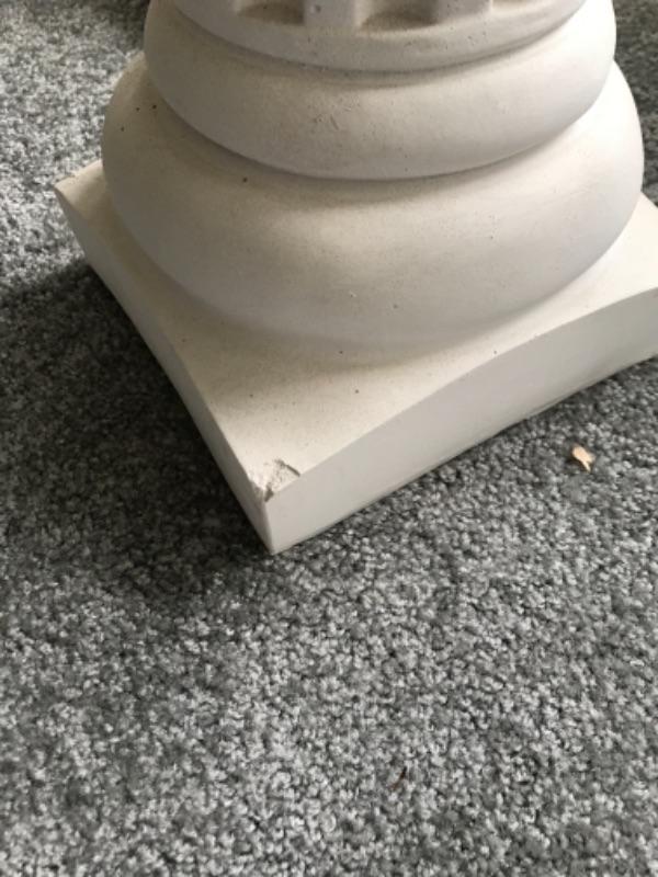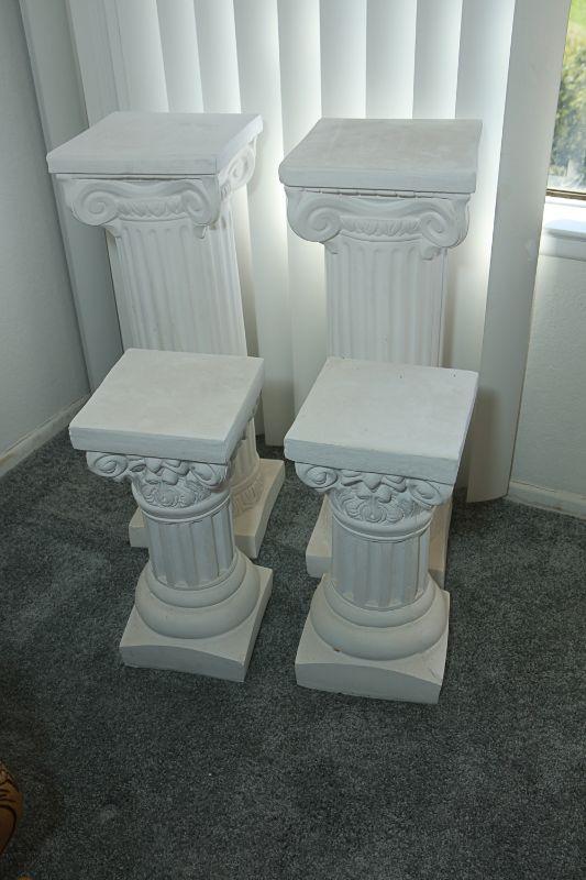 Set of 4 Greek column style stands. Two different sizes. Great for plants or statues. Tall pillars are about 30” and the smaller are 19” tall. Unfortunately one of the taller ones has a busted corner, made of a thin plaster. Paintable matte finish.