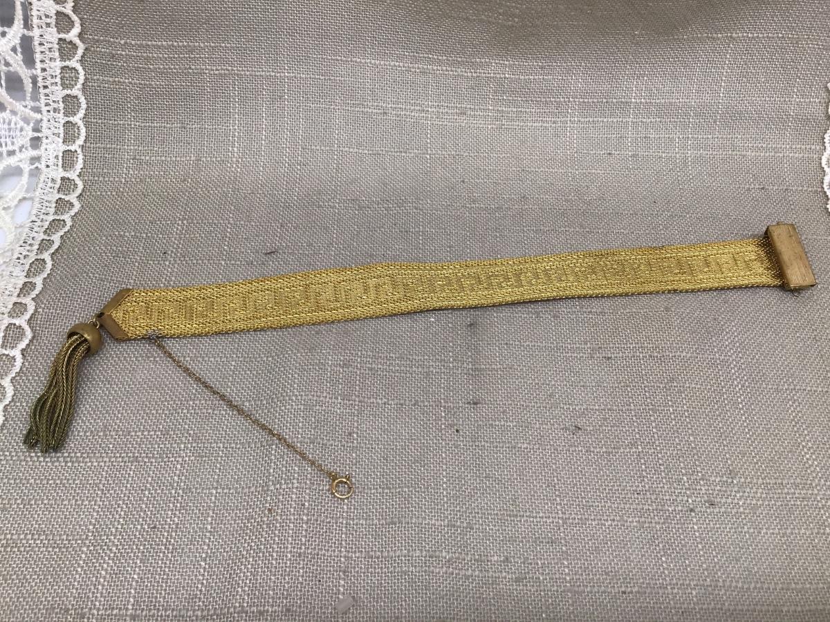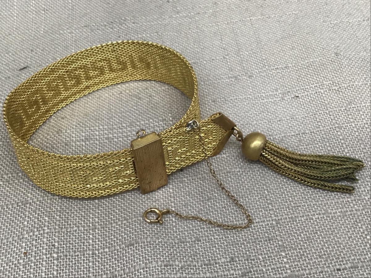 Greek Key Mesh Tassel Bracelet Slide Adjustable Vintage Gold Tone