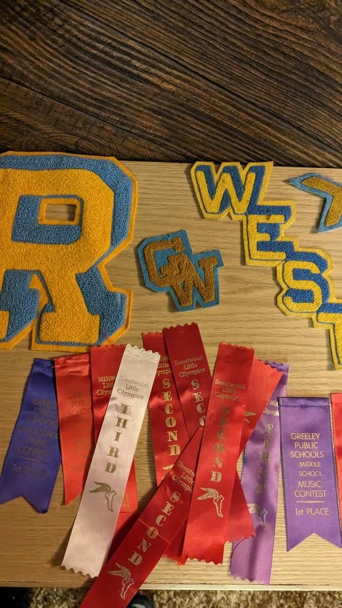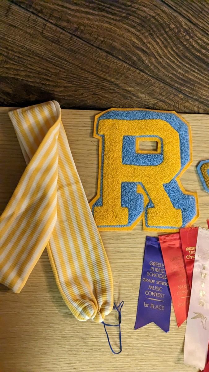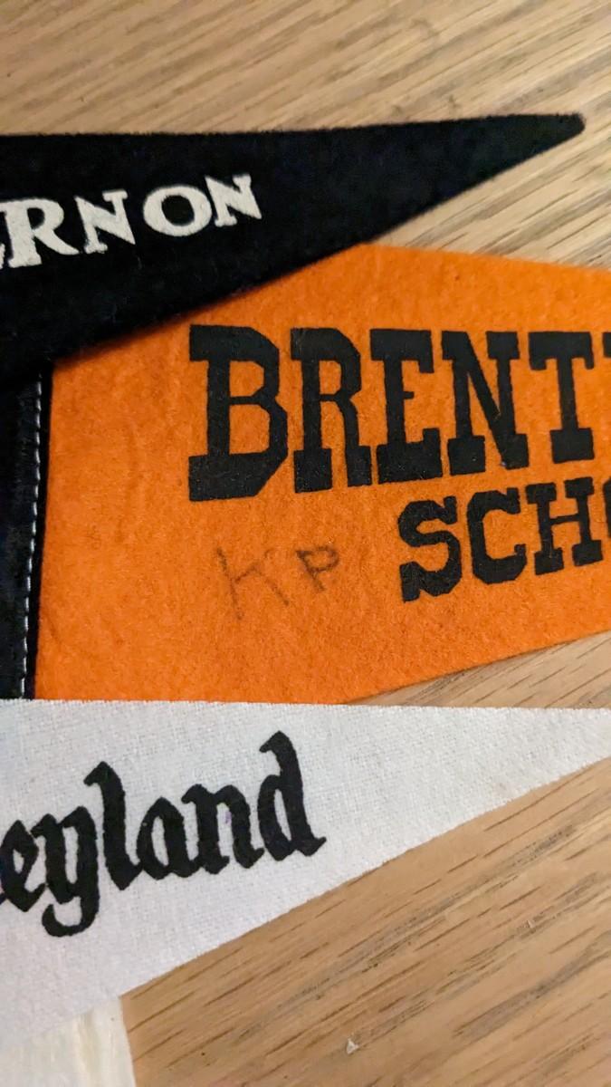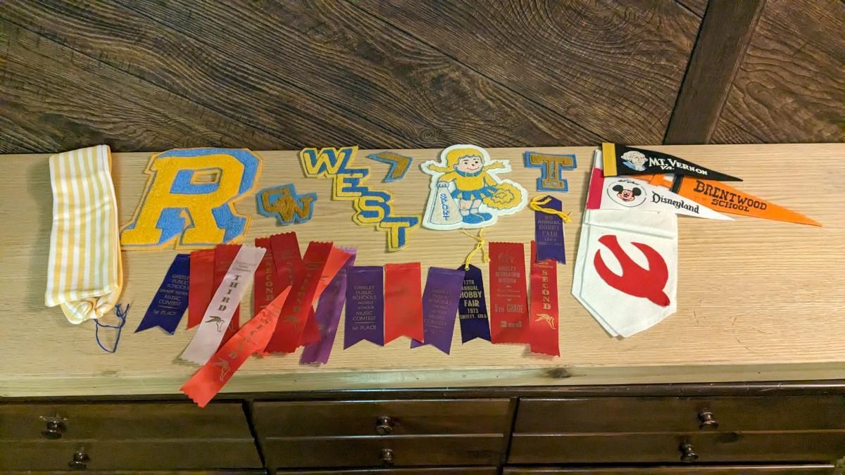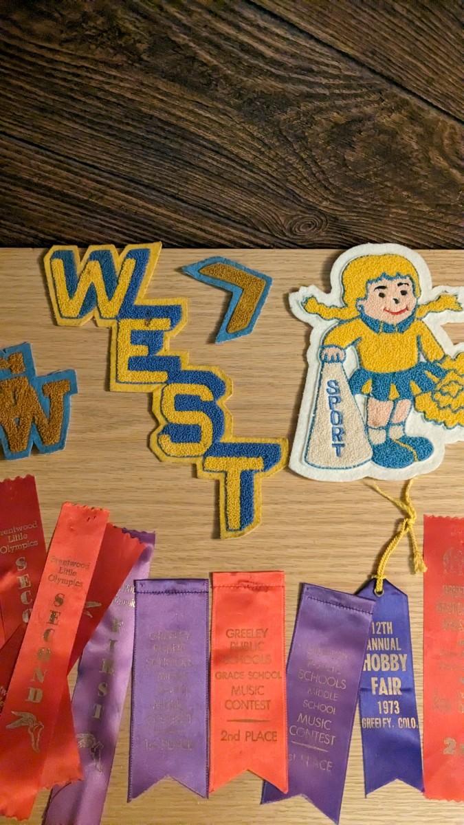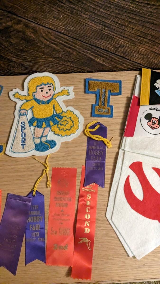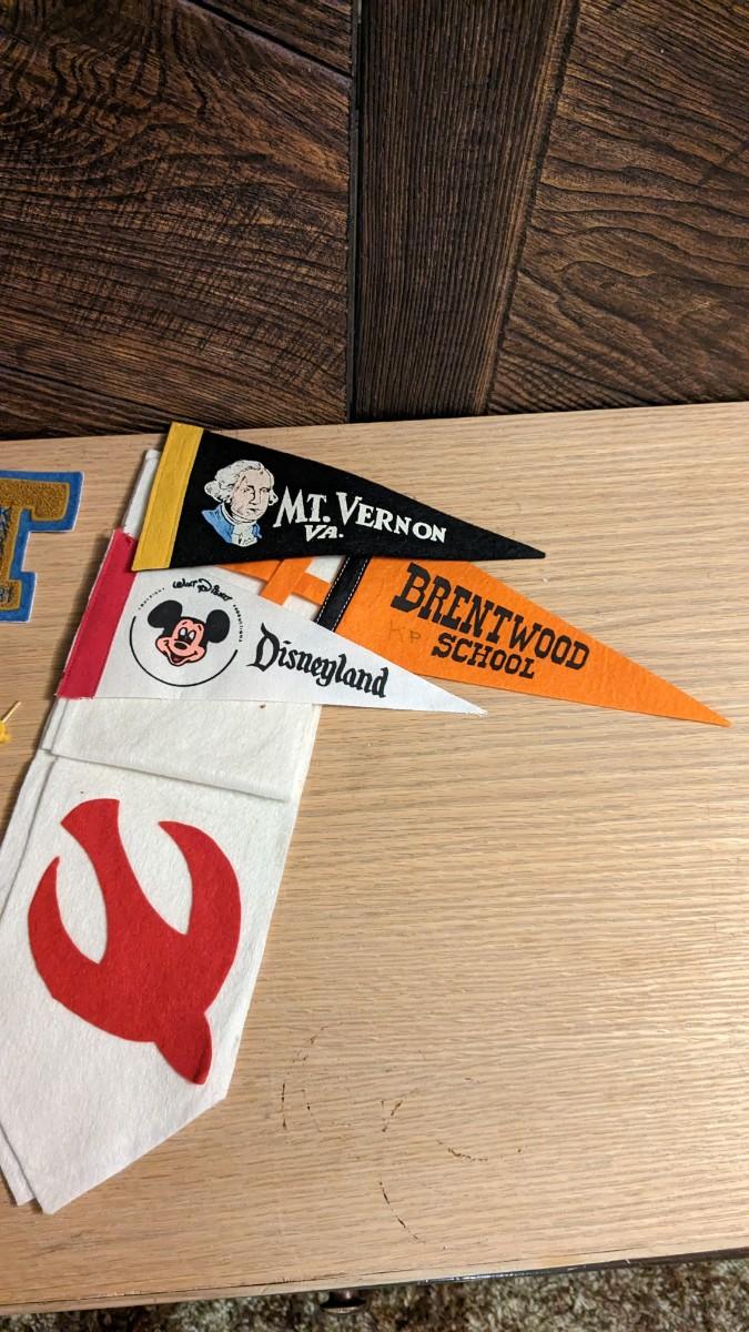 a cute little array of vintage Greeley, CO women's letters, satin ribbons, and felt pennants. Includes Mt. Vernon and Disneyland. Note Brentwood School has initials marked on front. A very neat little piece of local history. basement