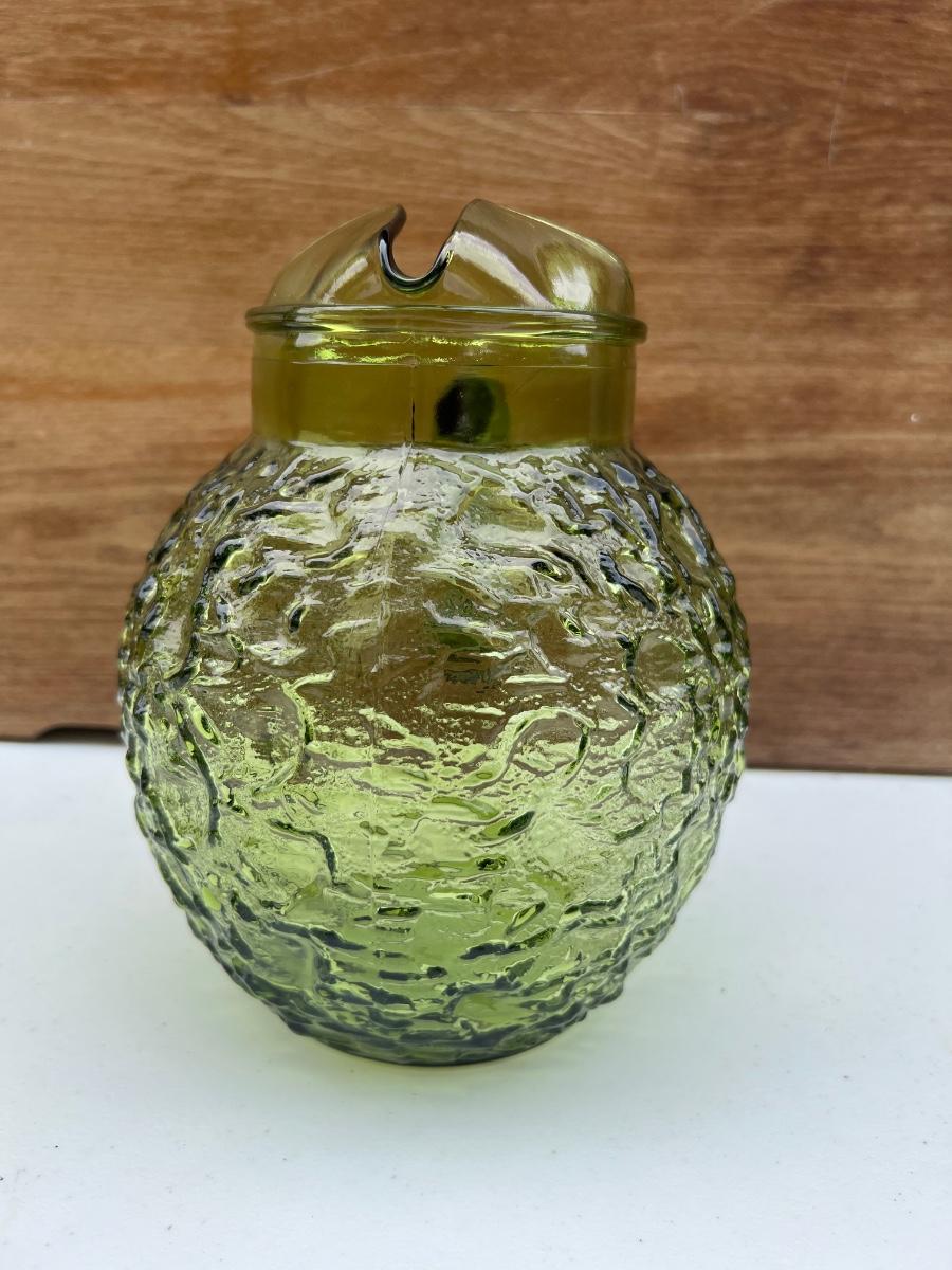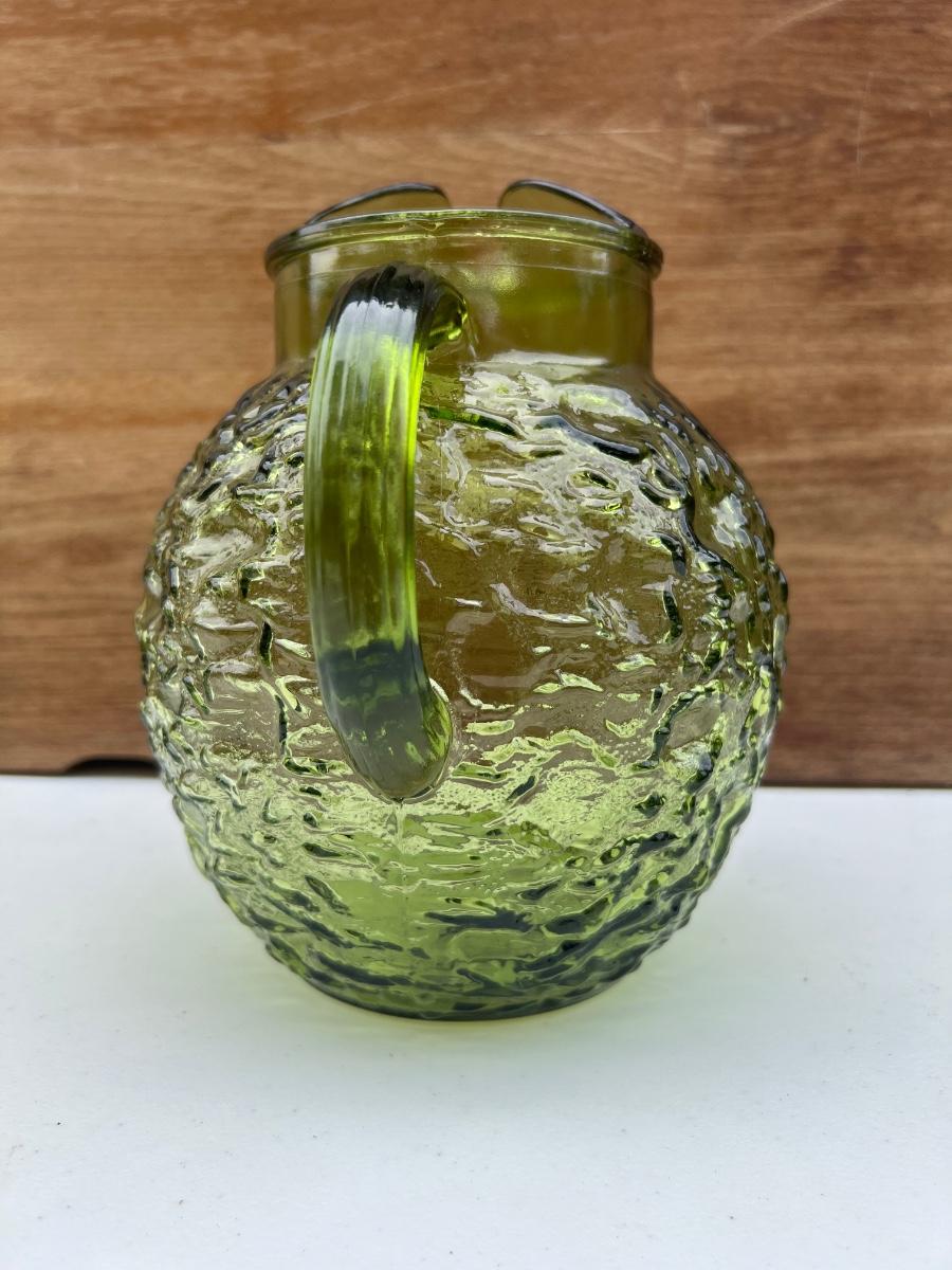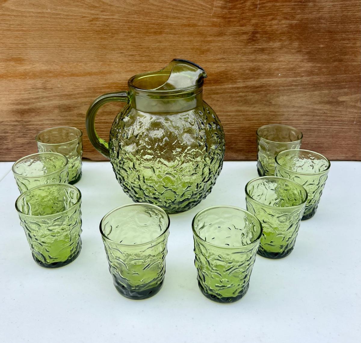 Vintage Anchor Hocking Glass Ball Pitcher Lido Milano Crinkle Avocado Green Picture measures 9 inches tall glasses measure 3 1/2 inches tall