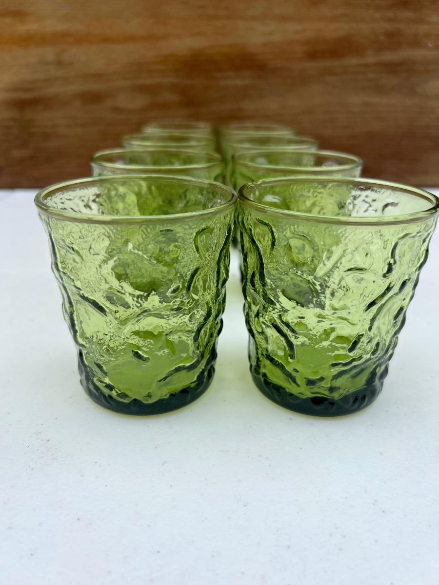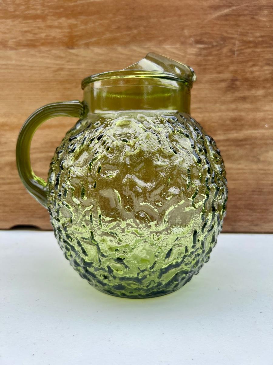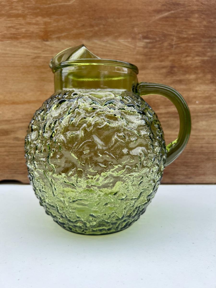 Vintage Anchor Hocking Glass Ball Pitcher Lido Milano Crinkle Avocado Green Picture measures 9 inches tall glasses measure 3 1/2 inches tall
