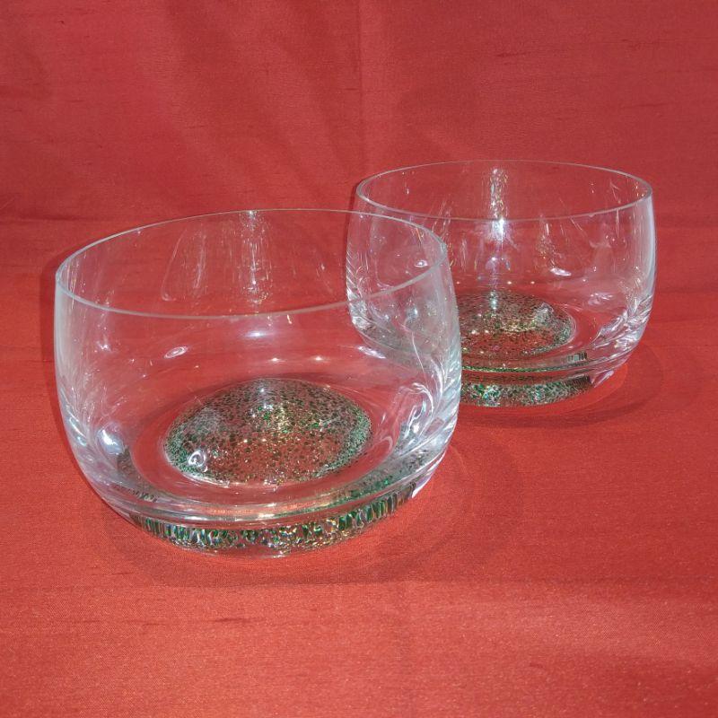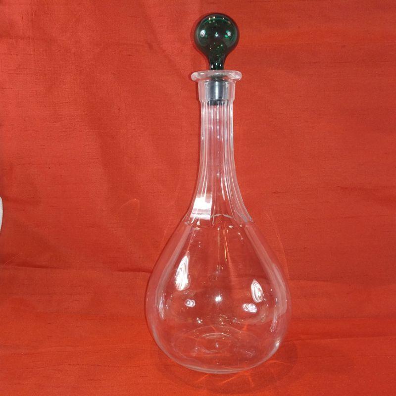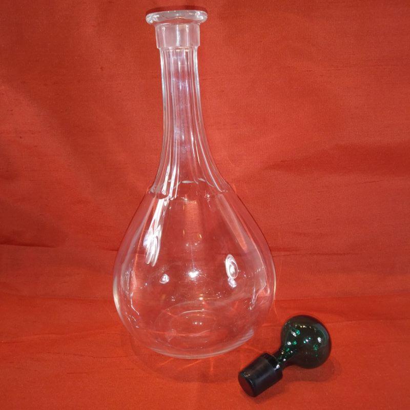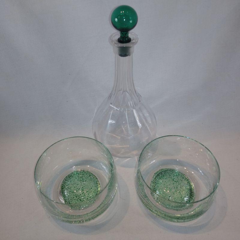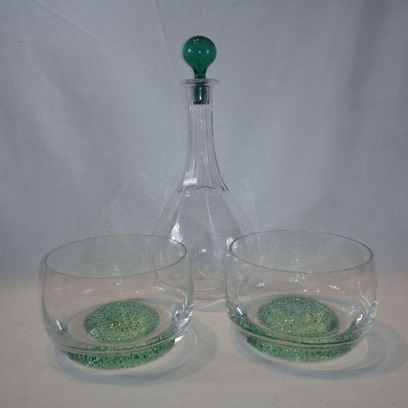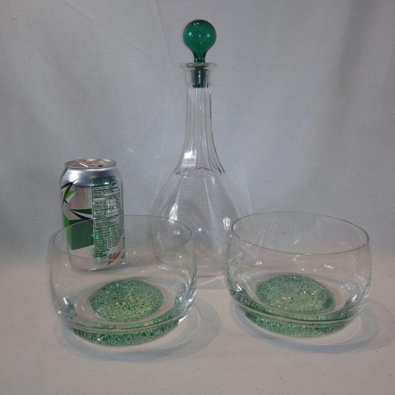 This is a collection of crystal and ground glass bowls and decanter. The decanter is 11-inches tall with the stopper by 4-1/2-inches in diameter. The two lovely bowls with the raised green art glass bottoms are 5-inches in diameter X 3-1/4-inches tall.. All are very nice serving pieces.
