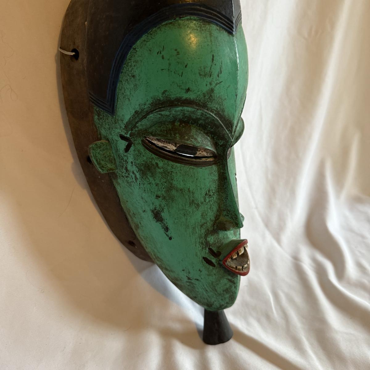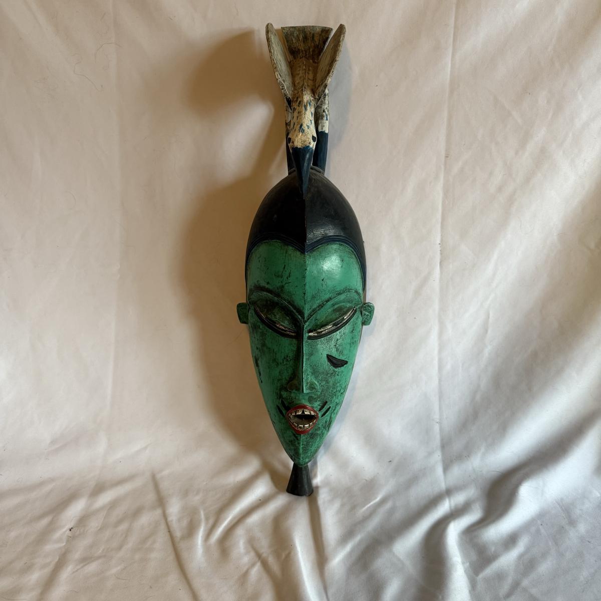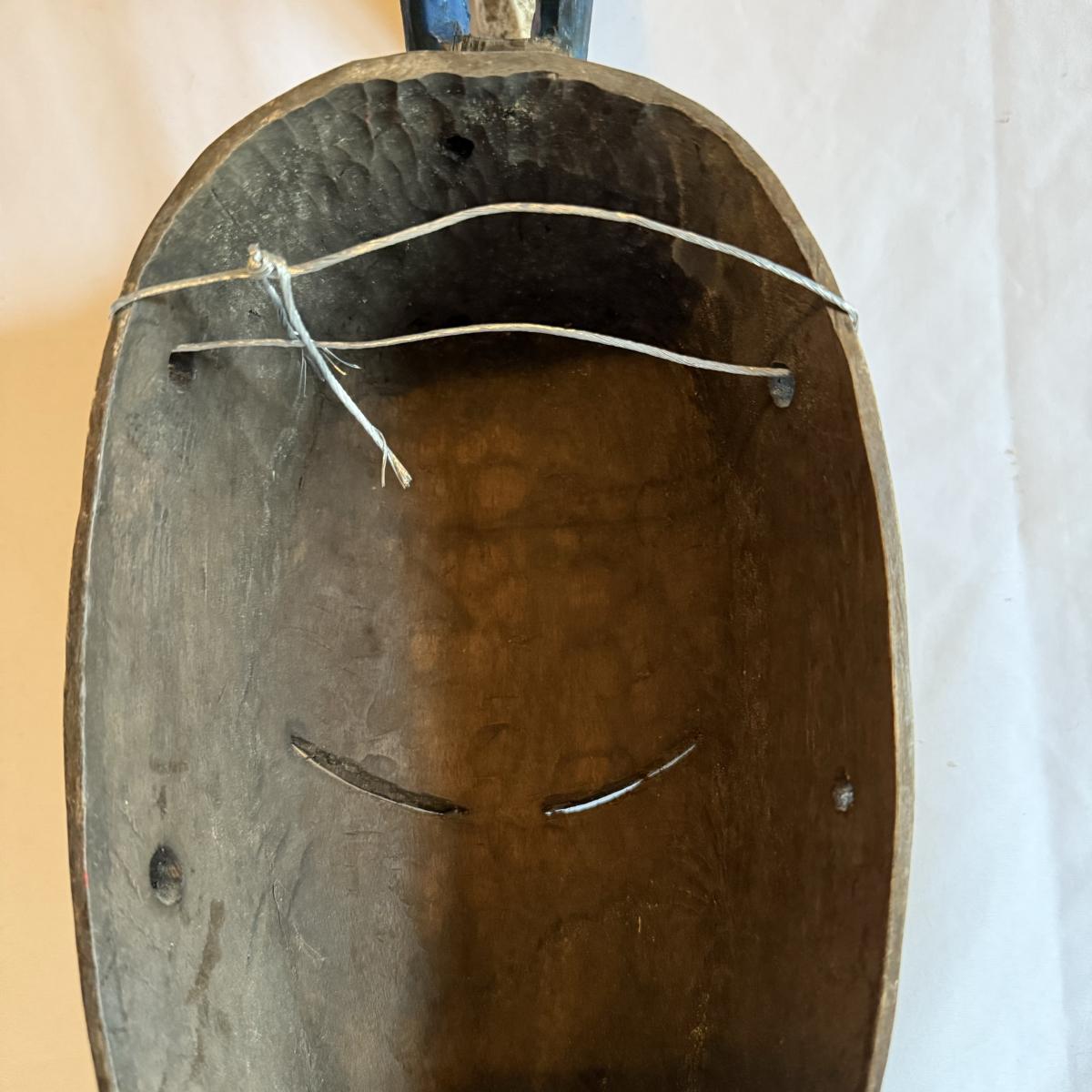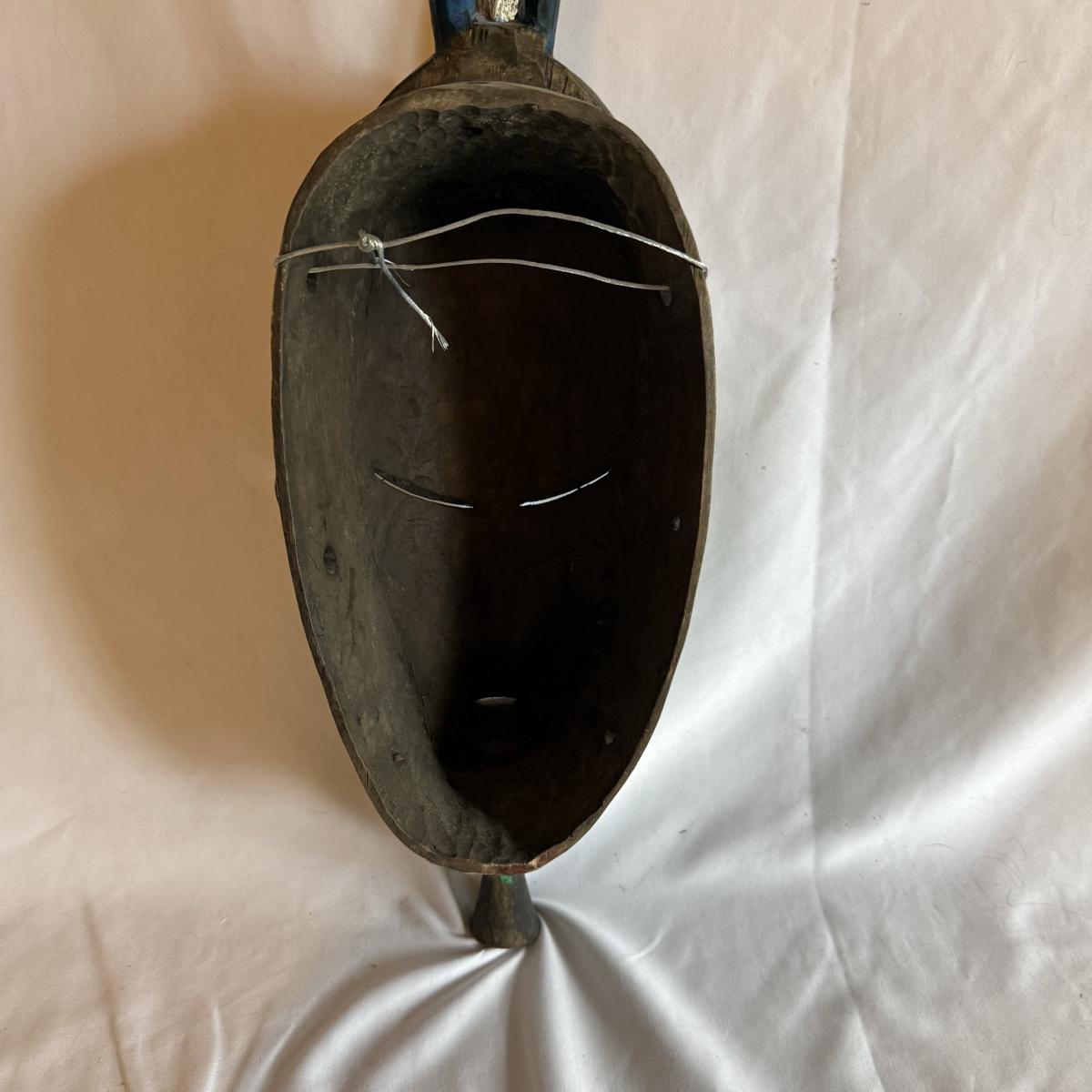 This piece appears to be an African mask, hand carved from wood and painted. It measures approximately 7” X 5.5” X 21”H.