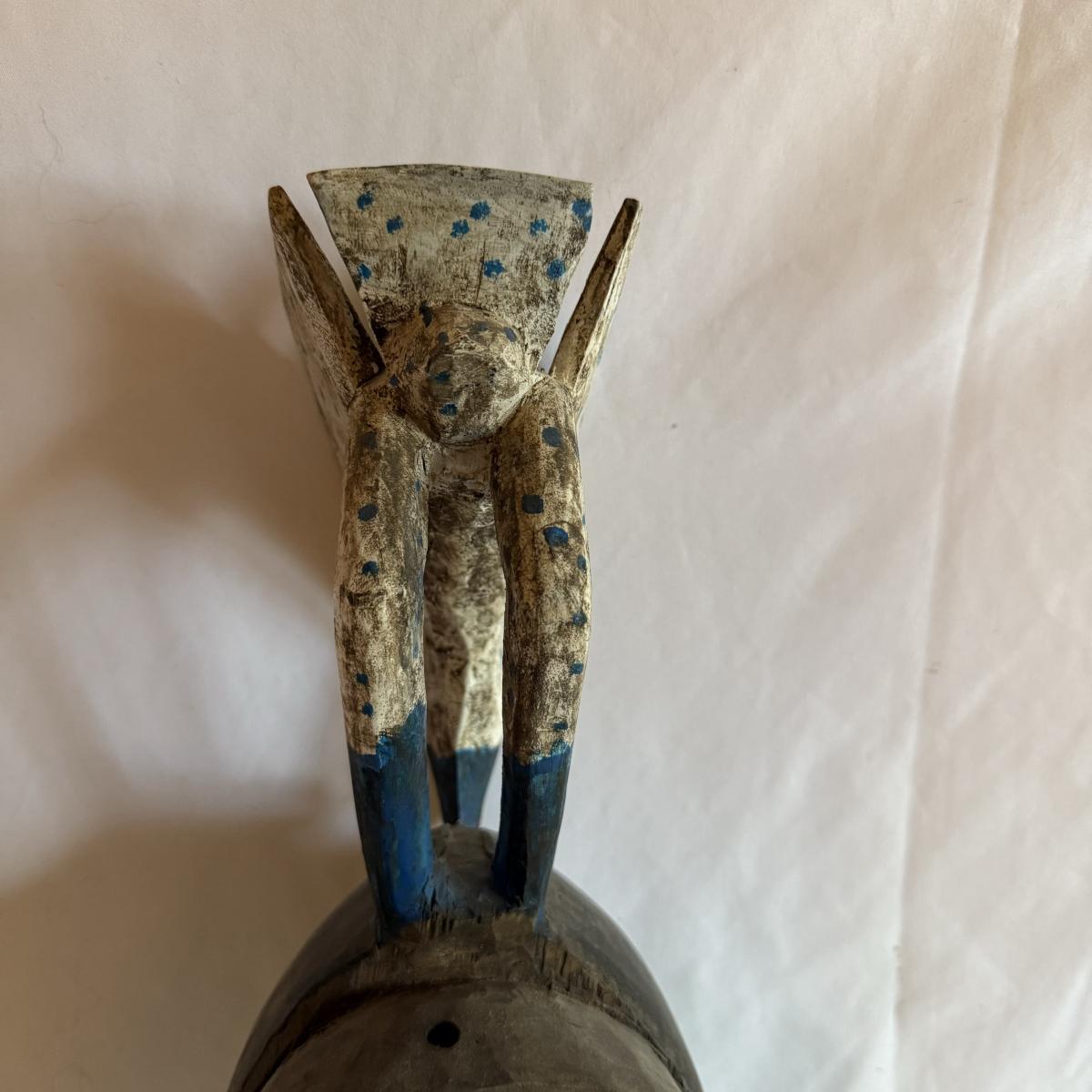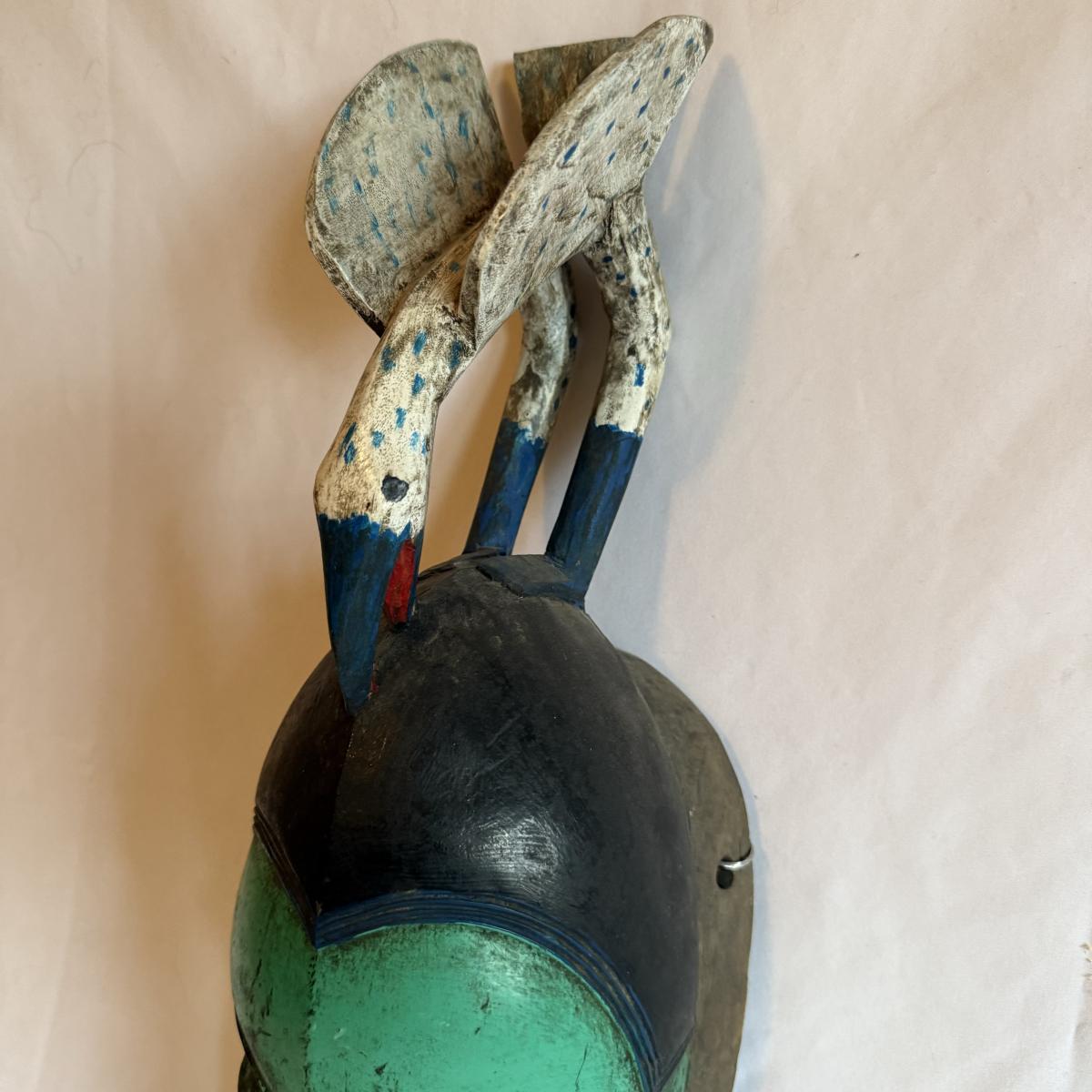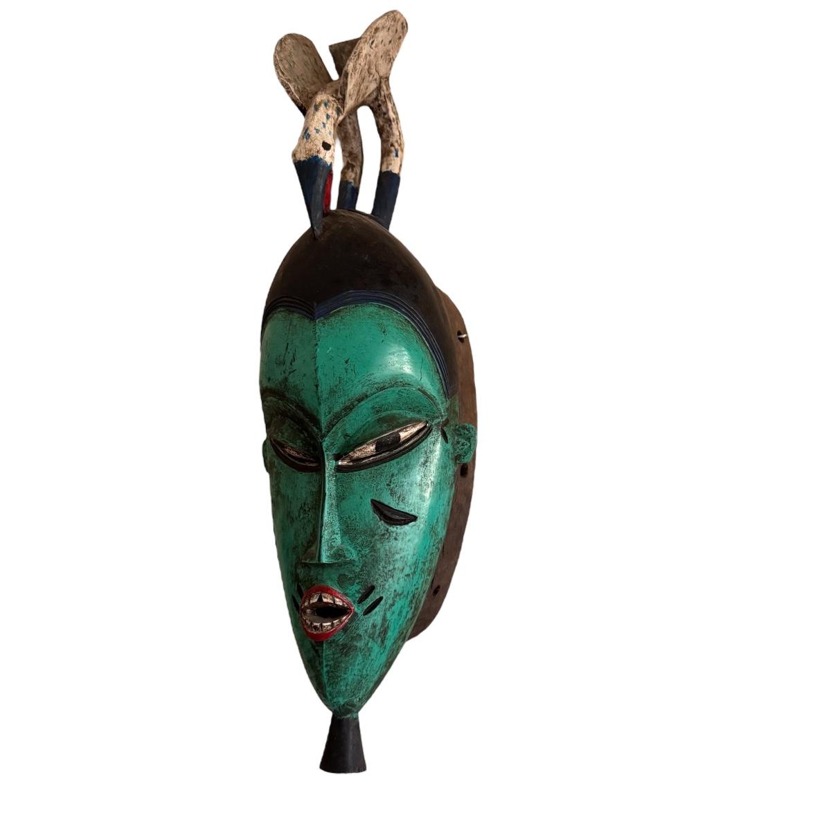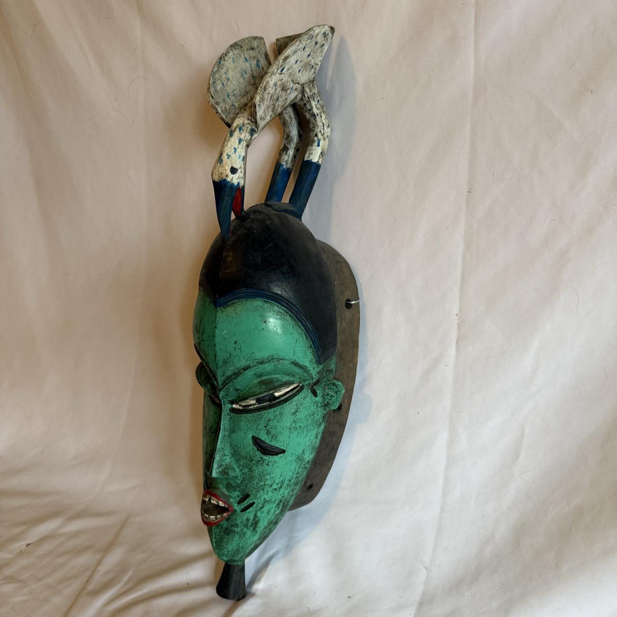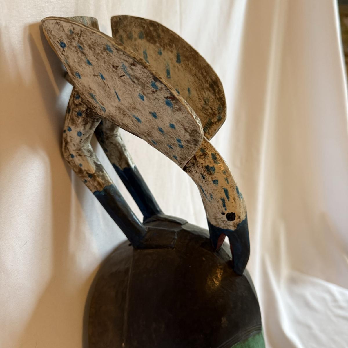 This piece appears to be an African mask, hand carved from wood and painted. It measures approximately 7” X 5.5” X 21”H.