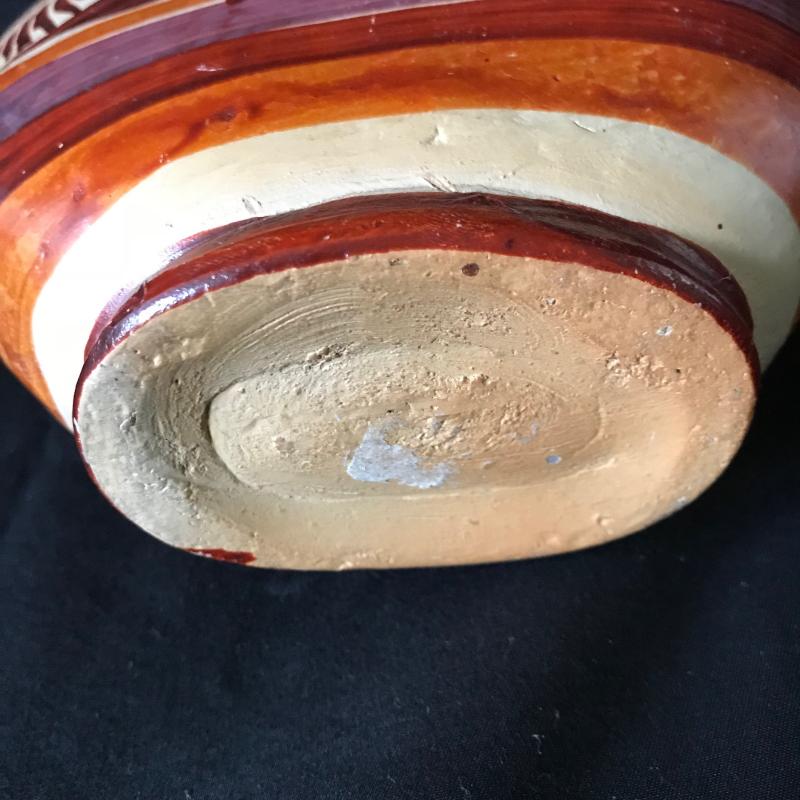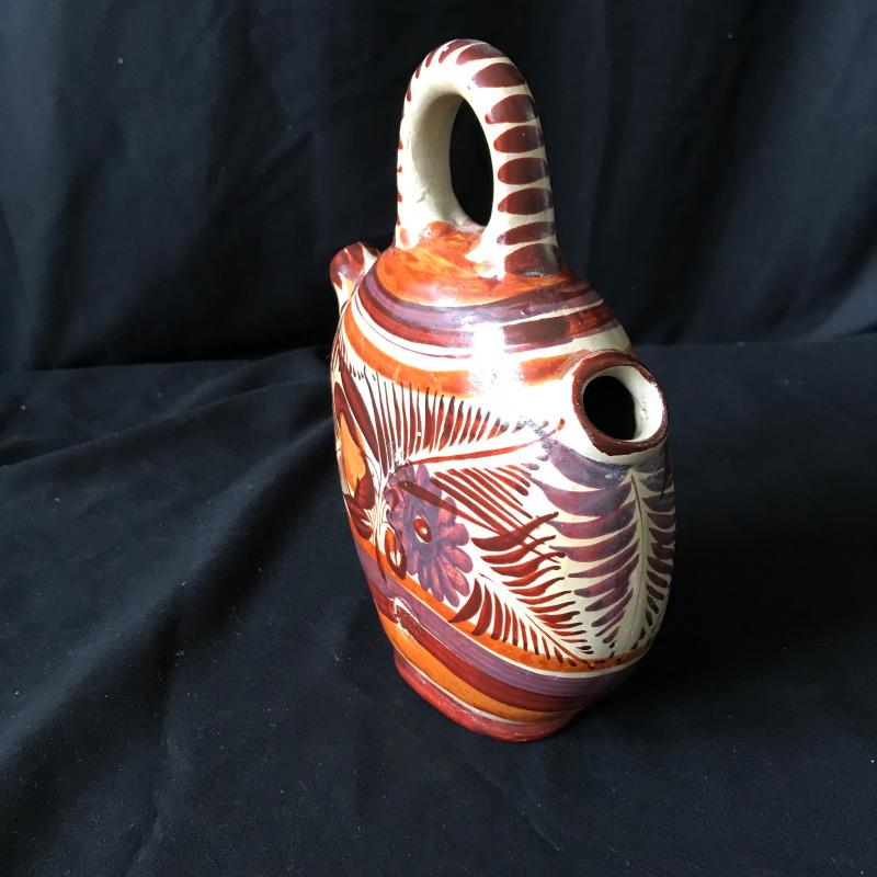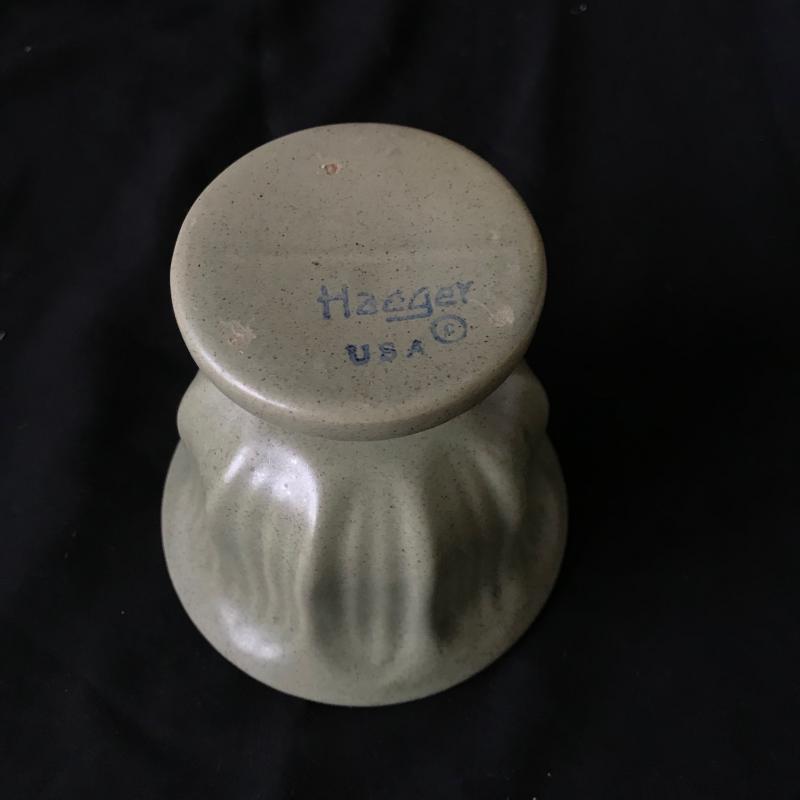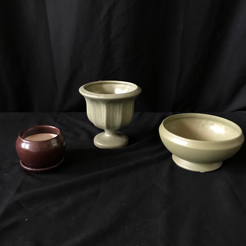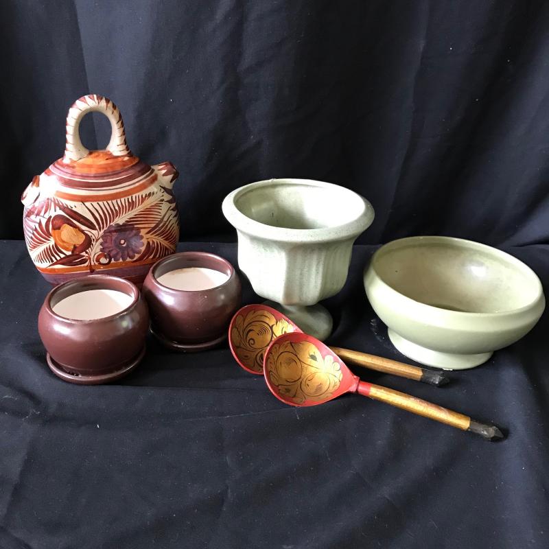 Lot contains pottery of various styles, all in green and brown tones. Larger green planter is marked “Haeger” and is approx. 5” in diameter and 5” tall. Mexican Folk Art piece is approx. 6” x 2” x 8”. Lot also included a pair of Folk Art painted wooden spoons. Shipping available or local pickup in Hendersonville, NC.