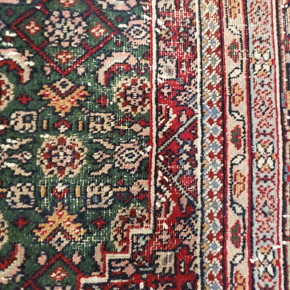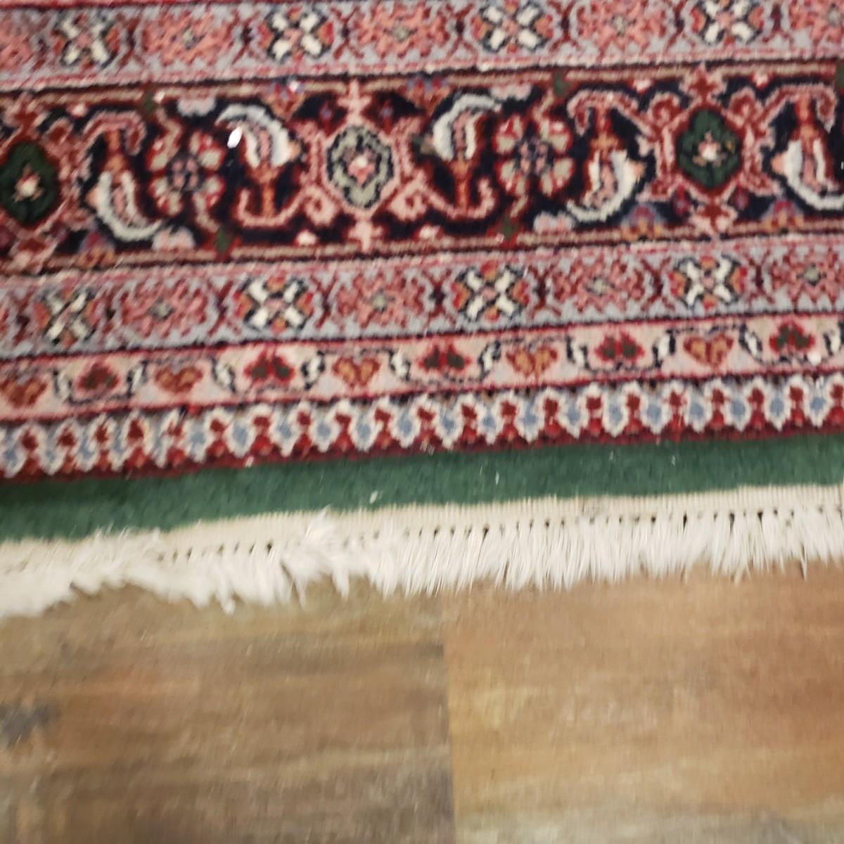 This approximately 9' x 6' area rug has greens and red in a beautiful pattern. The rug comes with a padded rubber bottom. The rug is a little worn in the 5th picture shown. It appears to be wool. From a dog friendly house. Local pickup only.
