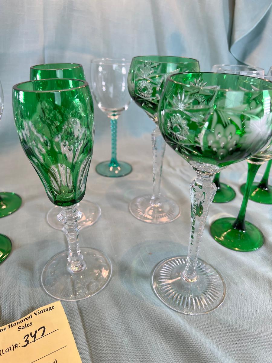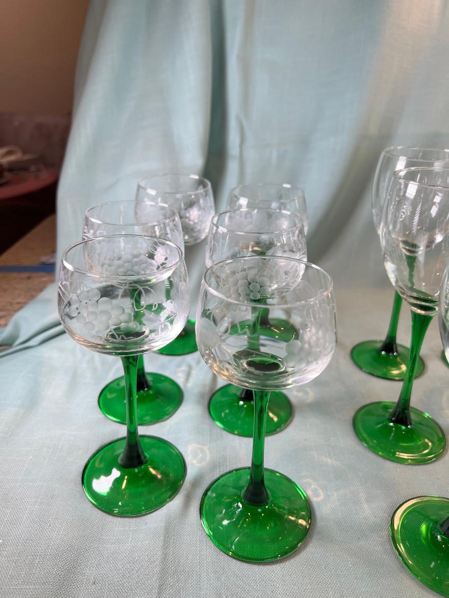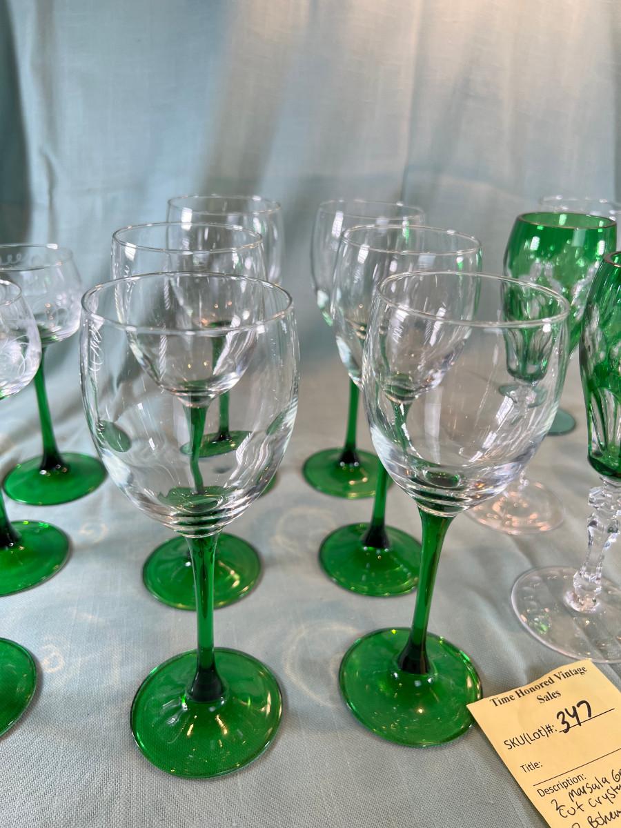Marsala Green cut crystal flutes, Bavarian cut 10 Clear wine glasses green stem and 6 Alyse French glasses