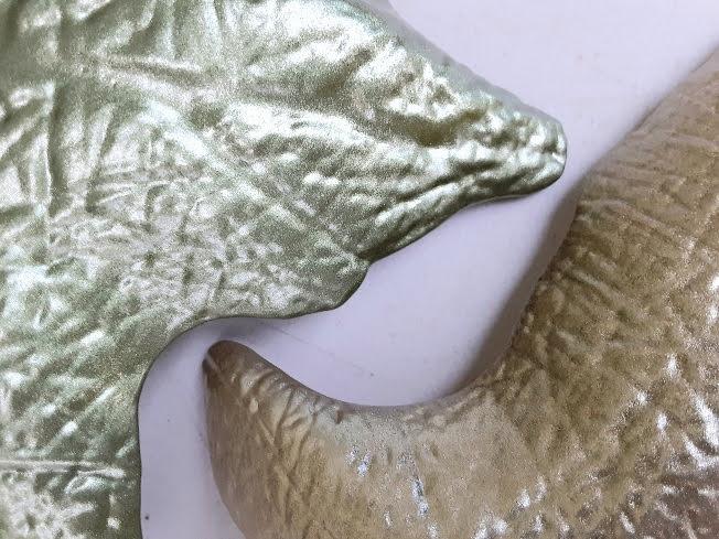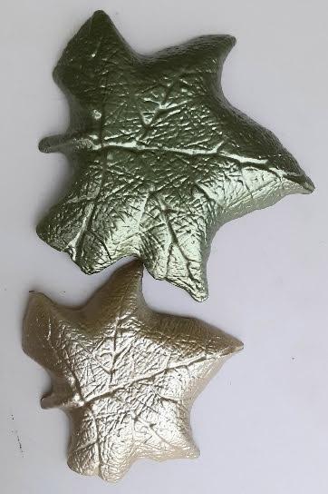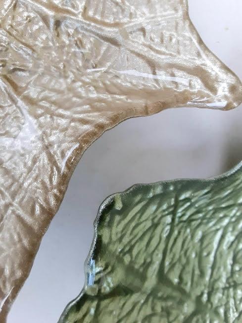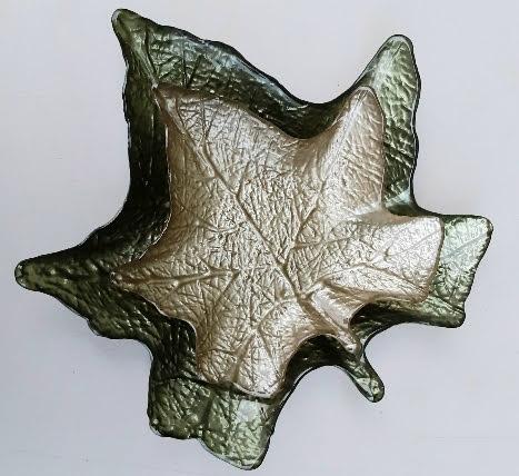 top is glass smooth and the back is textured. Large glass leaf is 11 by 11in. The small gold glass leaf dish is 8 by 8in.