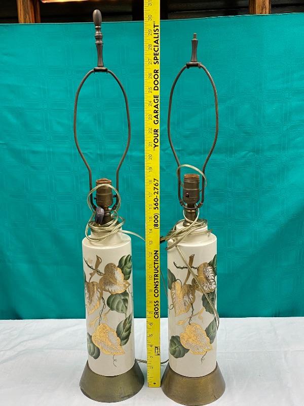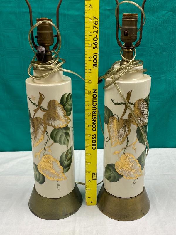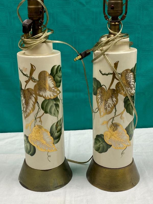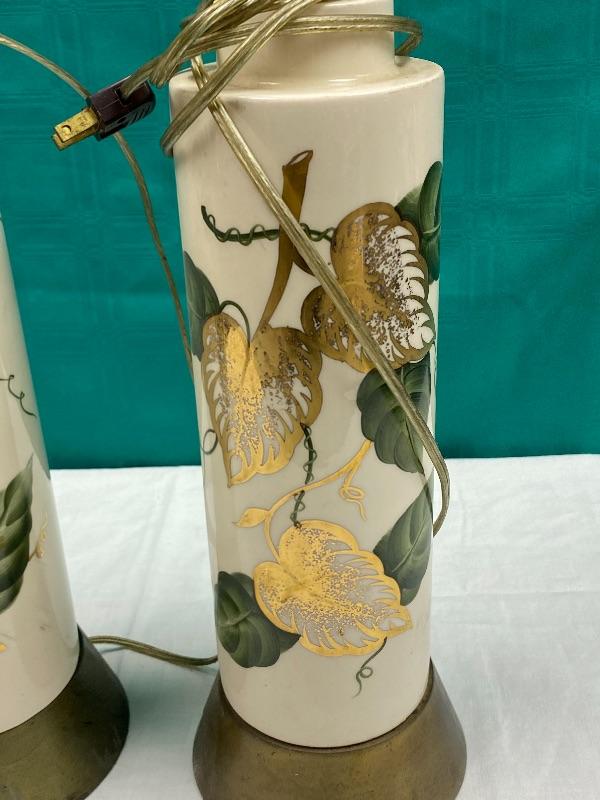 Beautiful green and gold ivy patterned table lamps. Vintage lamps has a brushed brass base with a ceramic body. Off white background with gold and green ivy leaves. Stand almost 19" at the light socket. Missing one finial and no shades.