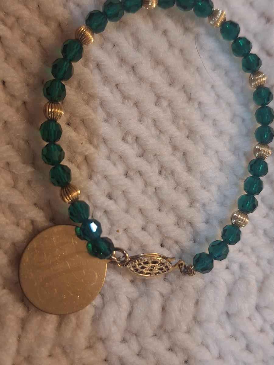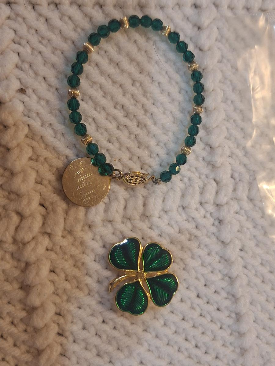 green and gold tone bracelet and lapel pin