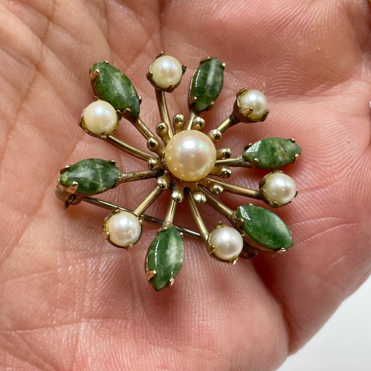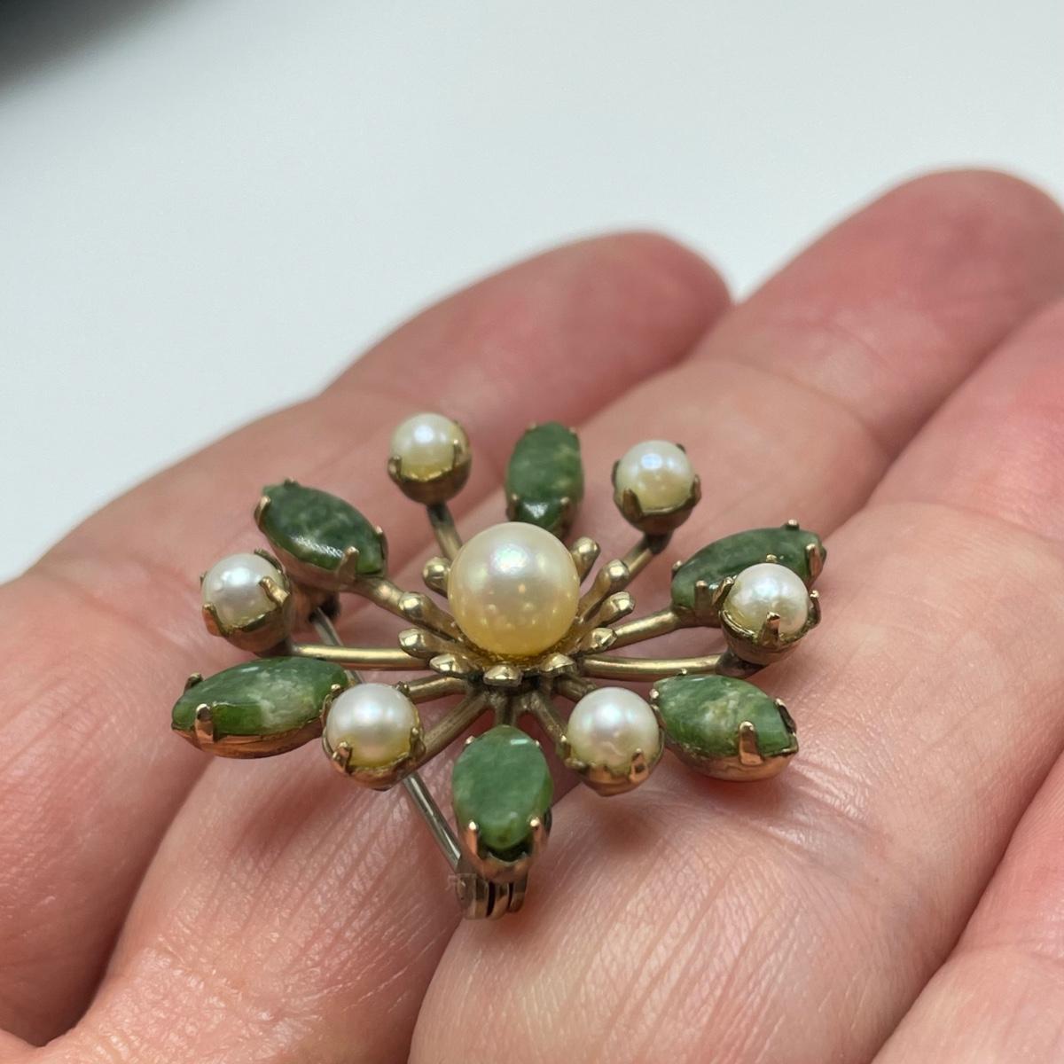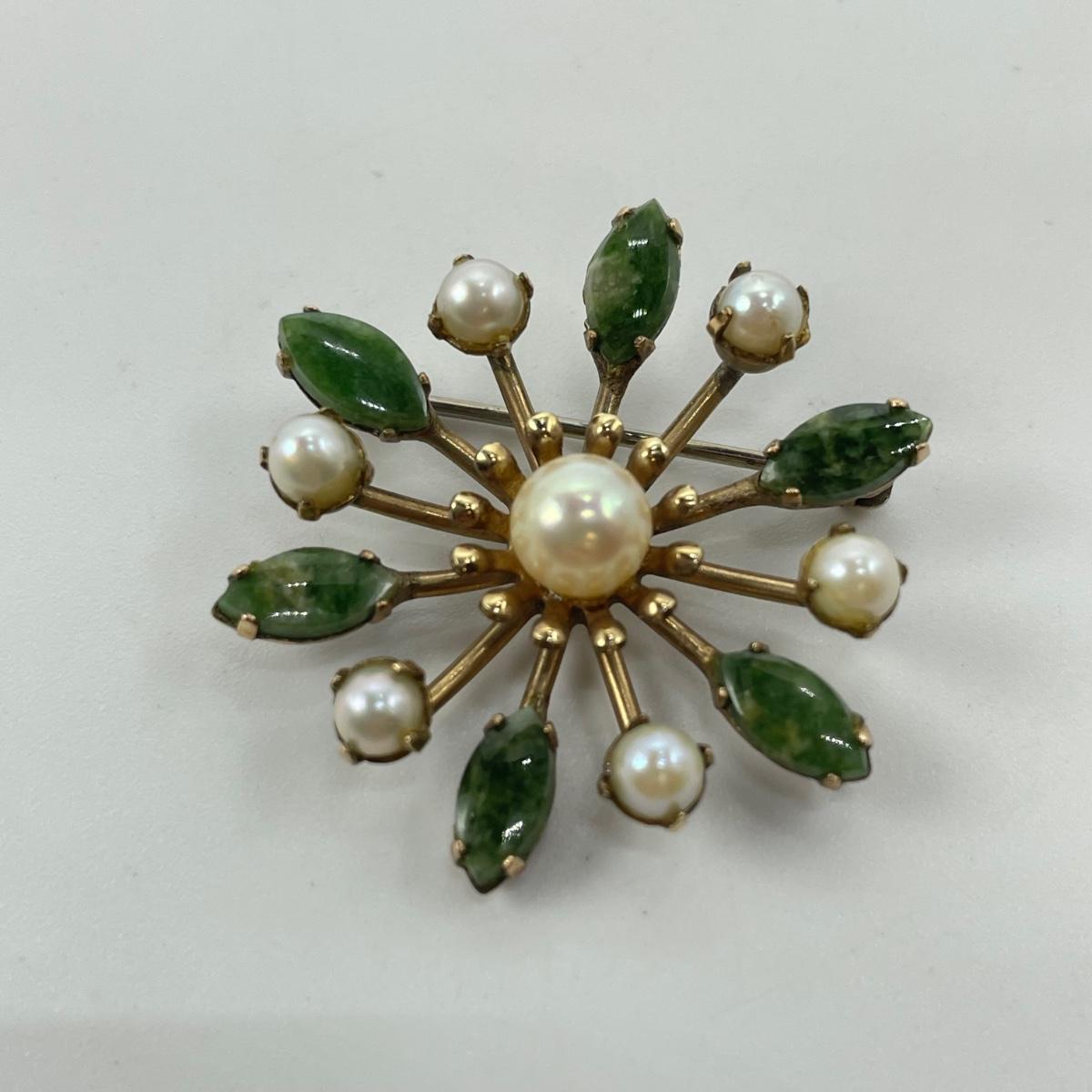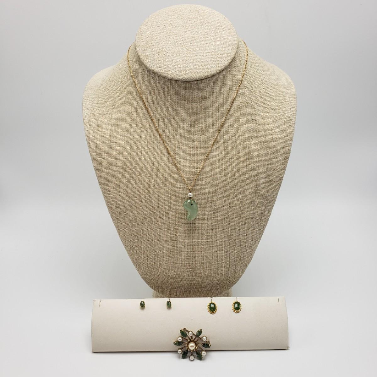 This lot features a green stone and pearly pin stamped with "4 Winard/12 K GF". The pendant is approximately 1 inch. The necklace chain measures 16" long and features a jade like stone with a pearly bead. There are 2 sets of post earrings. The larger green stone post earrings backs are stamped with "14K", as shown in picture. All sales are final. No returns or refunds. Please bid accordingly.