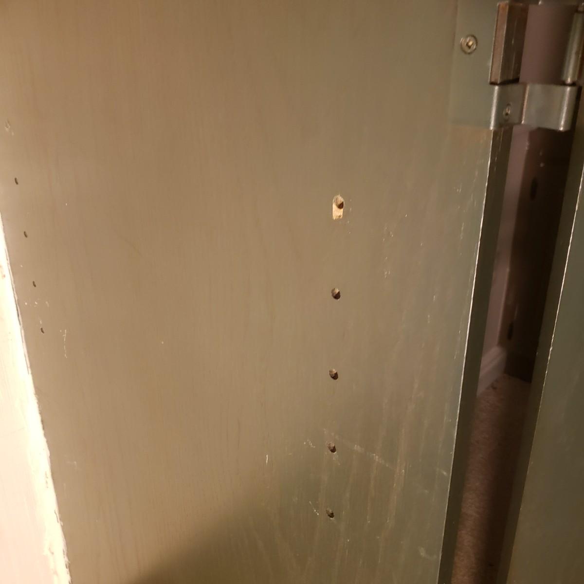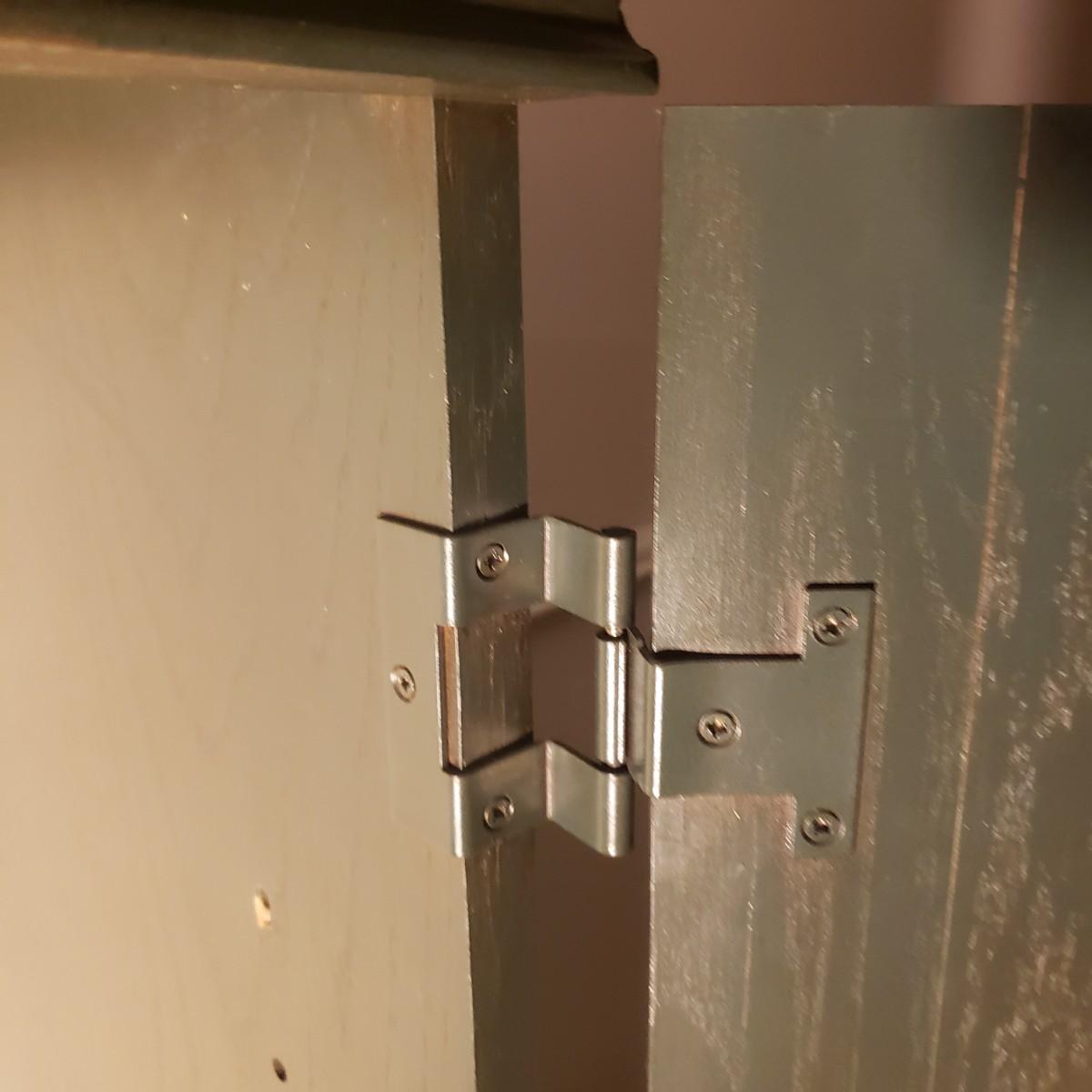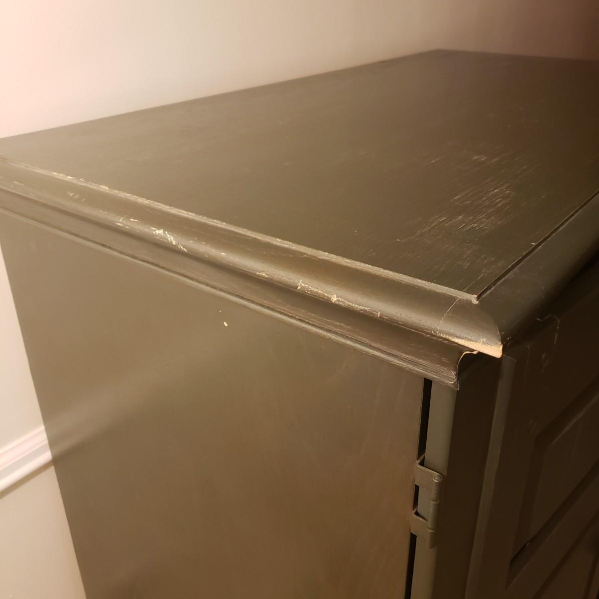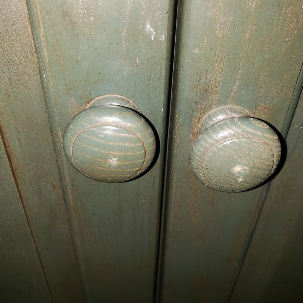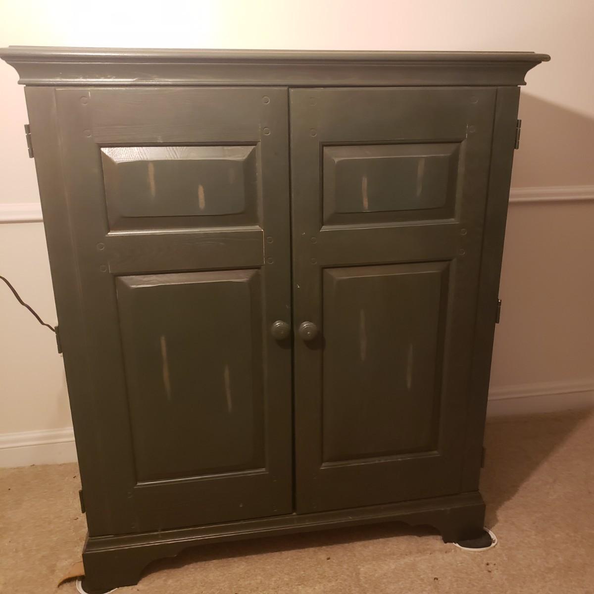 This a green armoire style TV cabinet. There is an adjustable shelf with two shelves underneath. The adjustable shelf is missing 2/4 of the shelf pins to hold the shelf up. The cabinet measures 43" x 23" x 50" H.