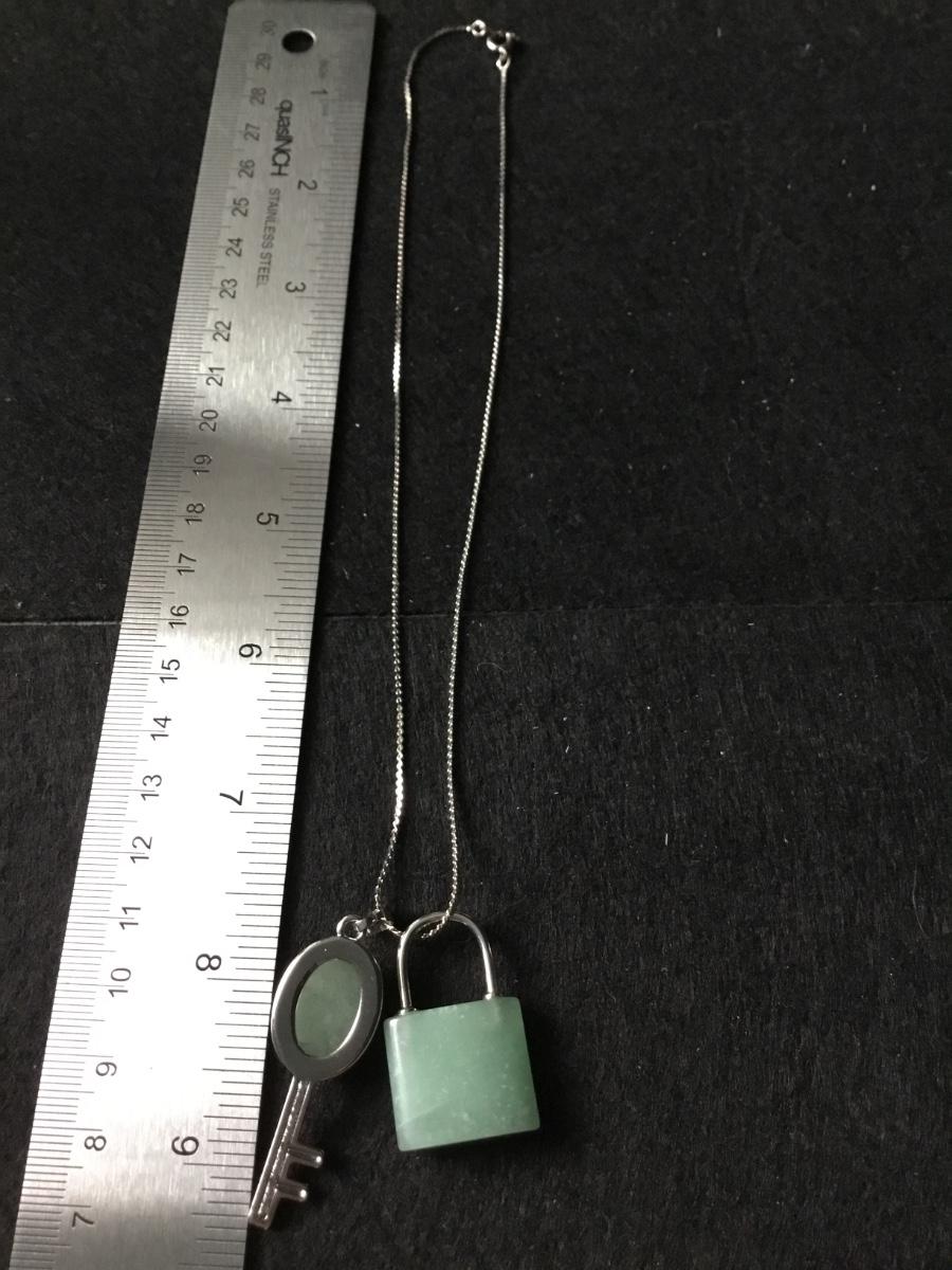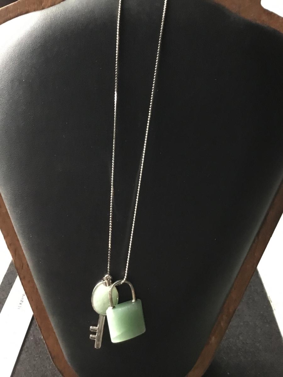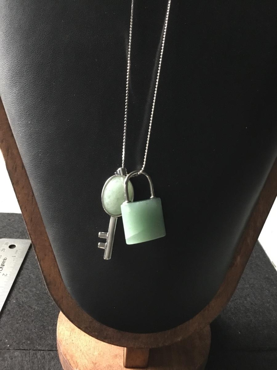 Green aventurine set of lock and key pendant silver tone