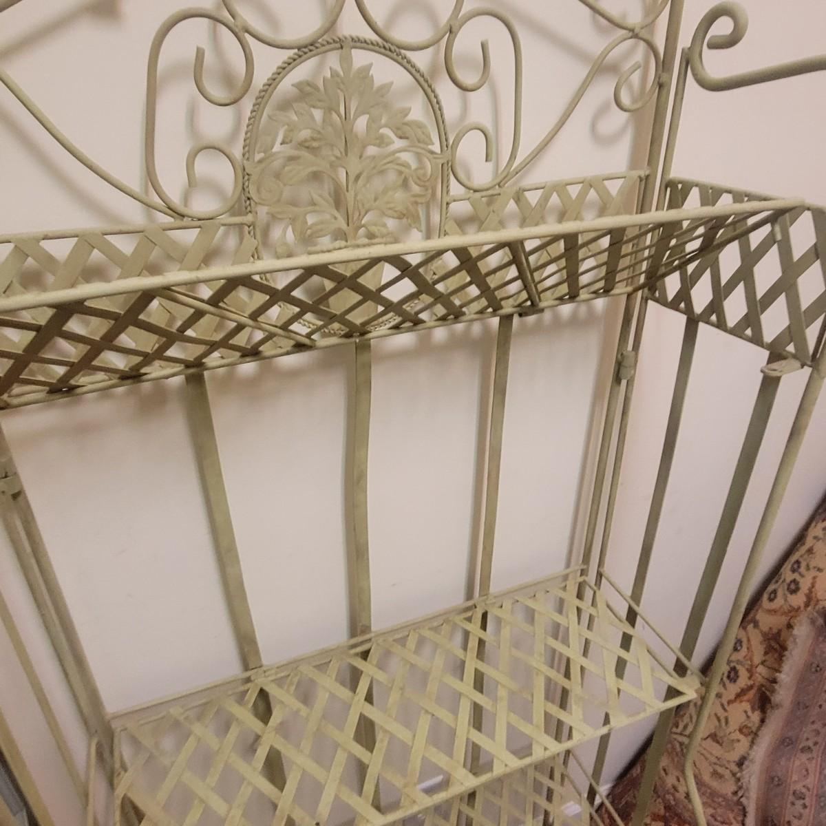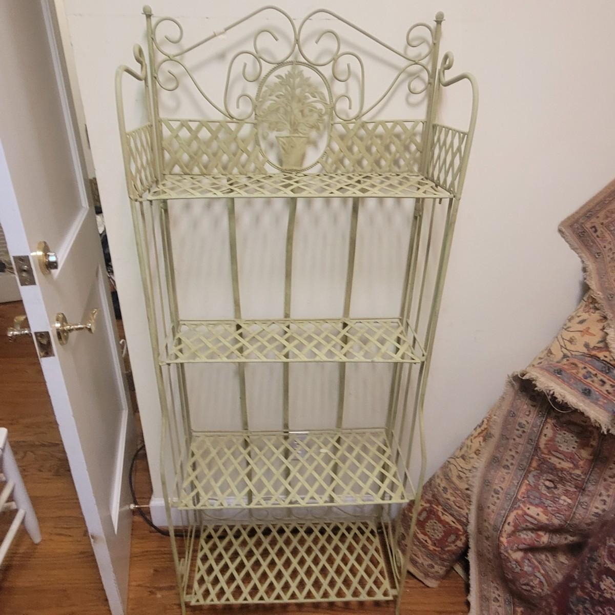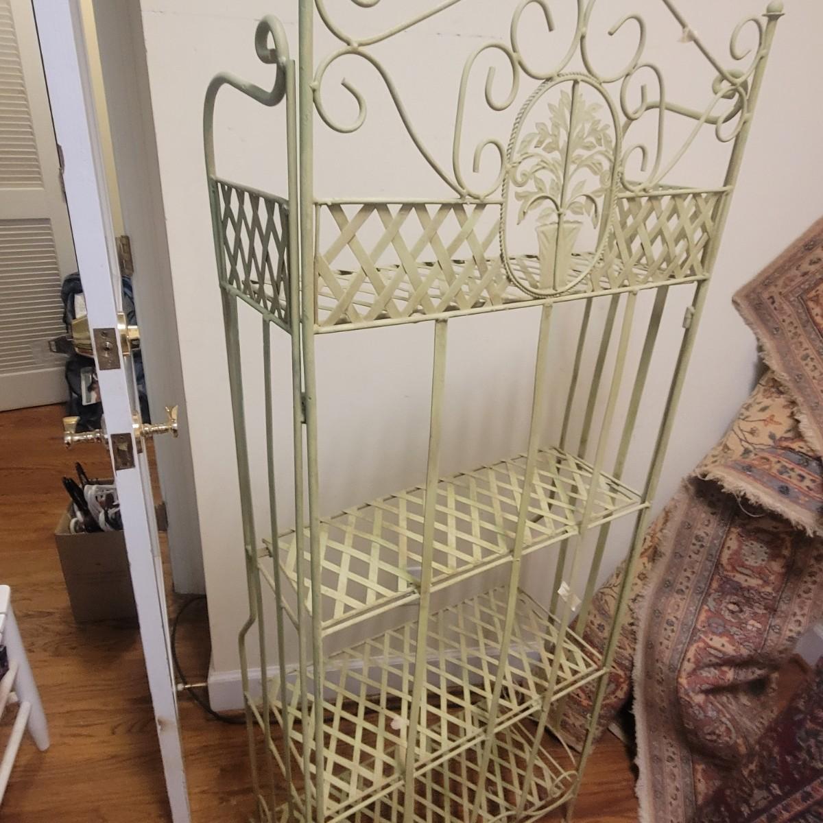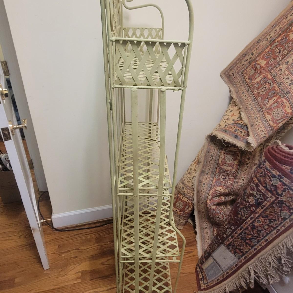 Metal baker's rack with woven styled shelves. Shelves fold up so that the entire rack can be stored conveniently. Measures approximately 24" x 8.5" x 60". Local pickup only