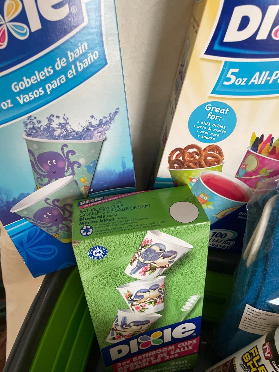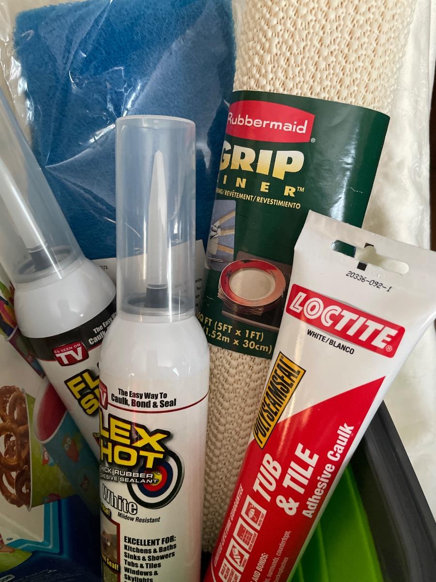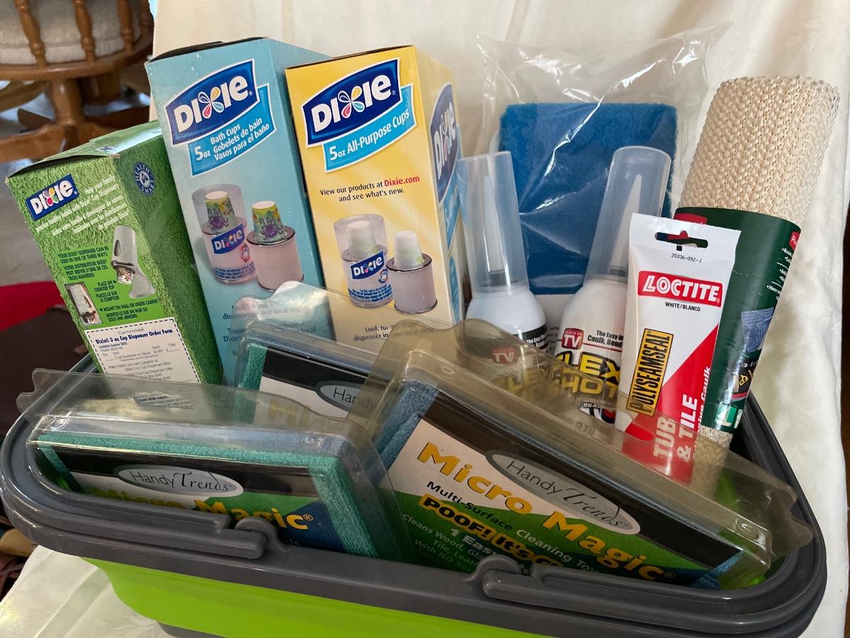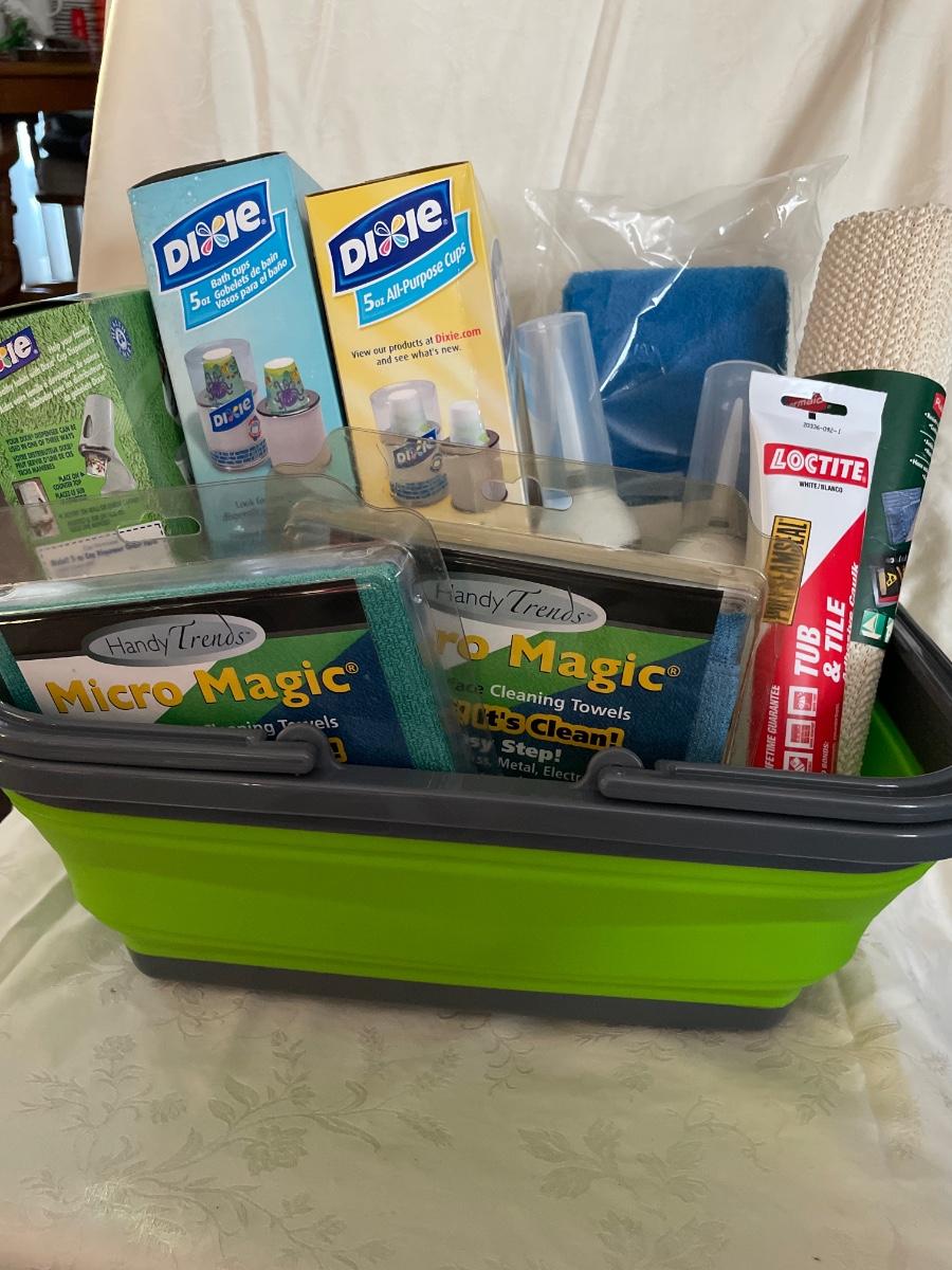 Collapsible green basket with Dixie cups, new Flex shot in white and black, Micro Magic towels, Tub & Tile, Grip liner & Blue Black Scrubber