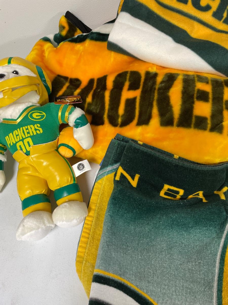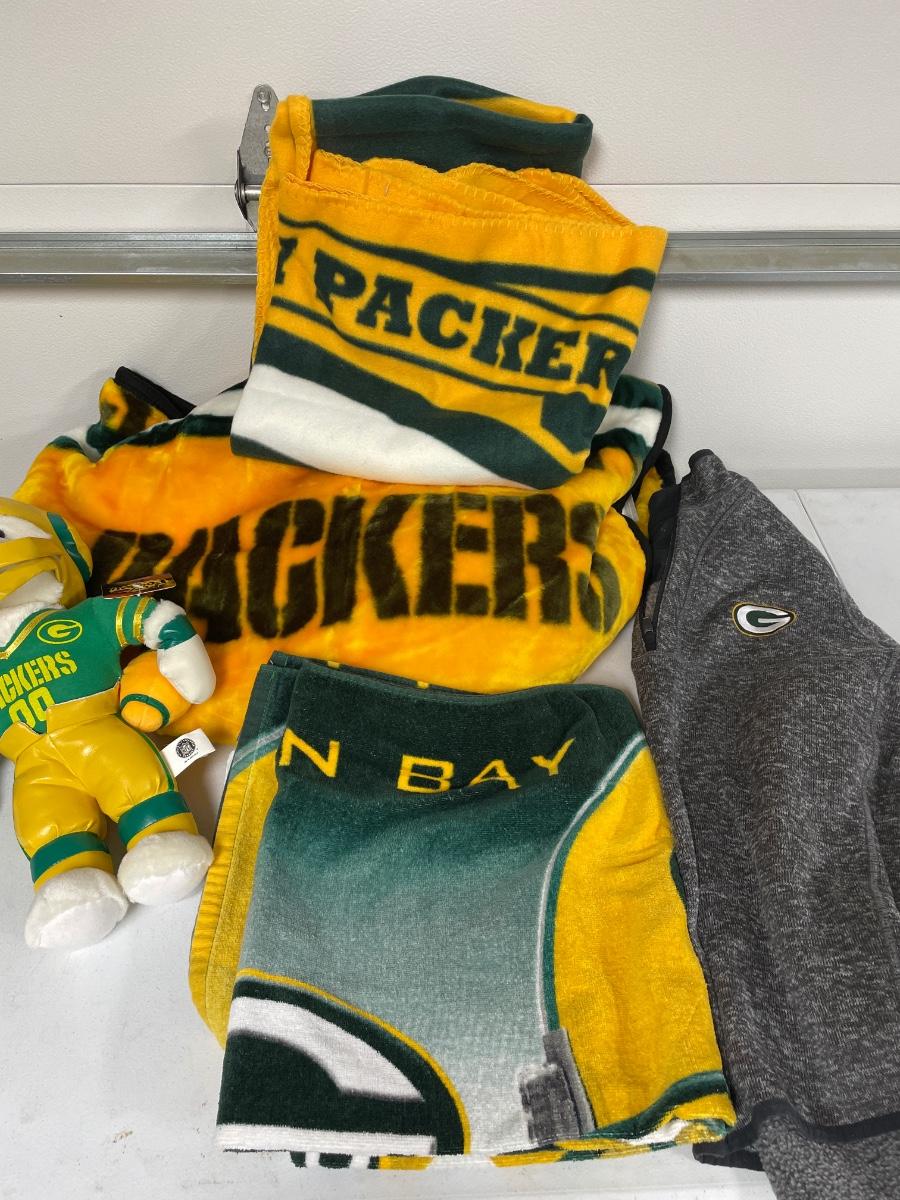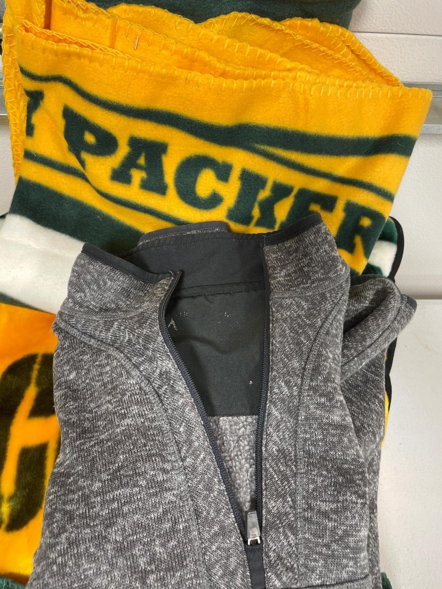 One large blanket, smaller, throw, tall, beach towel, and pullover appears to be size large
