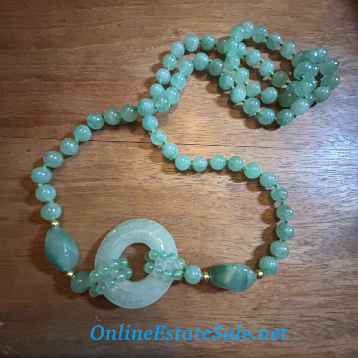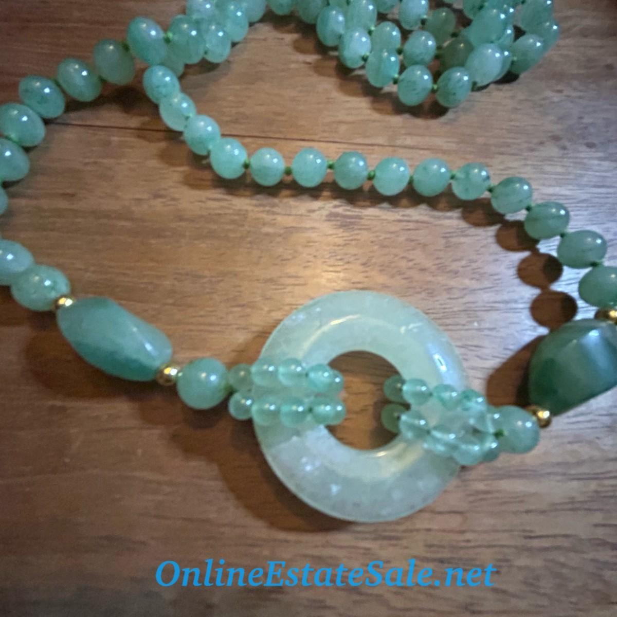 30in Light Green Glass Beaded Necklace with Round Pendant and Gold Accent Beads