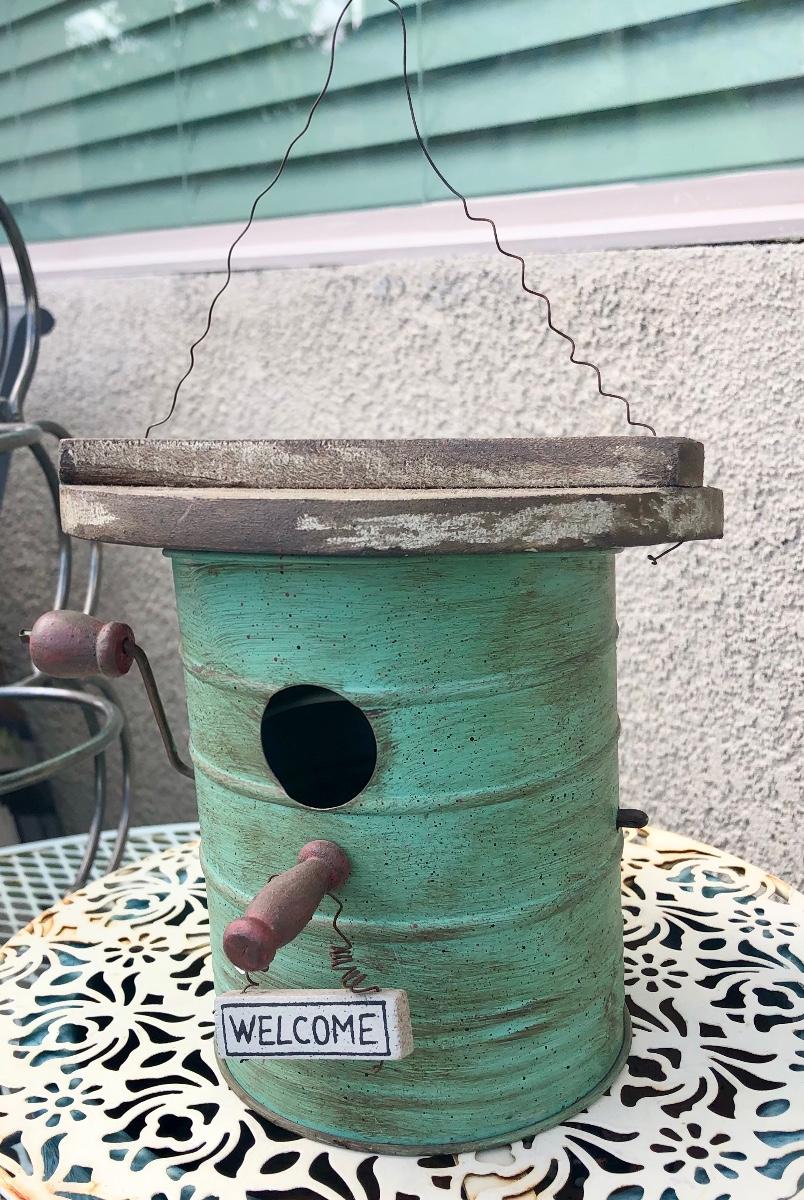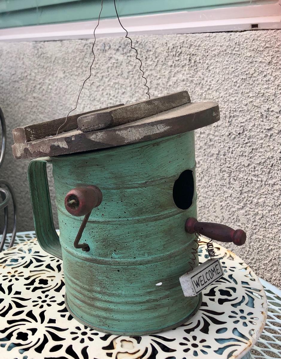 This charming 8” birdhouse is crafted out of a tin flour sifter. Painted sage green, it can hang on a branch to feed birds, or just look cute in the garden. 🦆…