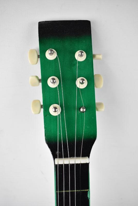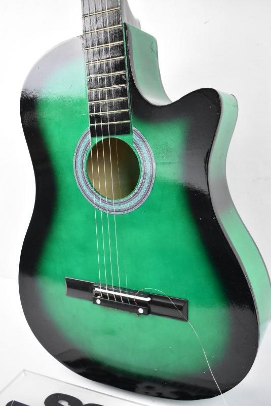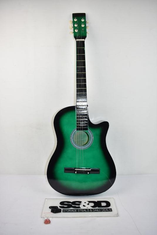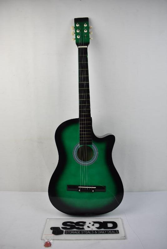 Green & Black Acoustic Guitar. 1 string head needs repair
