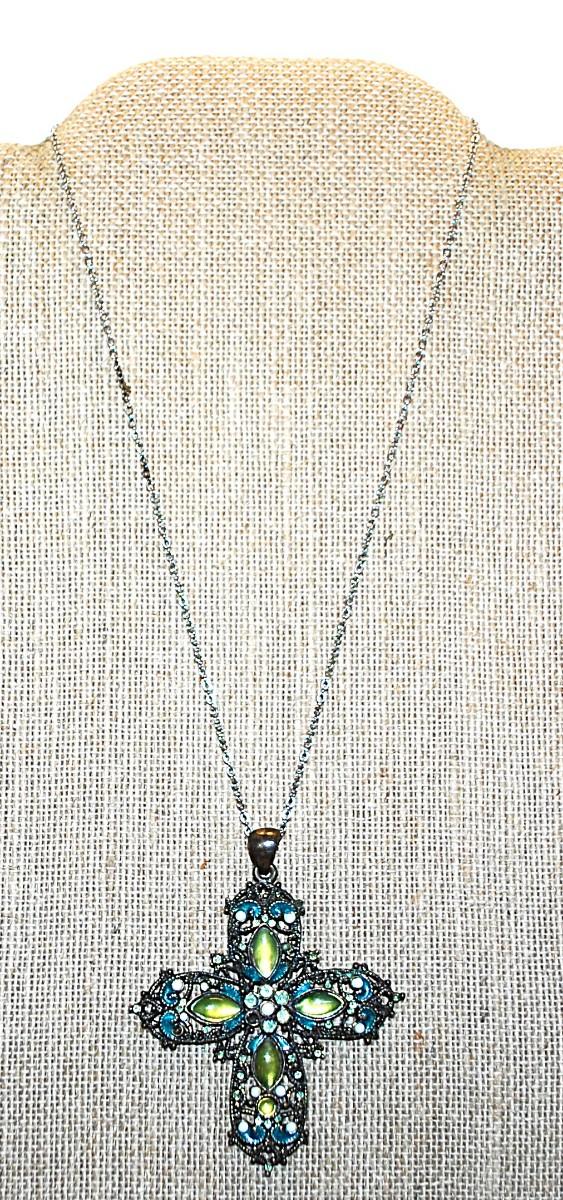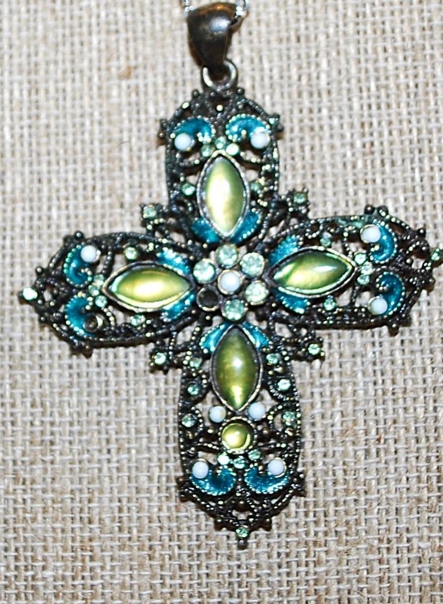 Green, Blue & White Enamel Jeweled CROSS/PENDANT (2½" x 2") on a Silver Tone Necklace Chain 16" L
