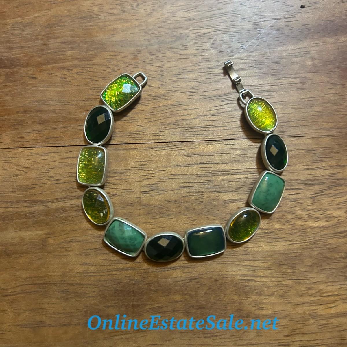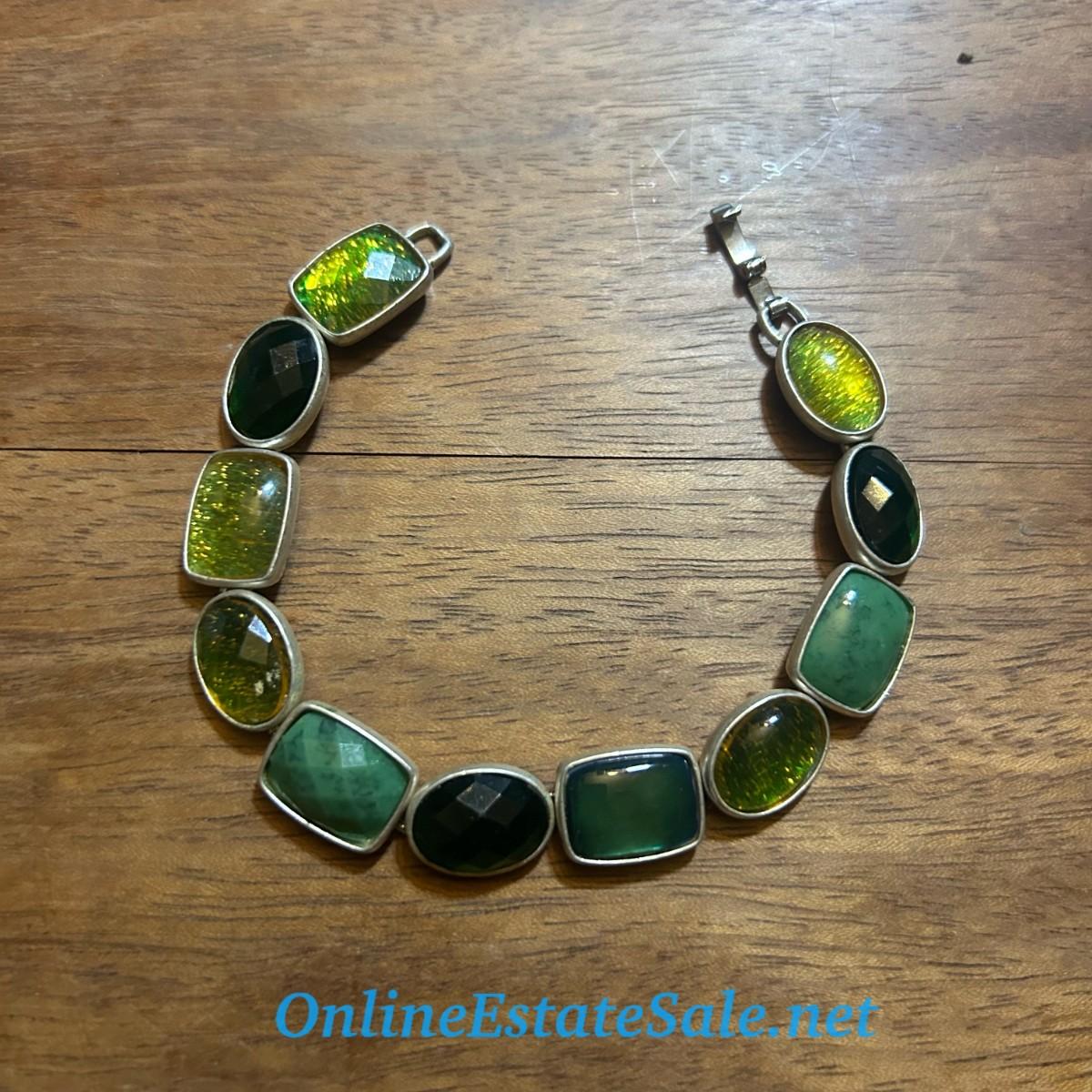 7in Green Stone Pattern Bracelet with Silver Colored Setting with Fold-Over Clasp