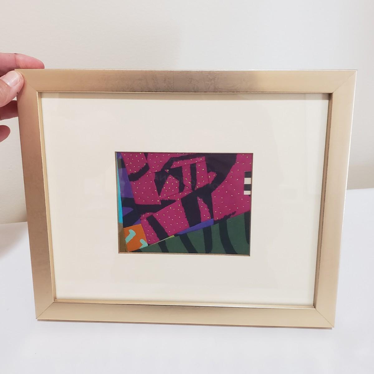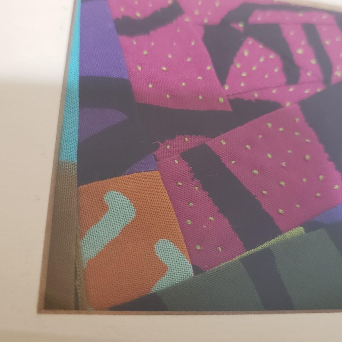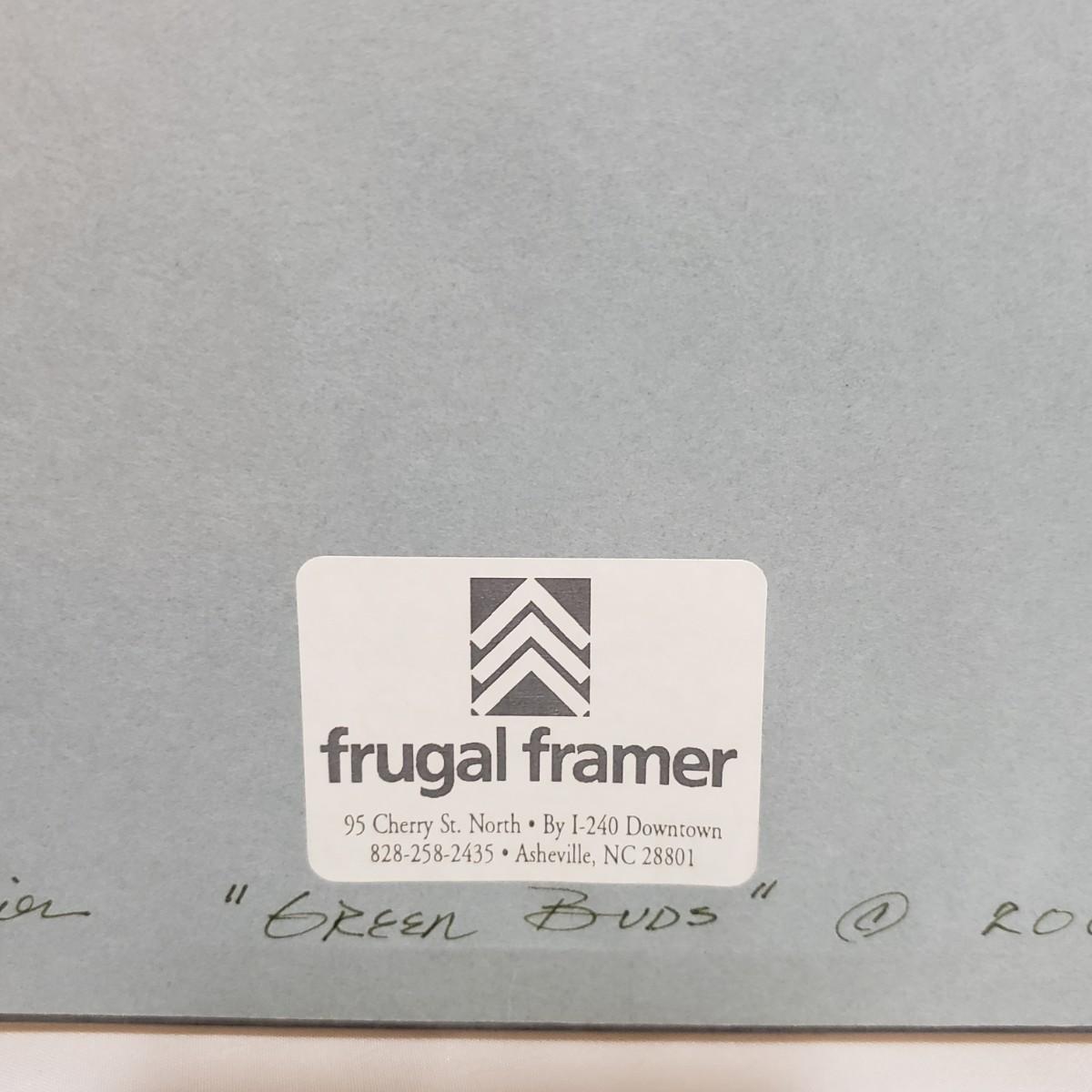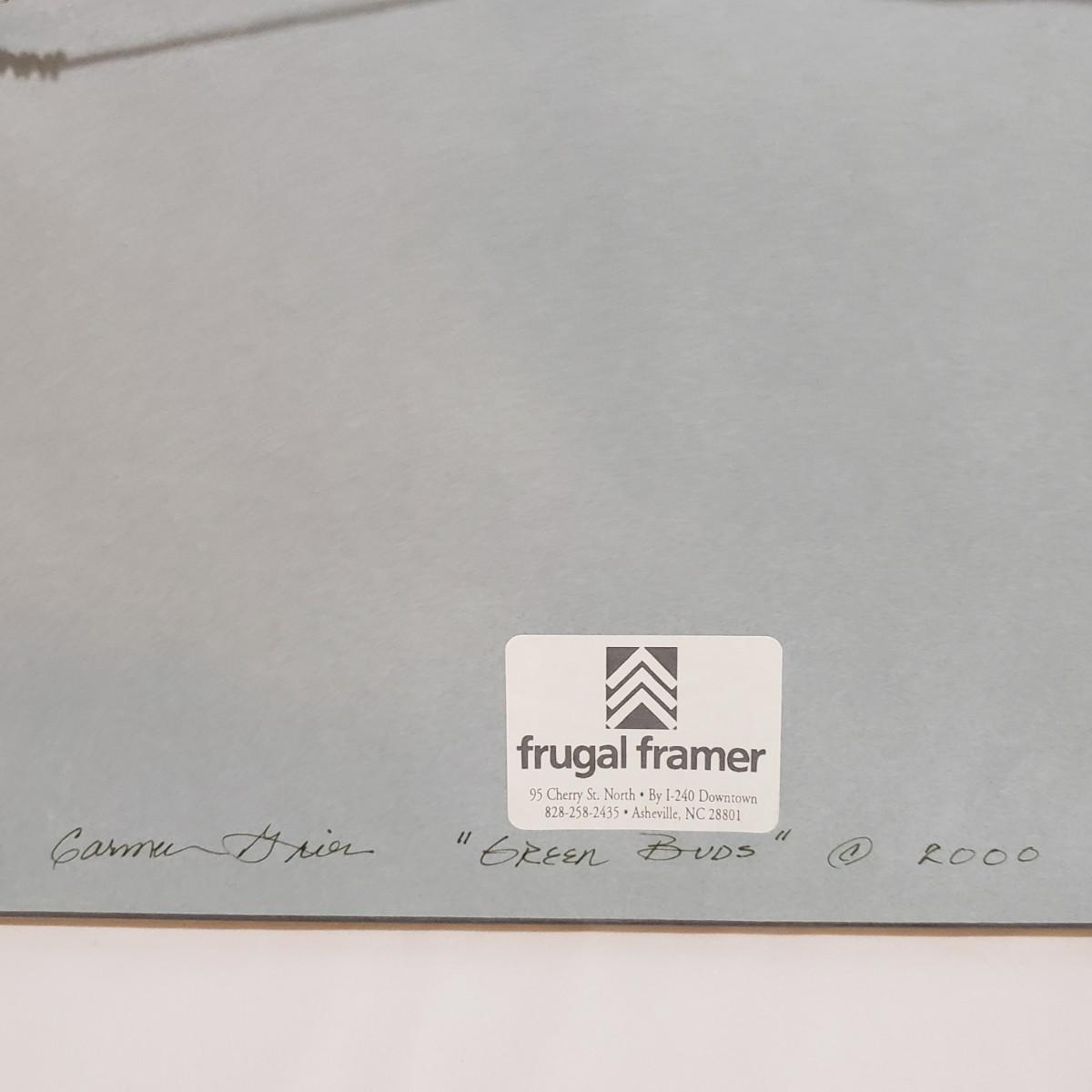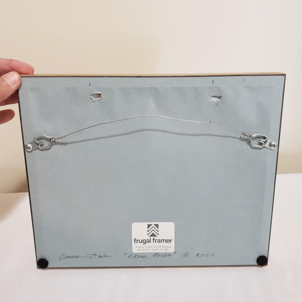 This wooden framed, matted behind glass piece appears to be by Carmen Grier. The piece is titled "Green Buds". The material appears to be a fabric quilting and measures 11" x 9".