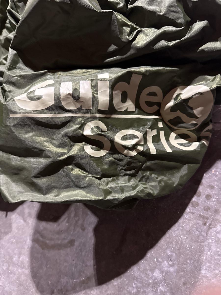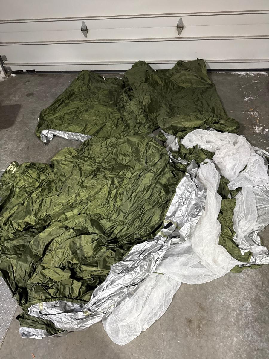 Green camping tent.. Not sure on size but it Looks like at least a four person tent.