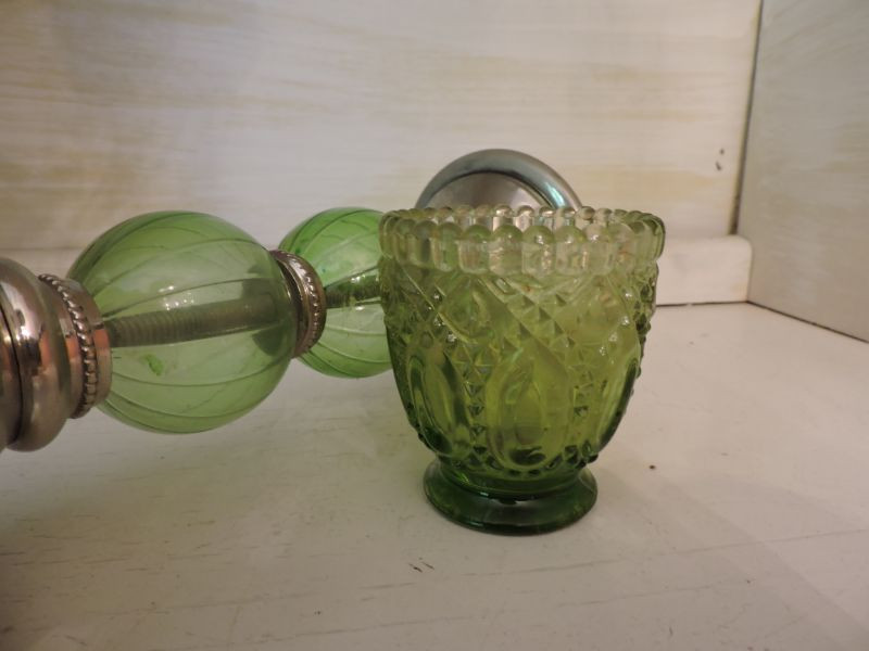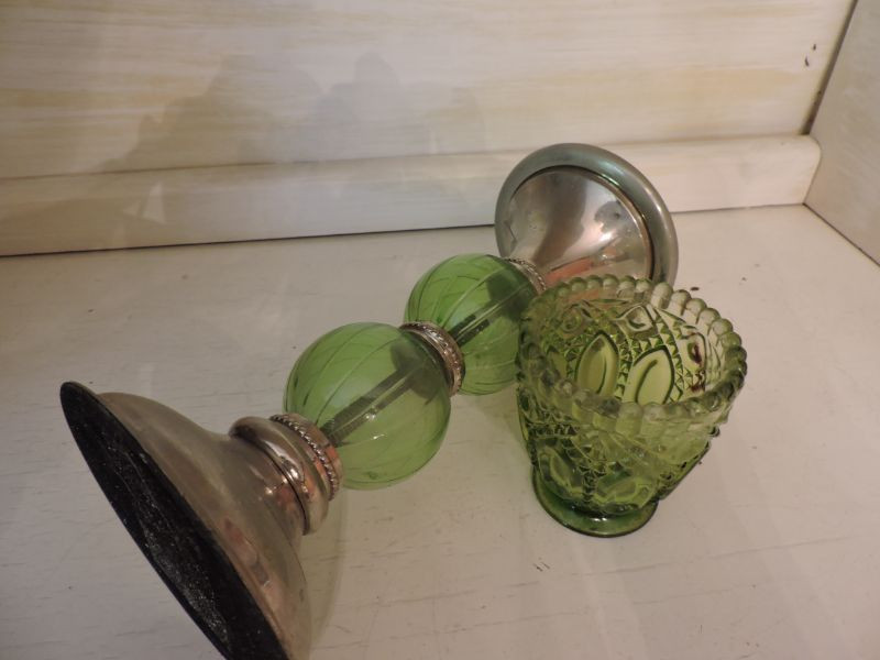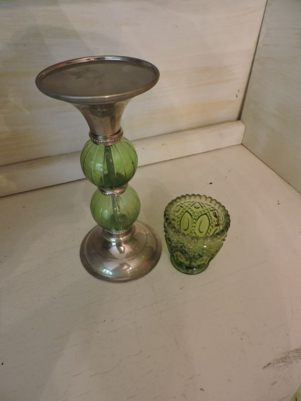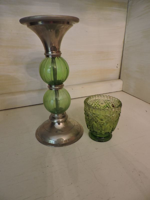 Green glass and silver candlestick and green cut glass votive. Candlestick is 8”.