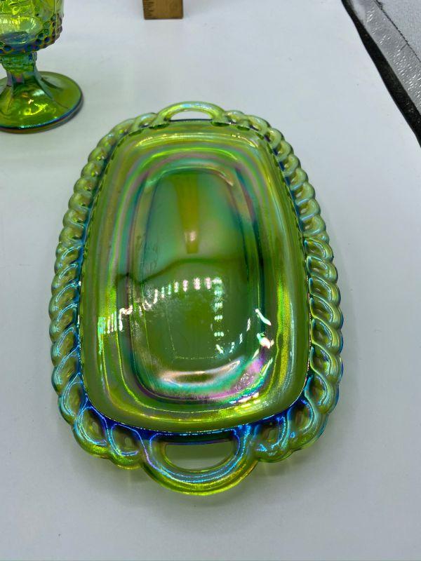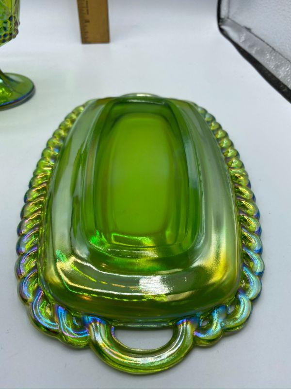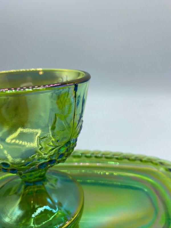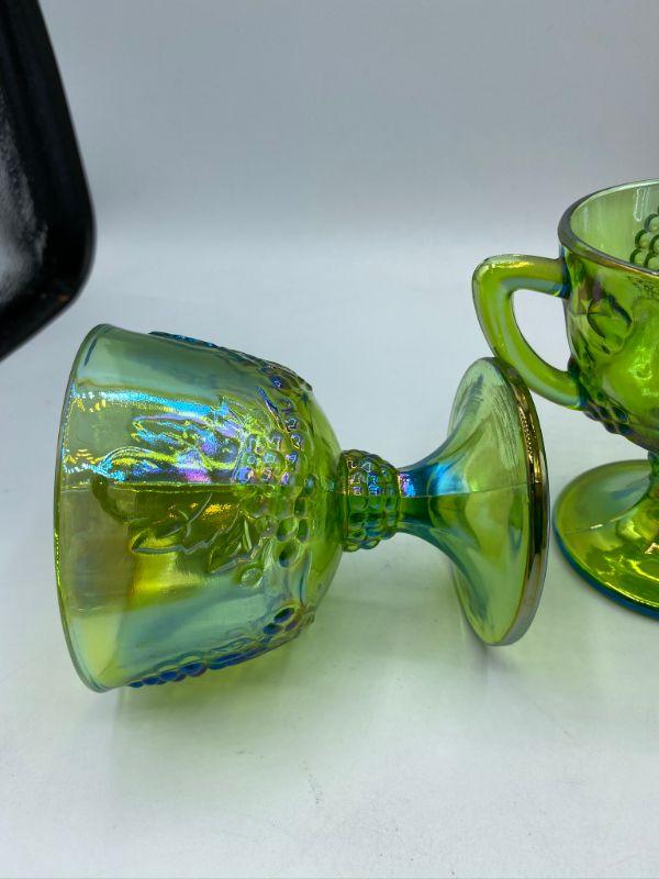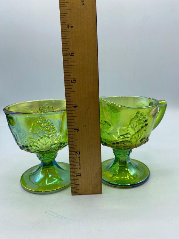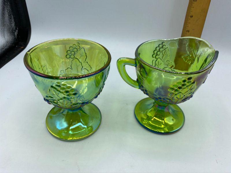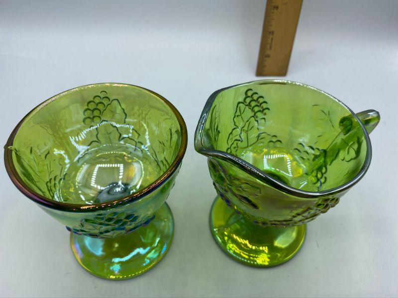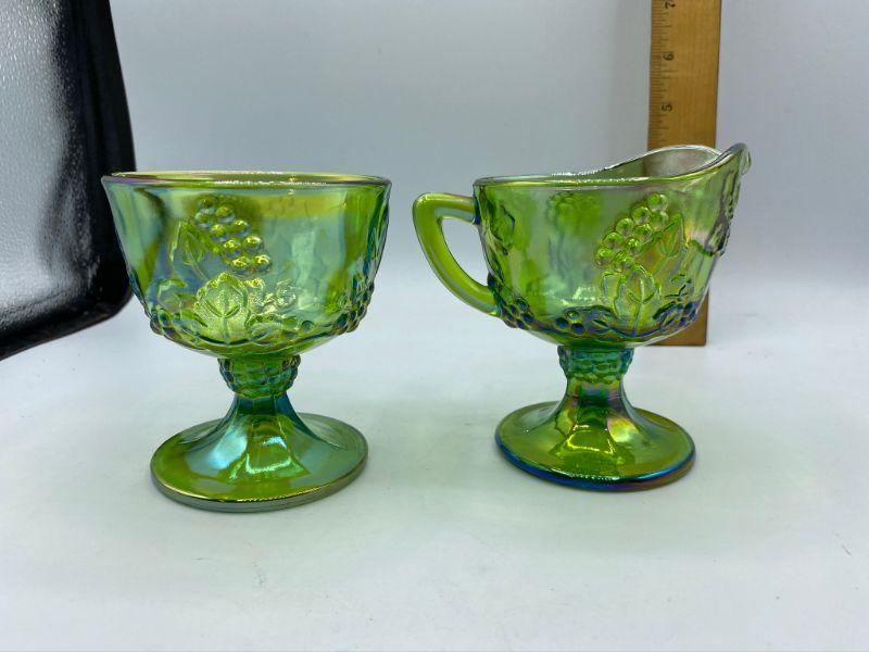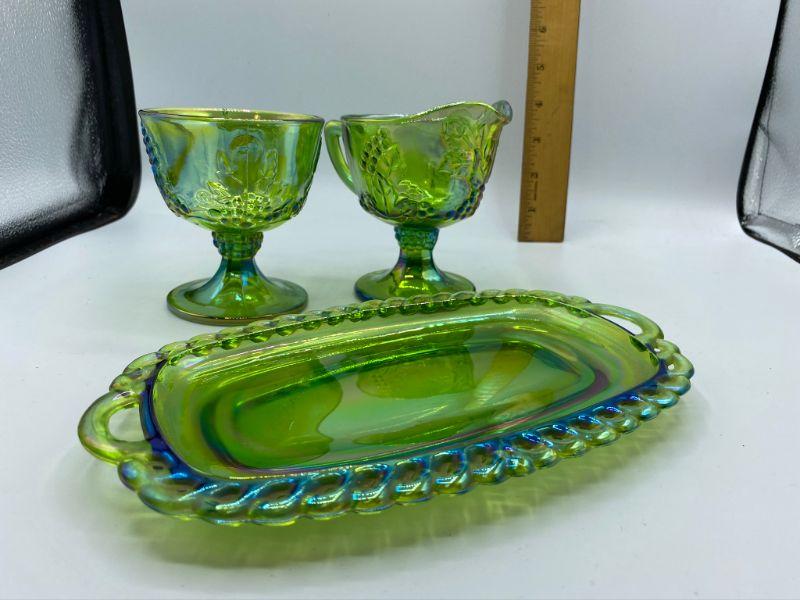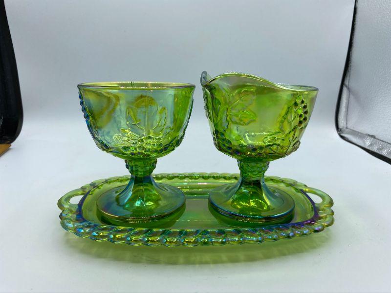 Beautiful green carnival glass butter plate and cream & sugar set. Different patterns. The butter plate has a lace edge. Cream and sugar set are Harvest Grape patterned. From looking online the pieces are commonly together. All pieces are in good condition, no chips. There is a rough seam in the creamer set.