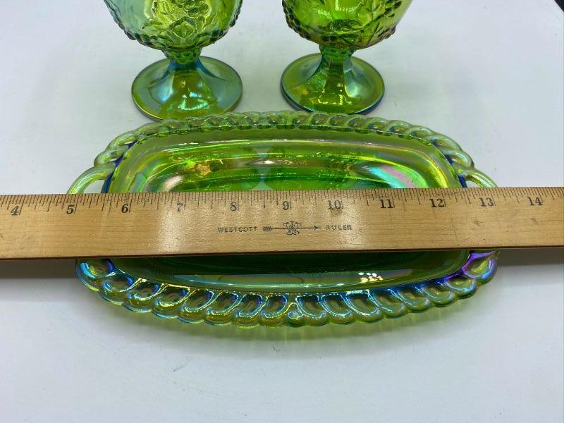 Green Carnival Glass Creamer, Sugar, and Butter Plate