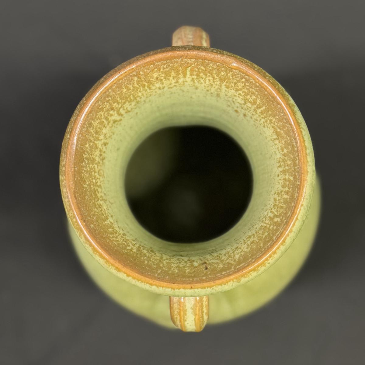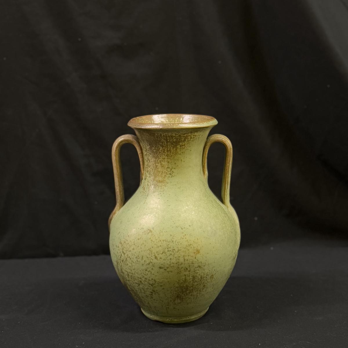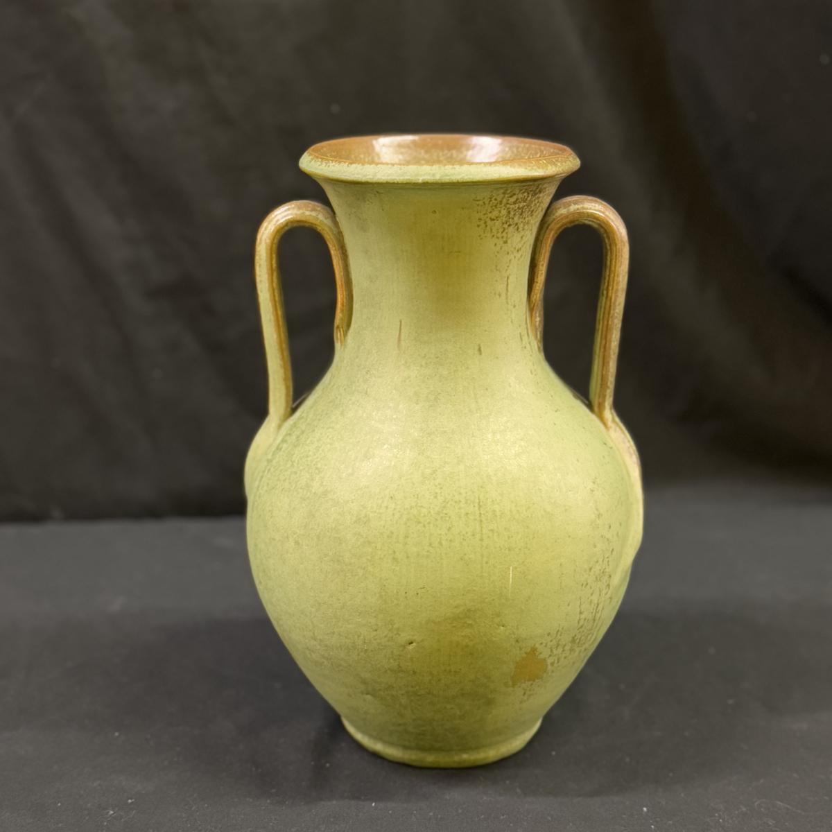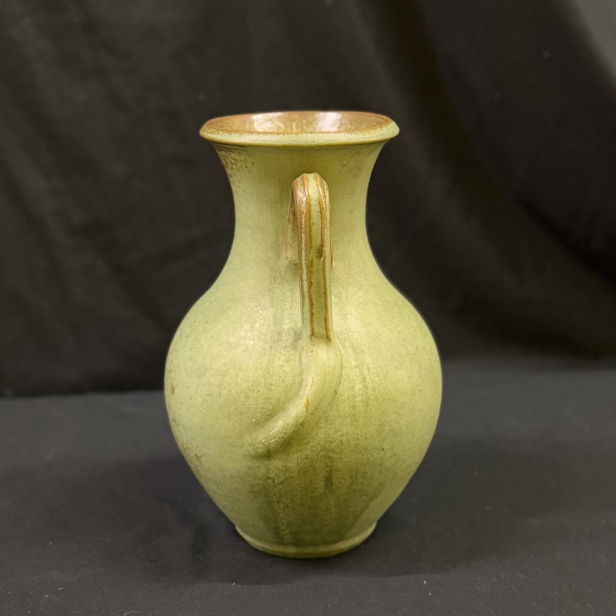 Lot includes one medium-sized green ceramic vase with a handle on each side. The vase measures 6” x 10”H. Shipping available.