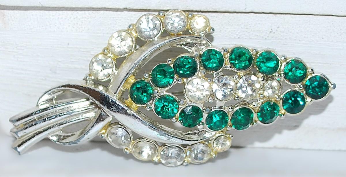 GREEN & CLEAR Stones "CORN STALK" BROOCH (2½" x 1⅛") on a Silver Tone Setting