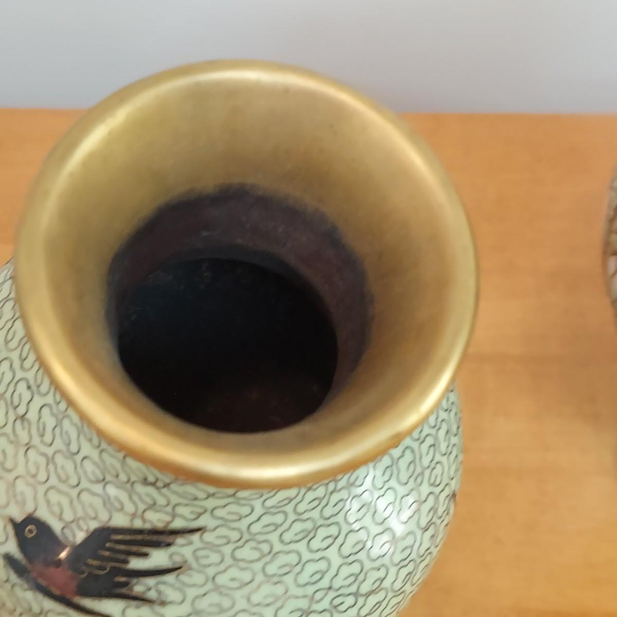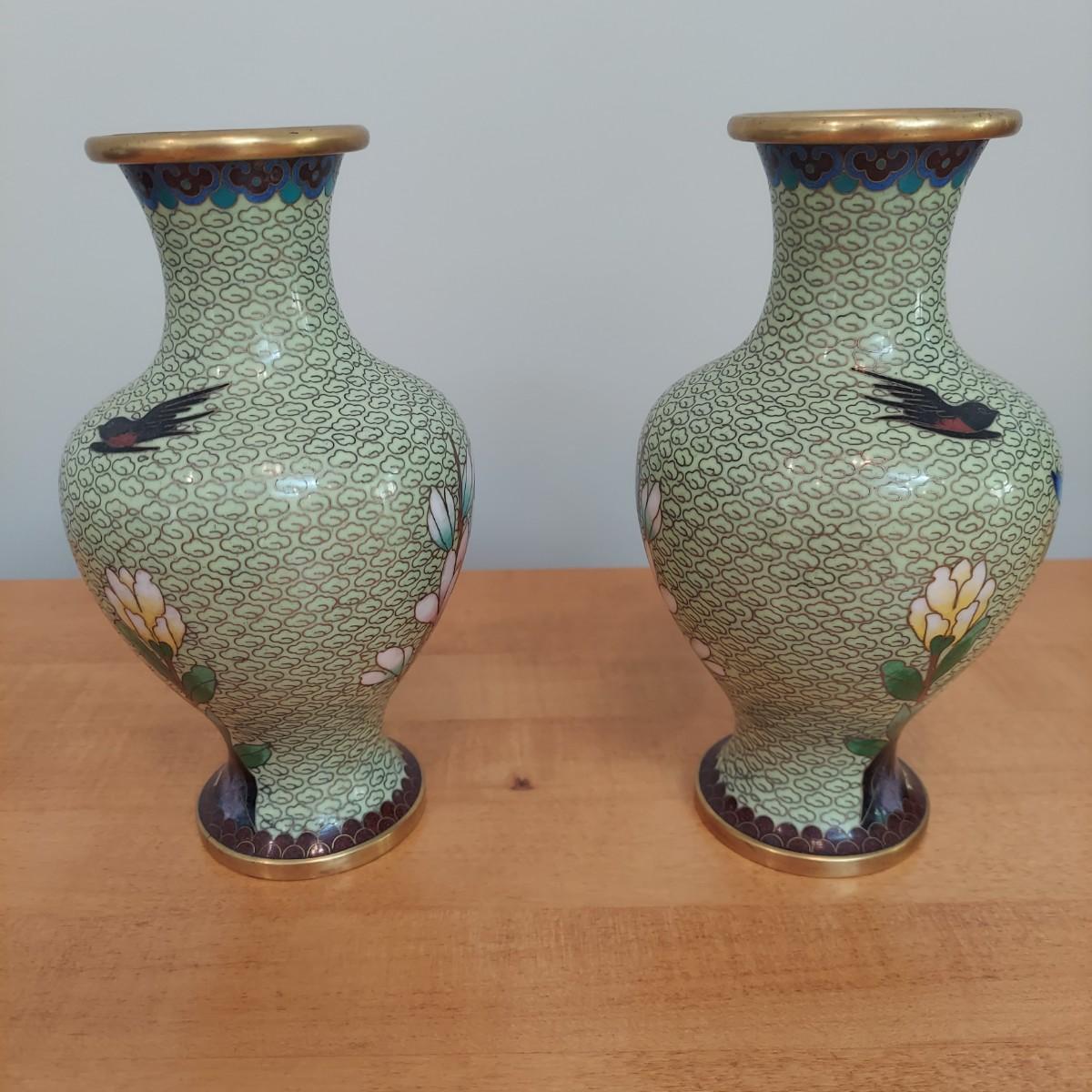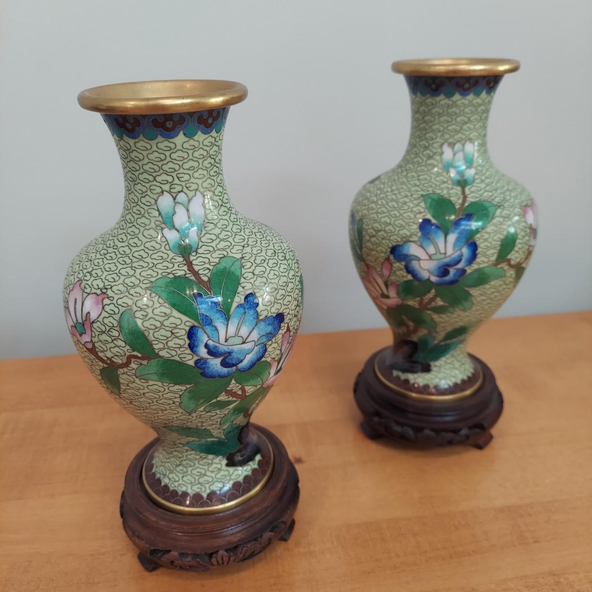Two metal vases that appear to be a Cloisonne style with two wooden stands. Vases are 7.5”H without wooden bases. Please see photos for details. Shipping available.
