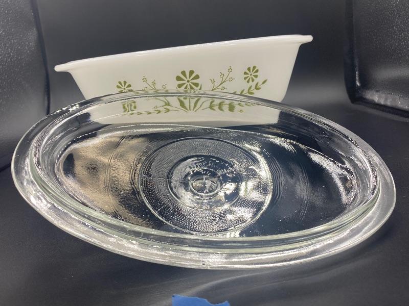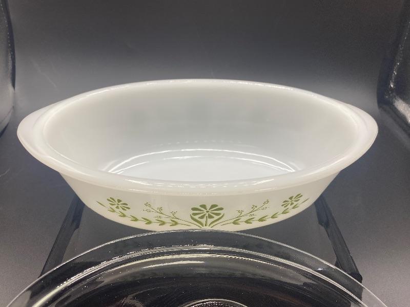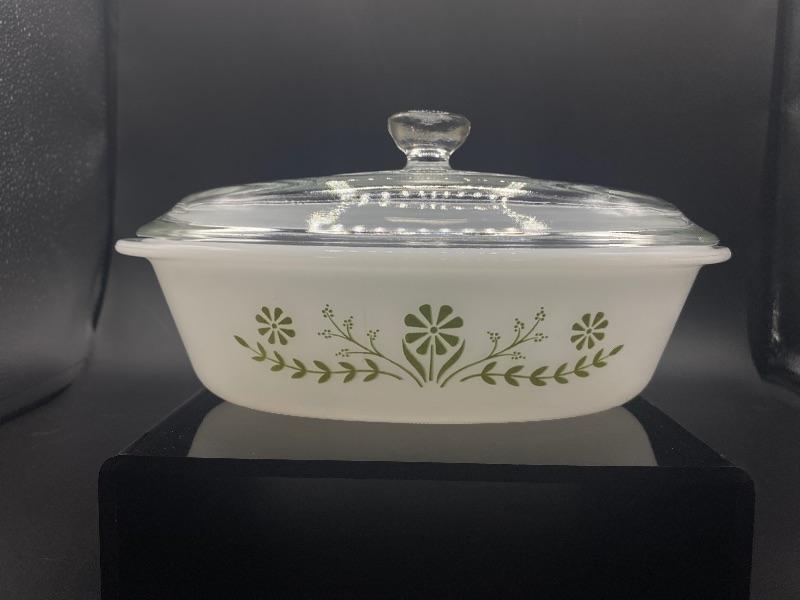Oval Glasbake casserole dish with lid. Green daisy flower pattern. 1qt size. Good Condition.