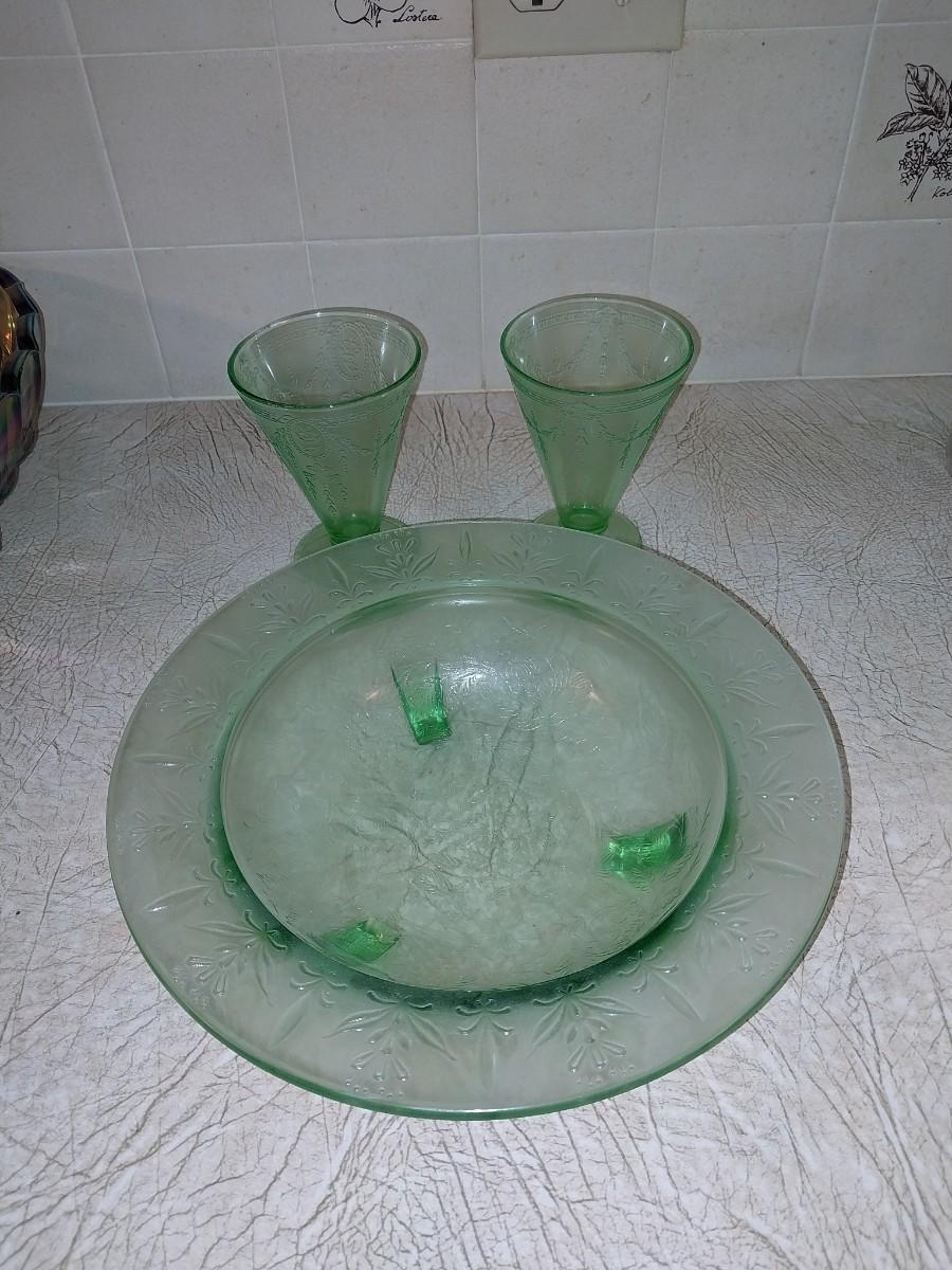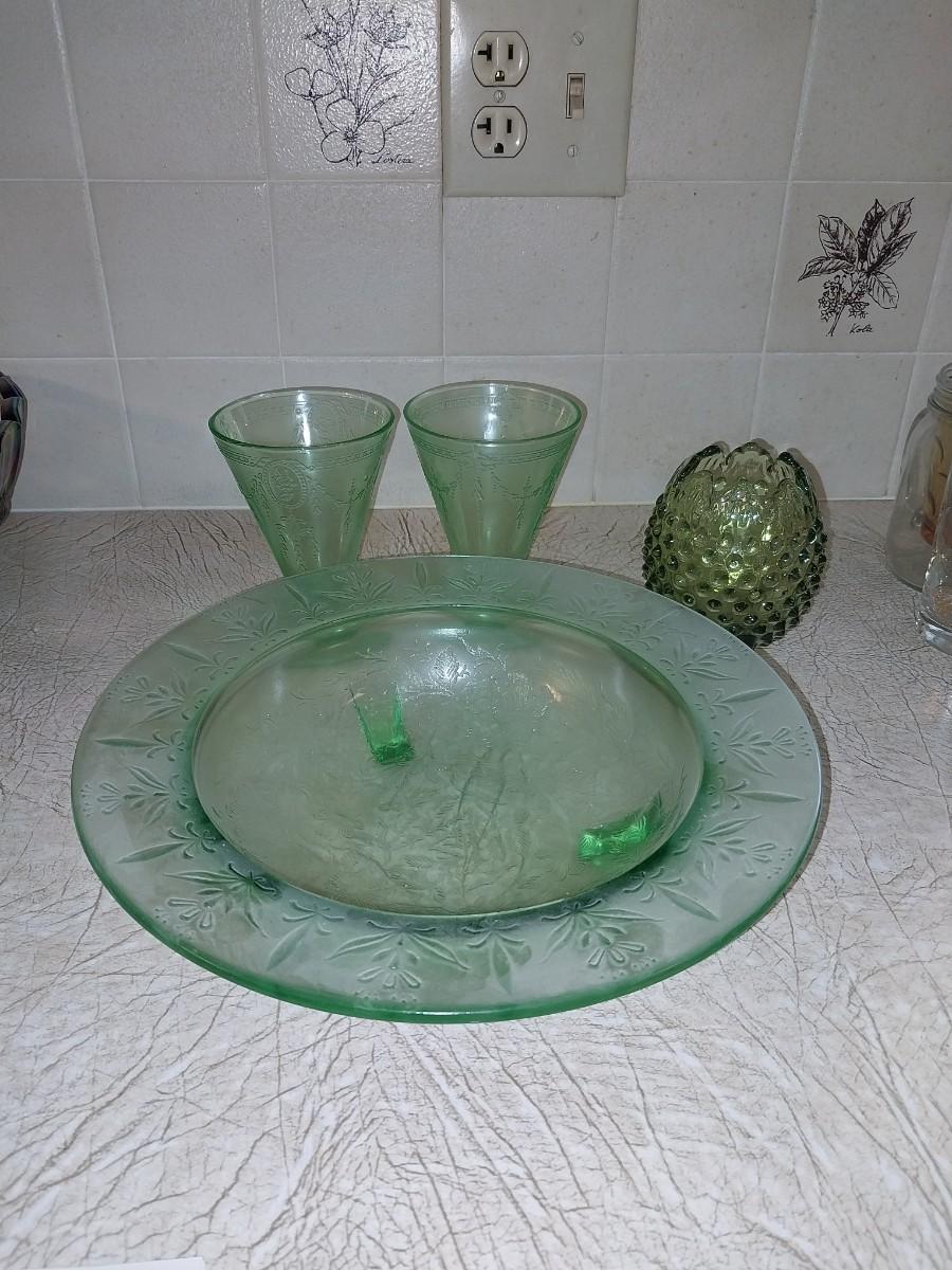 GREEN DEPRESSION AND GREEN GLASS DISH