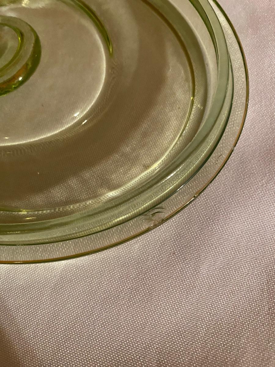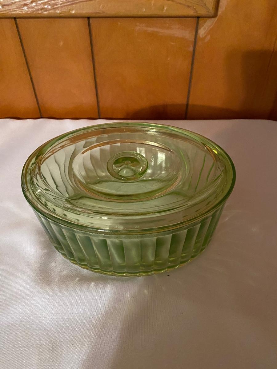 Green depression glass covered server. One small chip on the inside of the lid - see photo