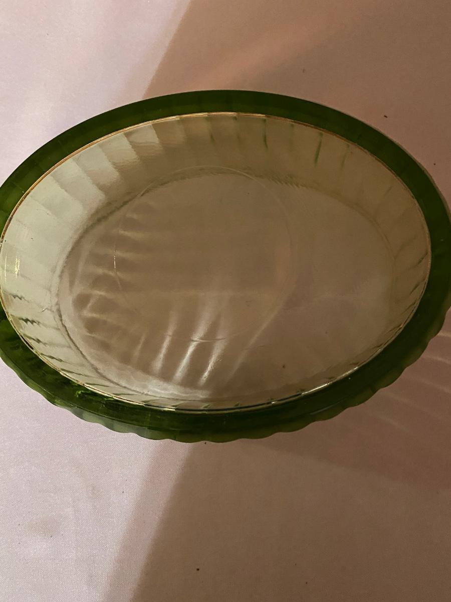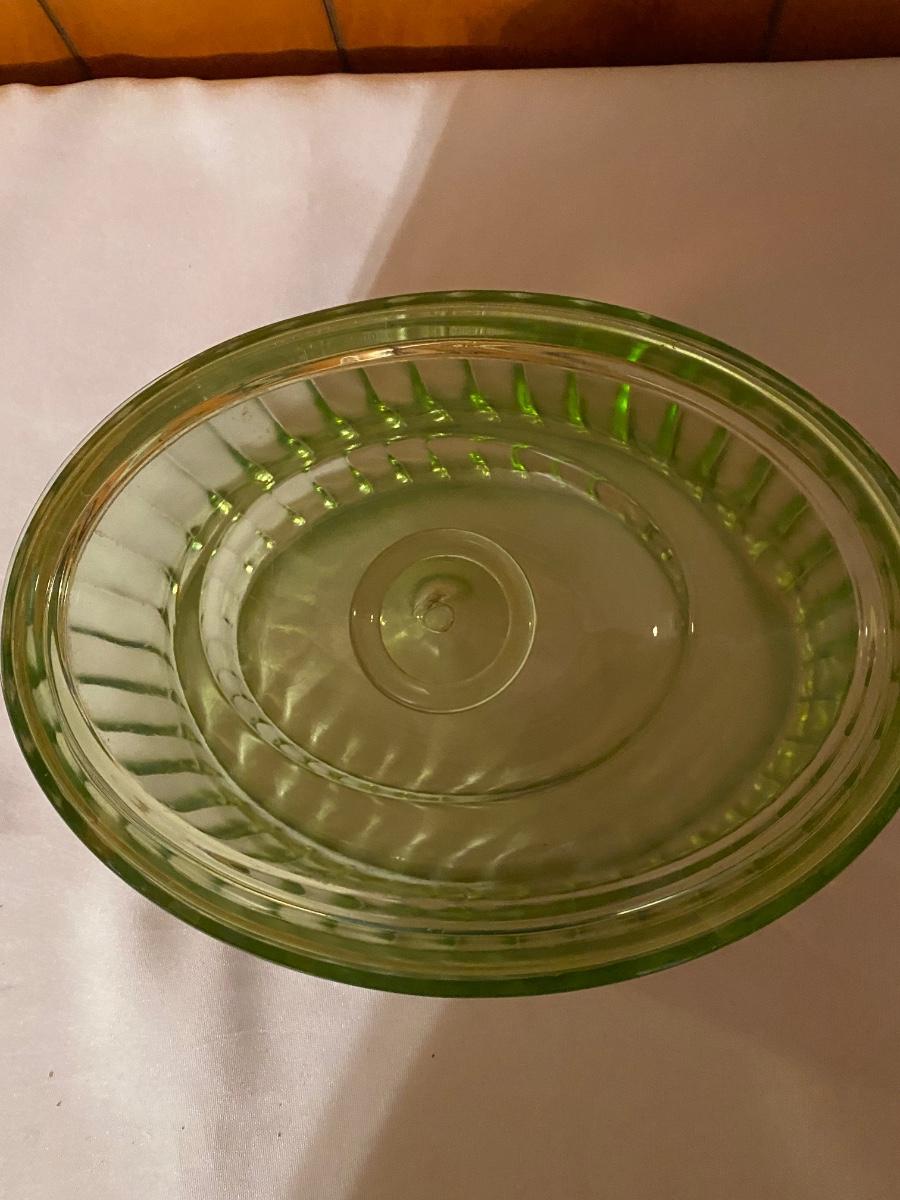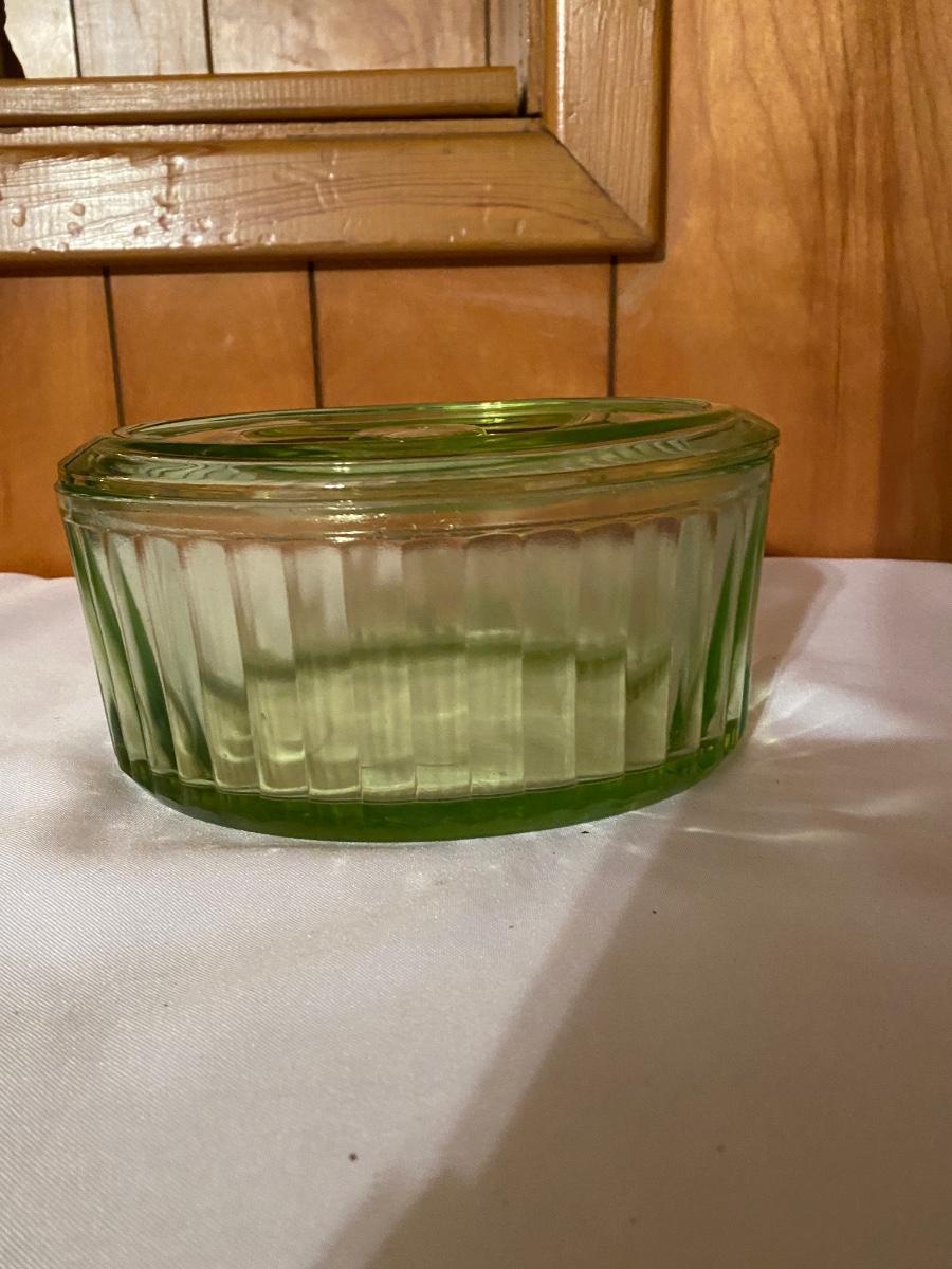 Green depression glass covered server