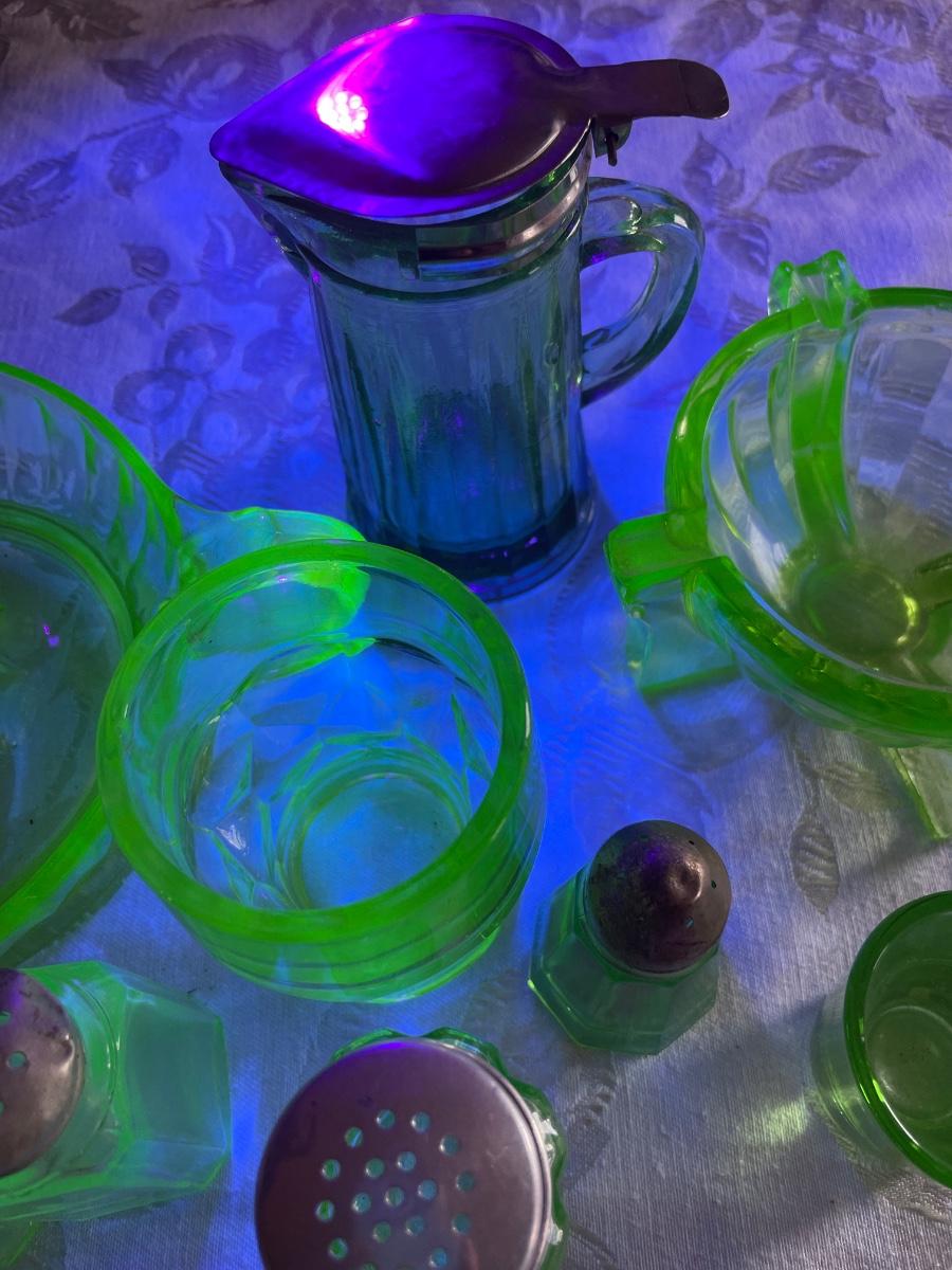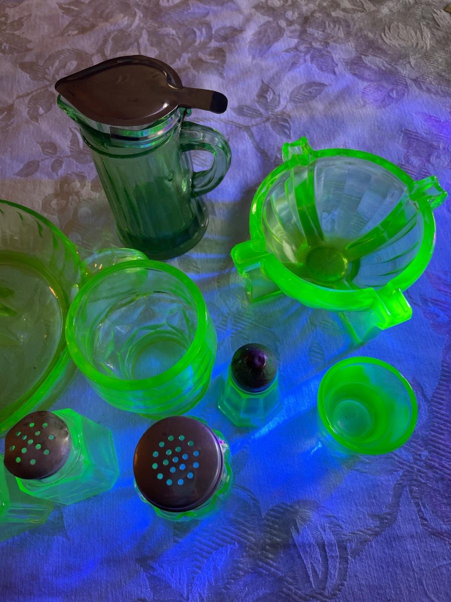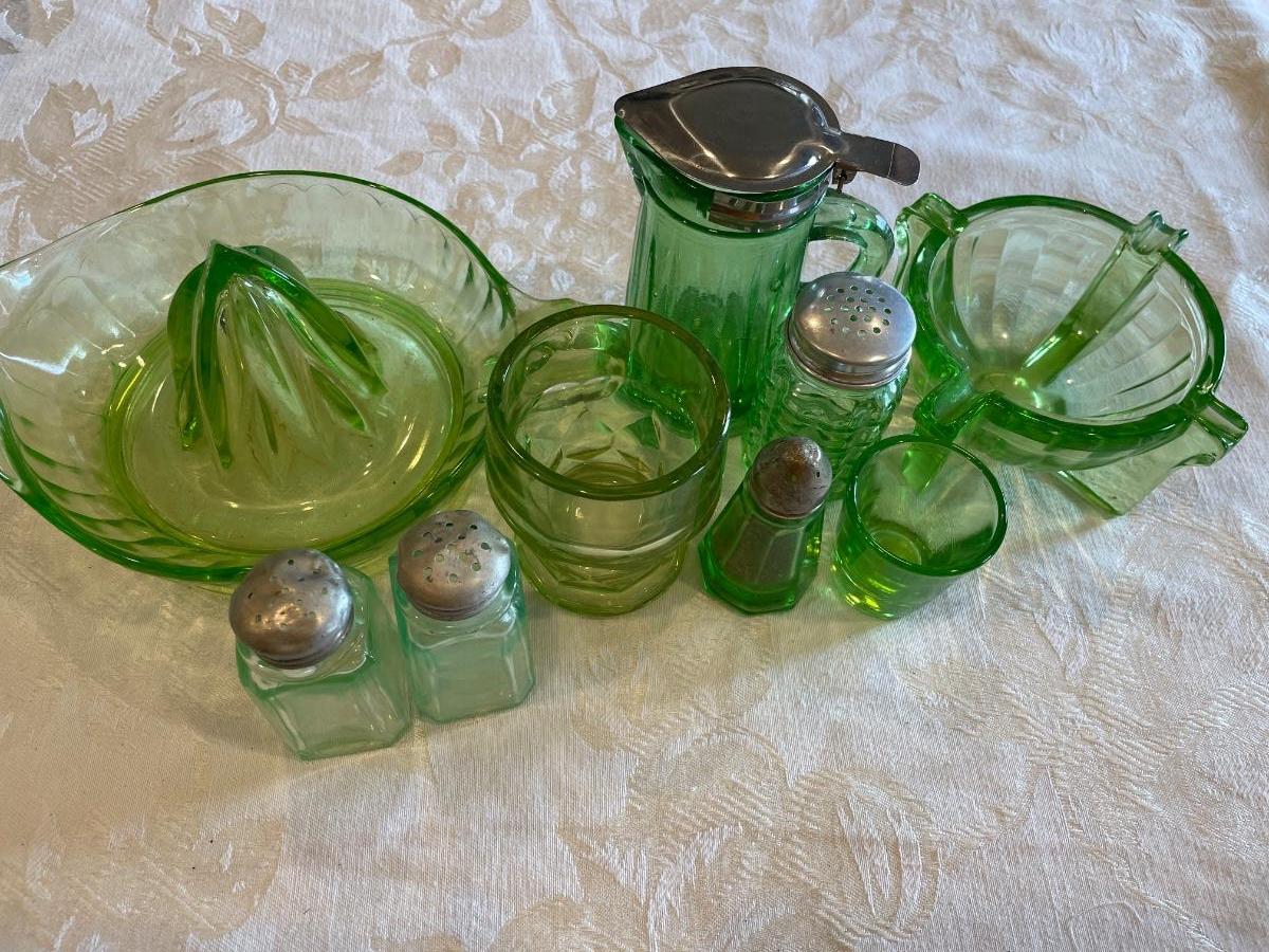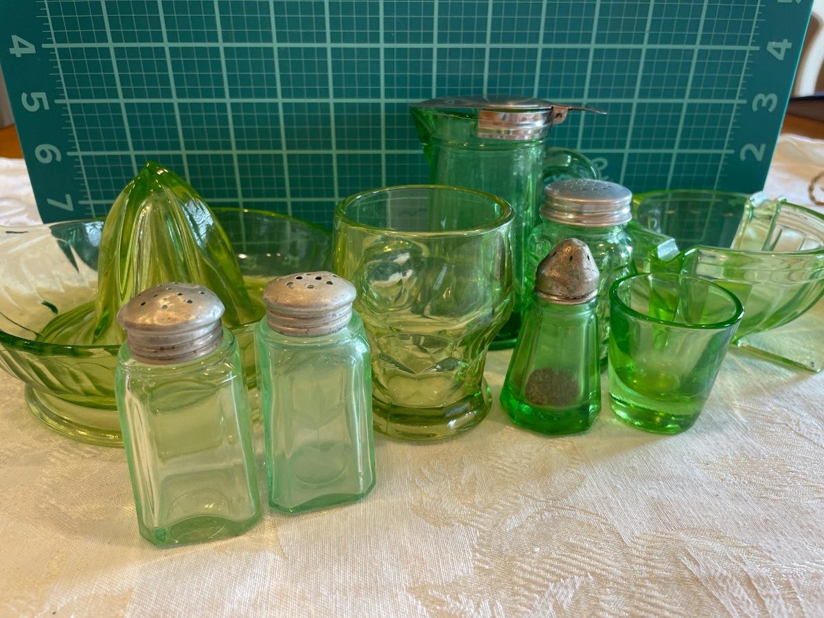 Green depression glass kitchen items