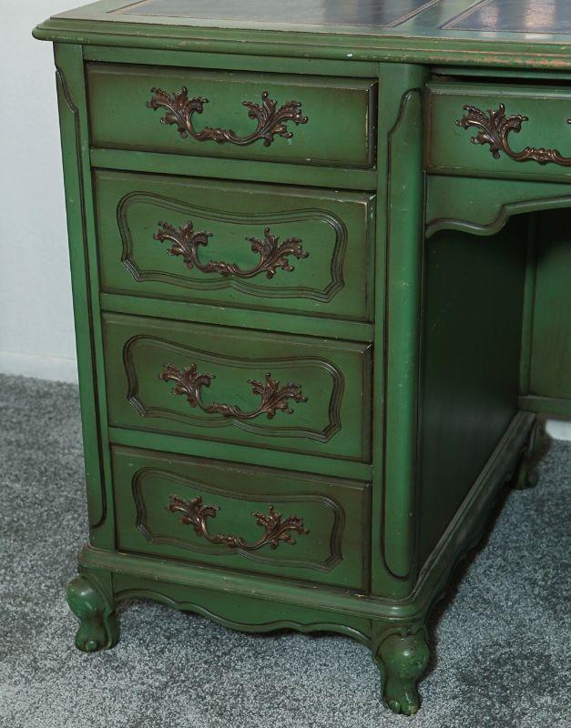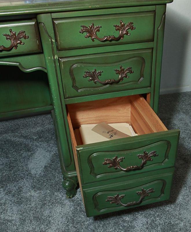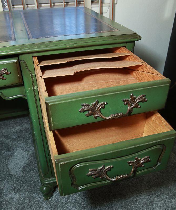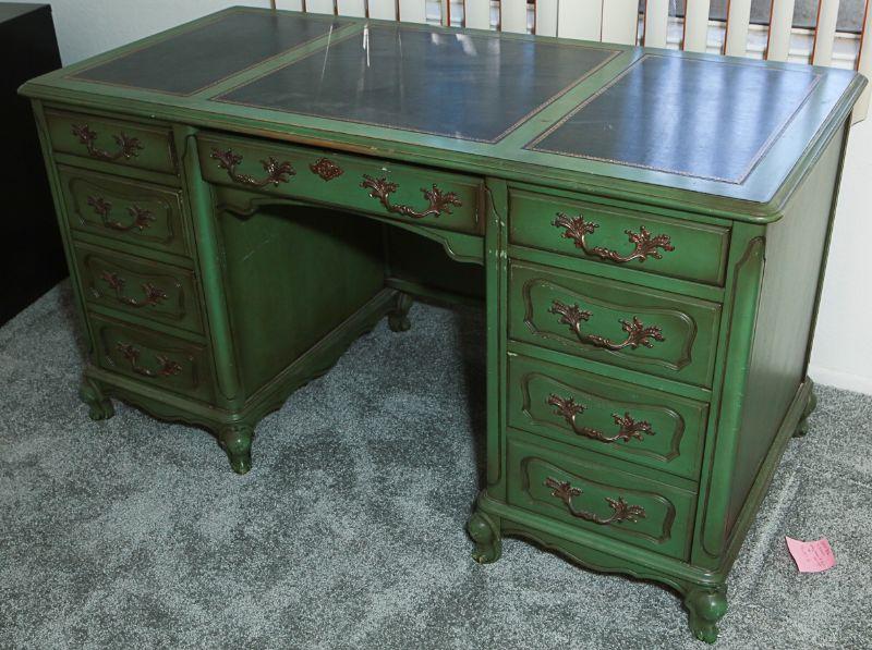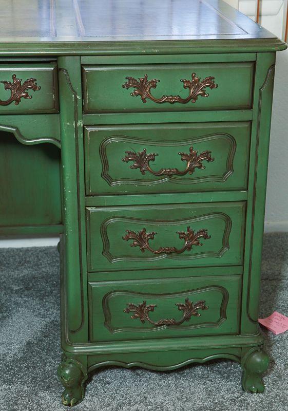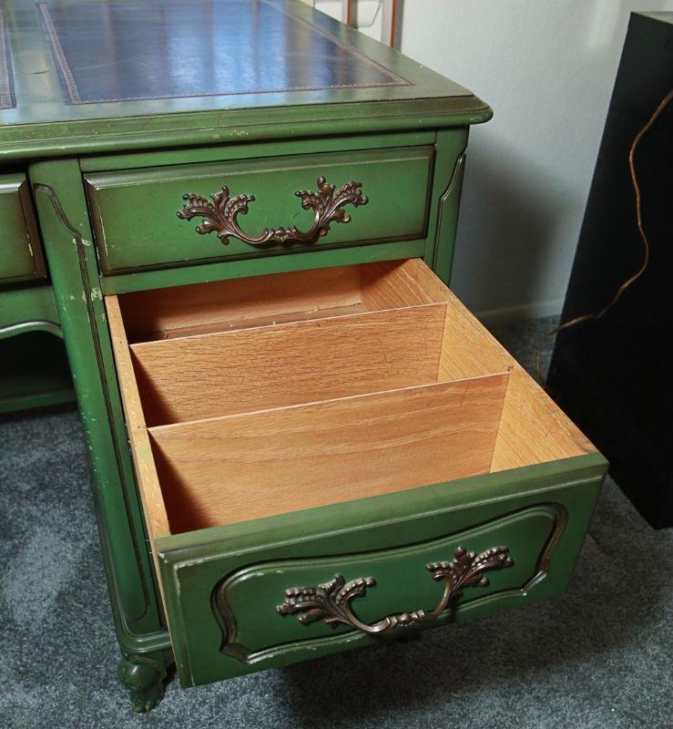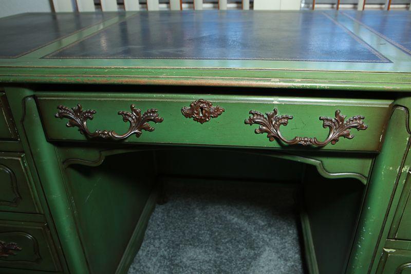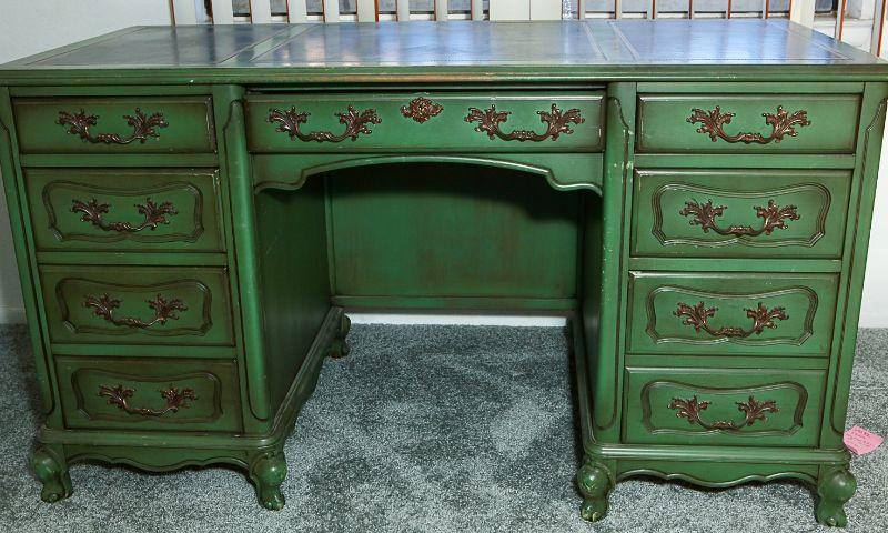 Vintage writing desk. Done in a kelly green color. 7 drawers, some with dividers. in good condition. Measures roughly 54"x25"x30".