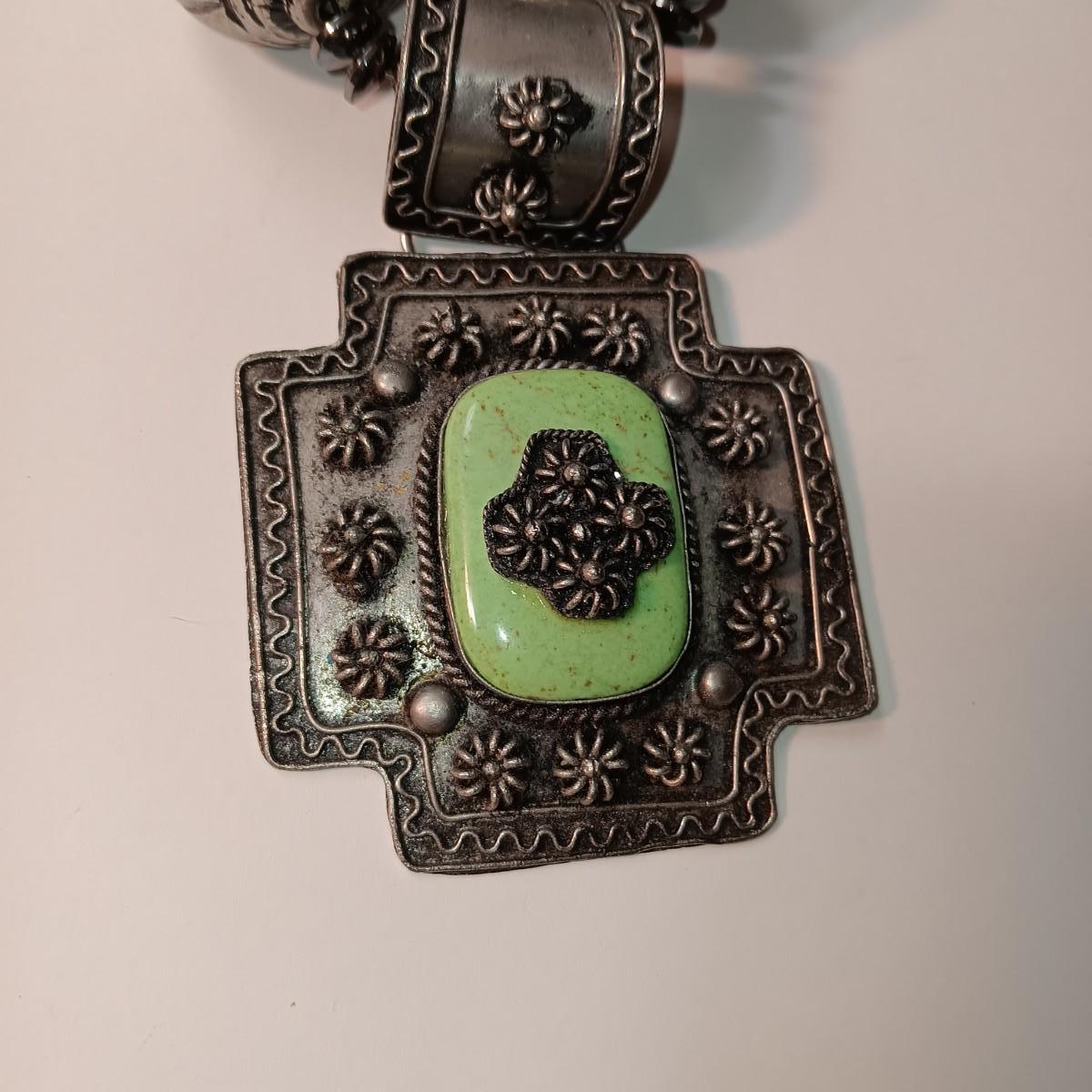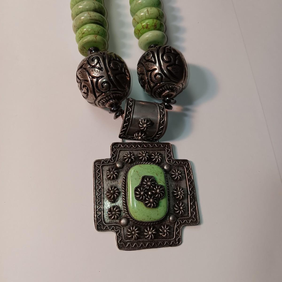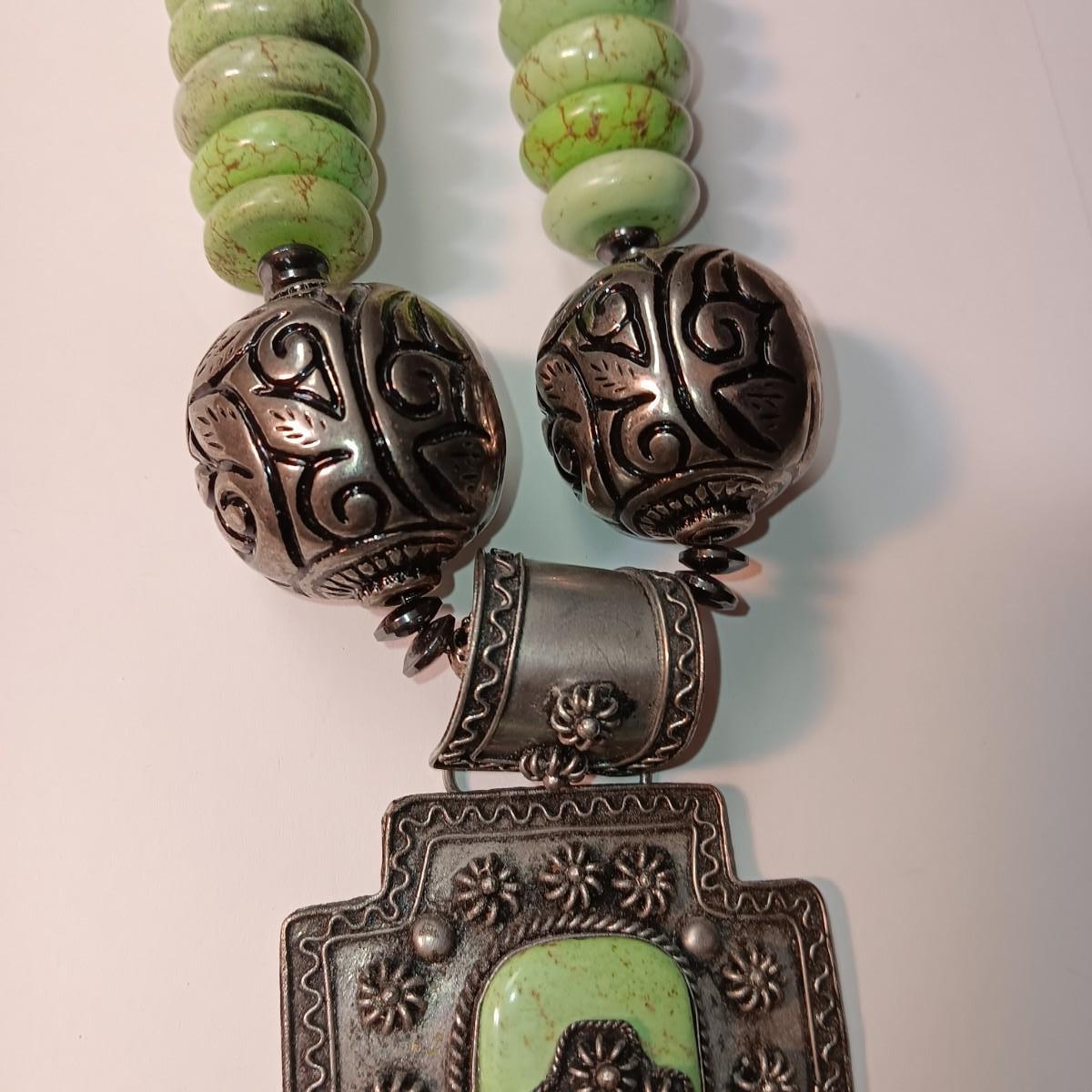GREEN DISC SHAPED STONE NECKLACE WITH SILVER-TONE MEDALLION