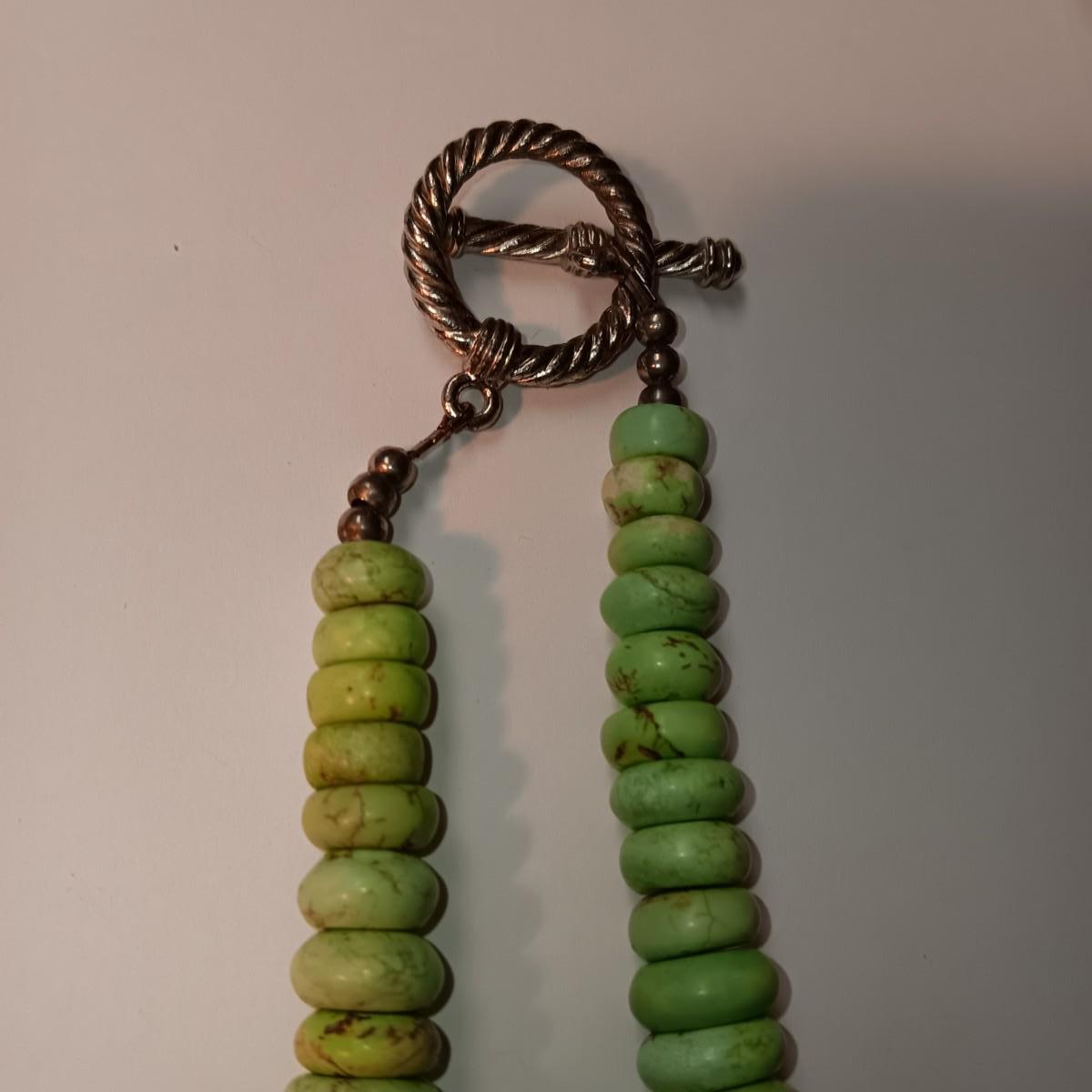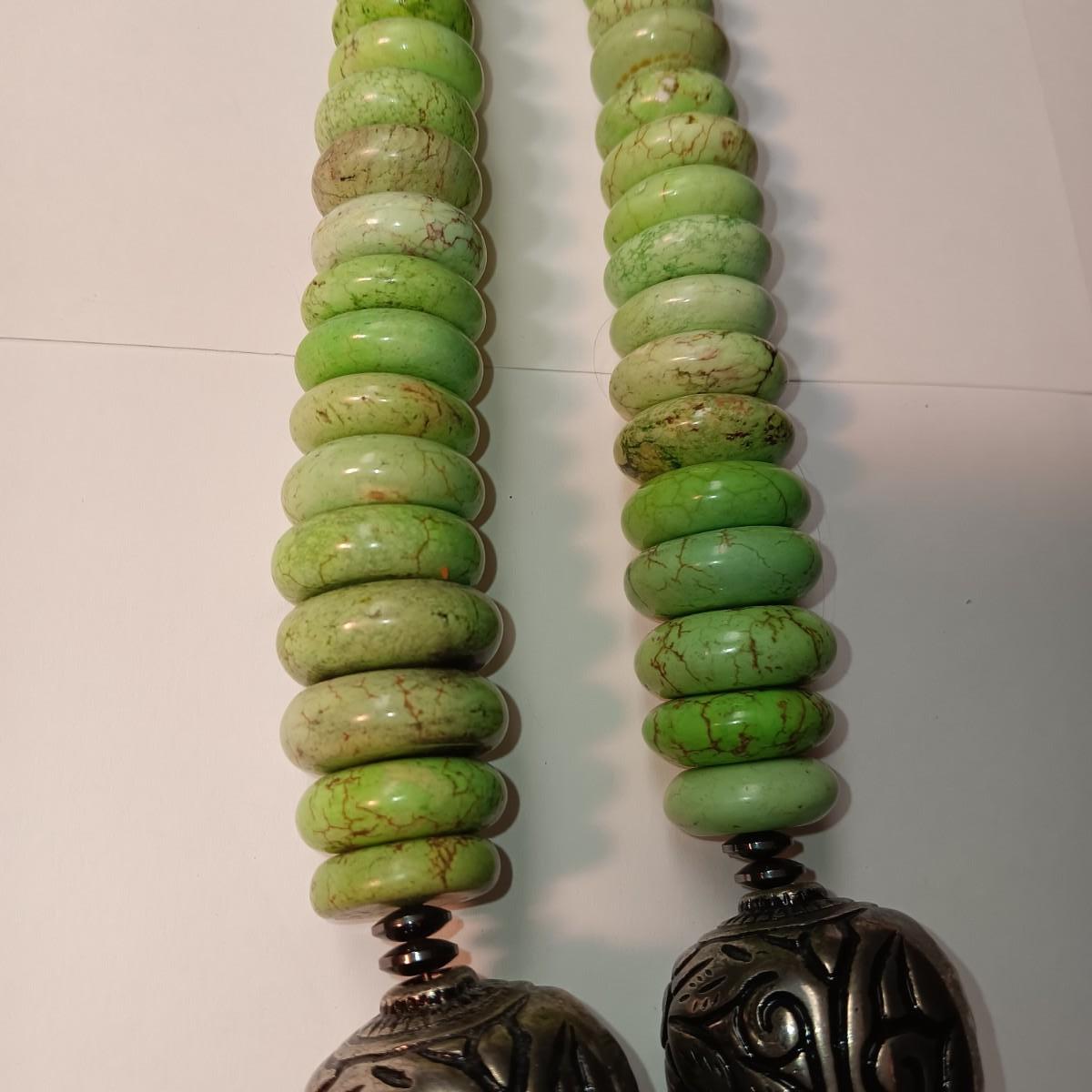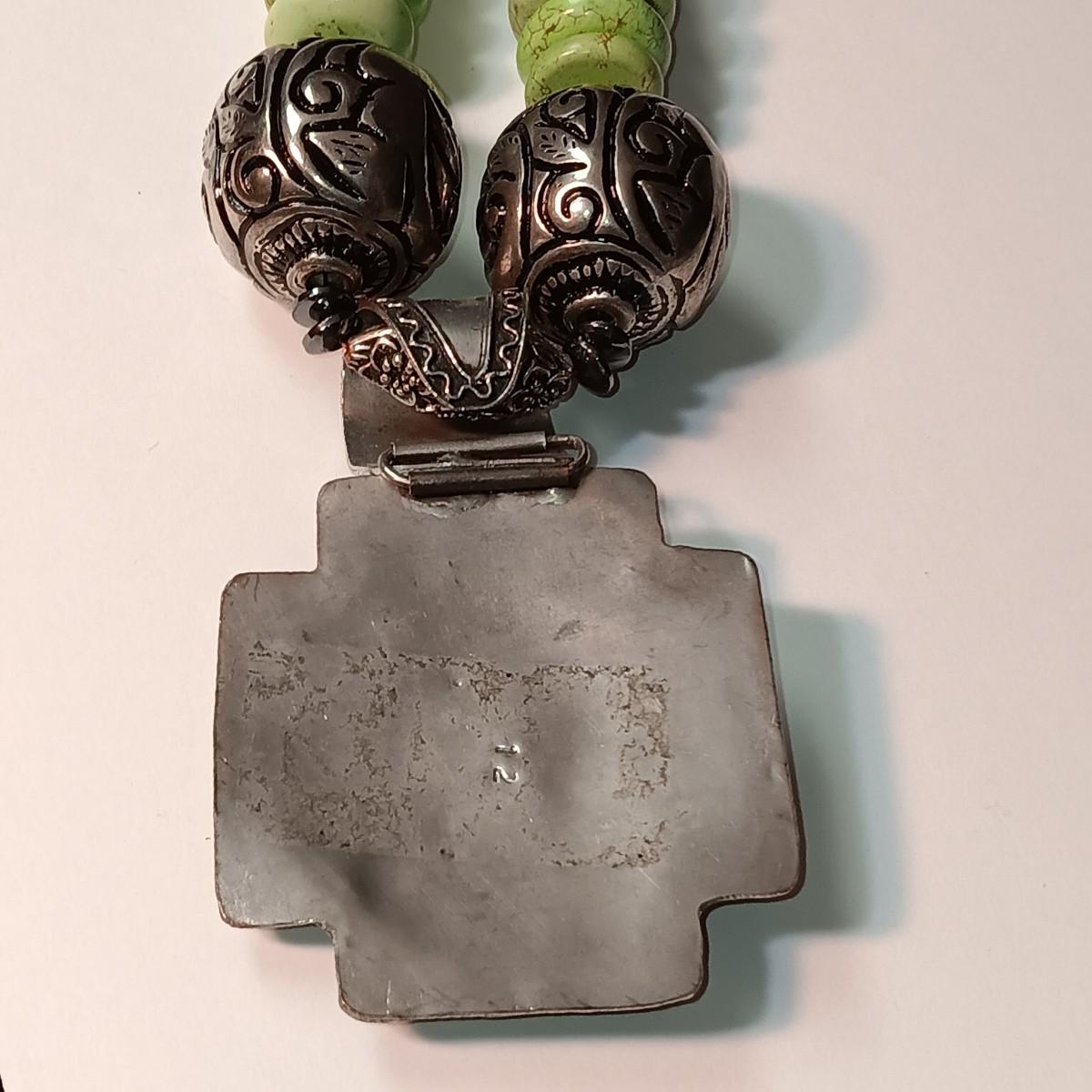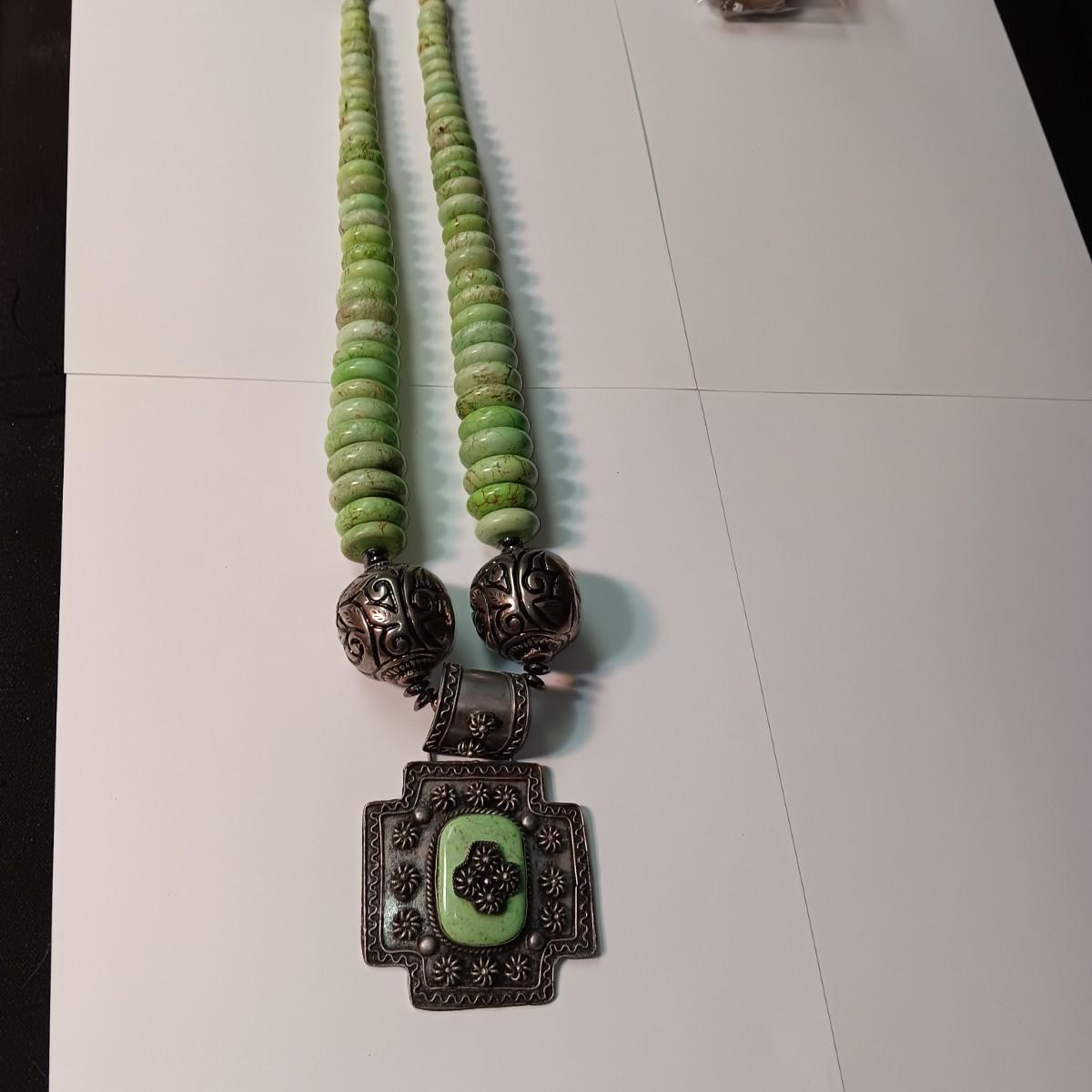 GREEN DISC SHAPED STONE NECKLACE WITH SILVER-TONE MEDALLION