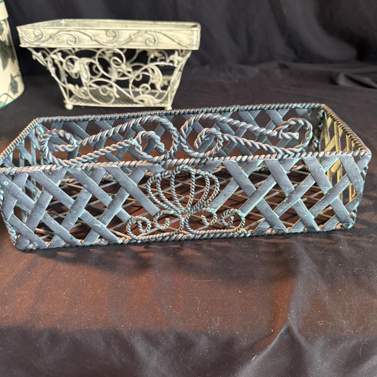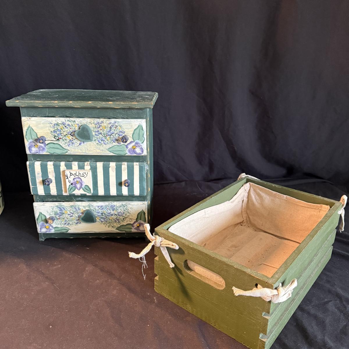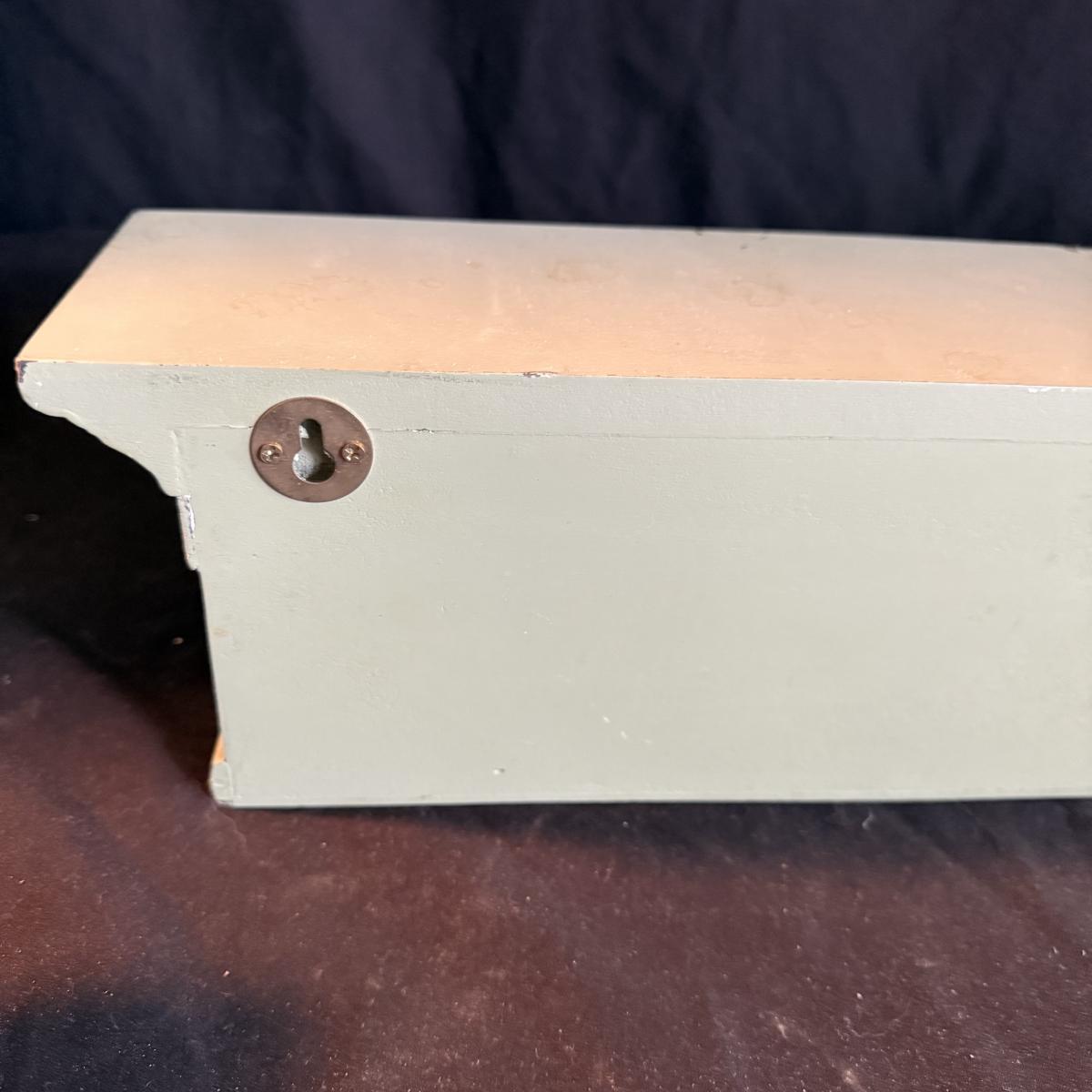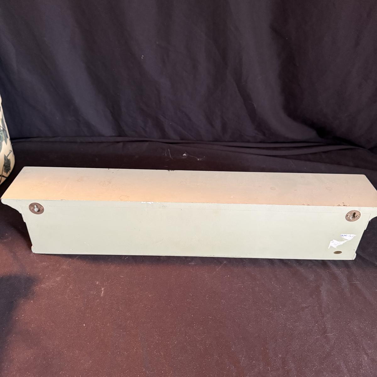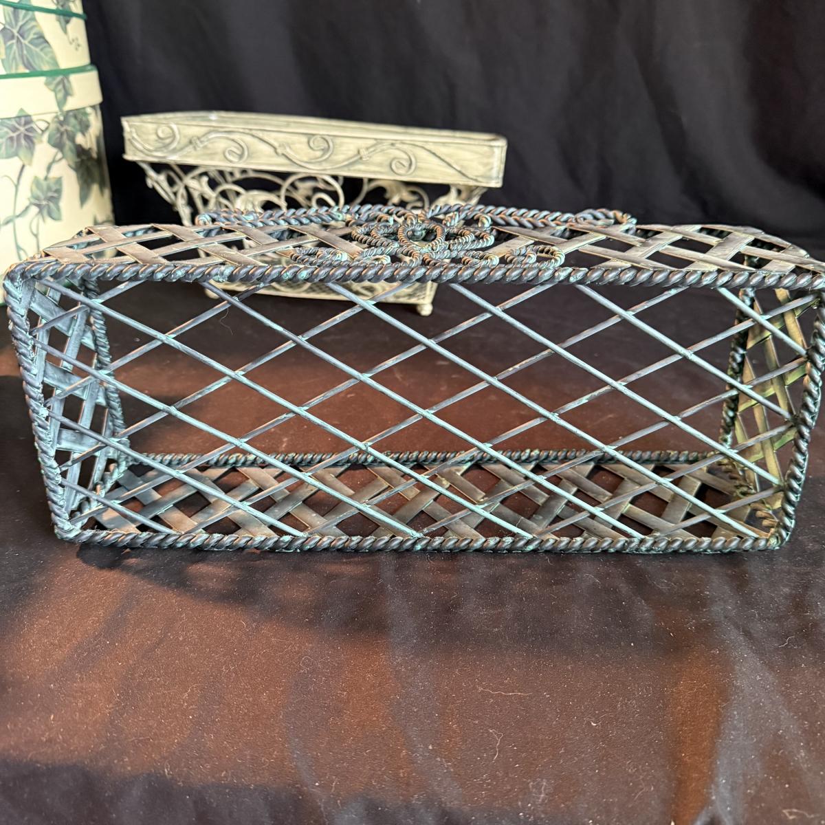 This lot contains 12 soft green home decor items. First we have a set of stacking decorative hat boxes. Each box has a ribbon handle and a removable lid. The largest measures 16”D x 7”H and the smallest measures 12”D x 5”H. Also included are five green baskets, four of which are metal and one that is wood with a linen lining. One of the metal baskets is missing a round foot, see pictures. Moving on we have an ornate wooden hanging shelf that measures 23.5” x 4” x 4.75”H. This shelf has hardware to be hung. Last is a wooden apothecary that appears to be hand painted. It has three drawers and measures 11” x 6.5” x 12.75”H, one of the shelf knobs is missing. Local pickup only.