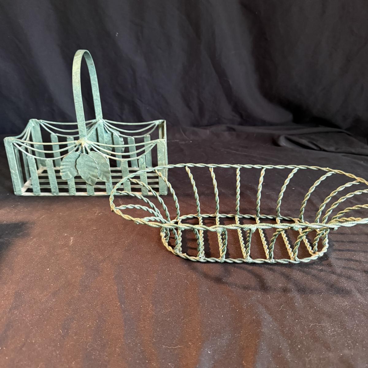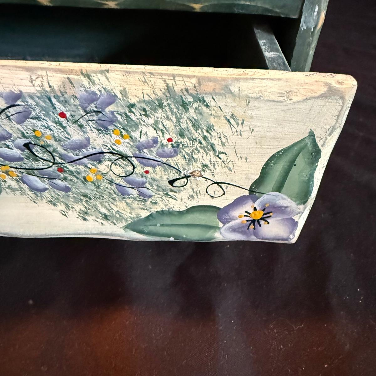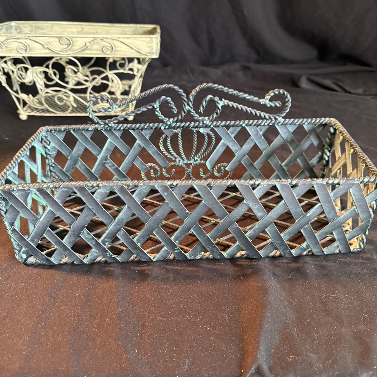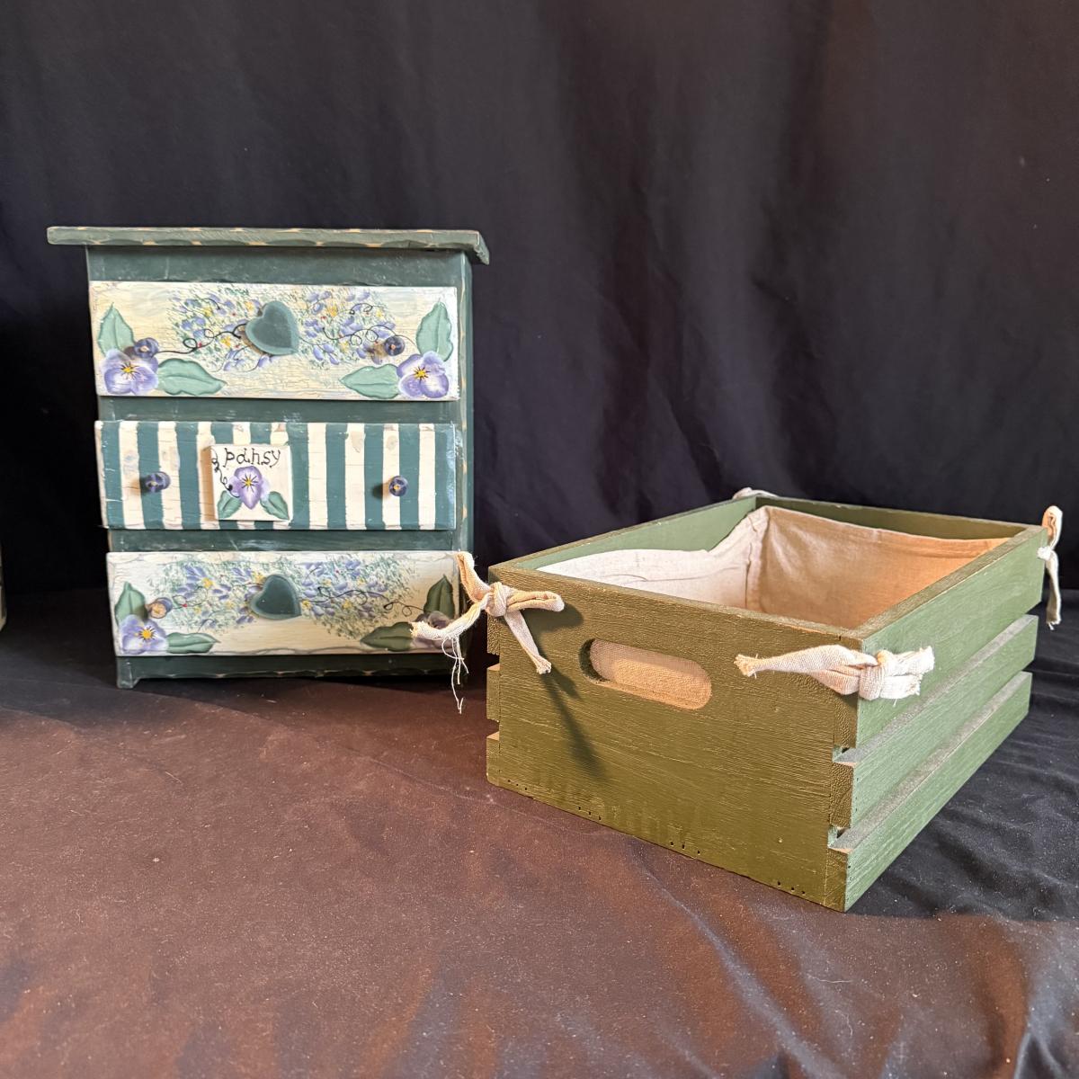This lot contains 12 soft green home decor items. First we have a set of stacking decorative hat boxes. Each box has a ribbon handle and a removable lid. The largest measures 16”D x 7”H and the smallest measures 12”D x 5”H. Also included are five green baskets, four of which are metal and one that is wood with a linen lining. One of the metal baskets is missing a round foot, see pictures. Moving on we have an ornate wooden hanging shelf that measures 23.5” x 4” x 4.75”H. This shelf has hardware to be hung. Last is a wooden apothecary that appears to be hand painted. It has three drawers and measures 11” x 6.5” x 12.75”H, one of the shelf knobs is missing. Local pickup only.