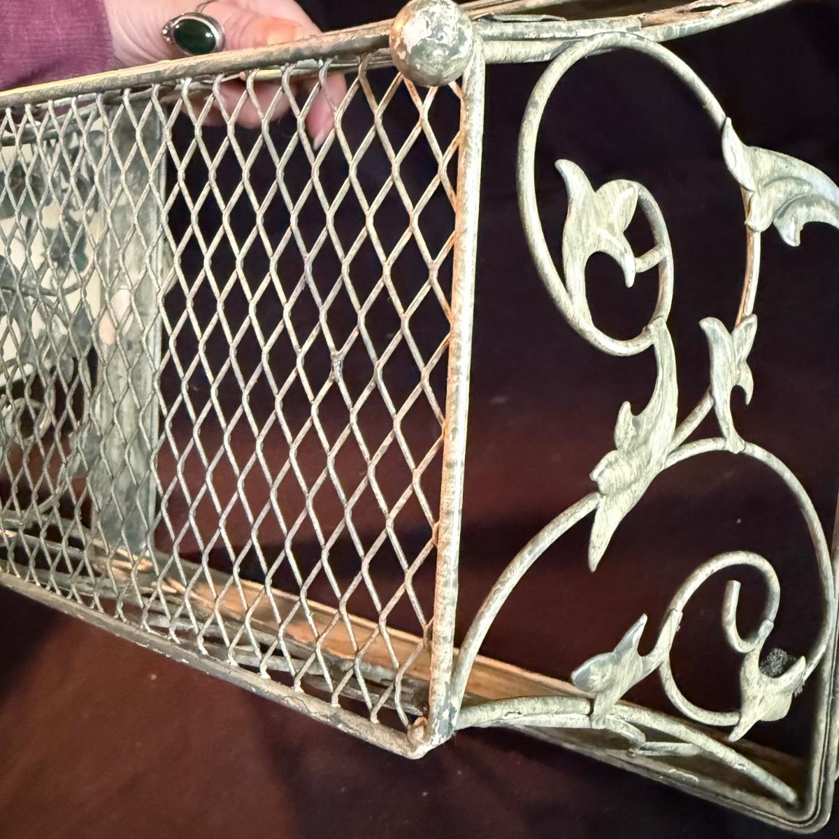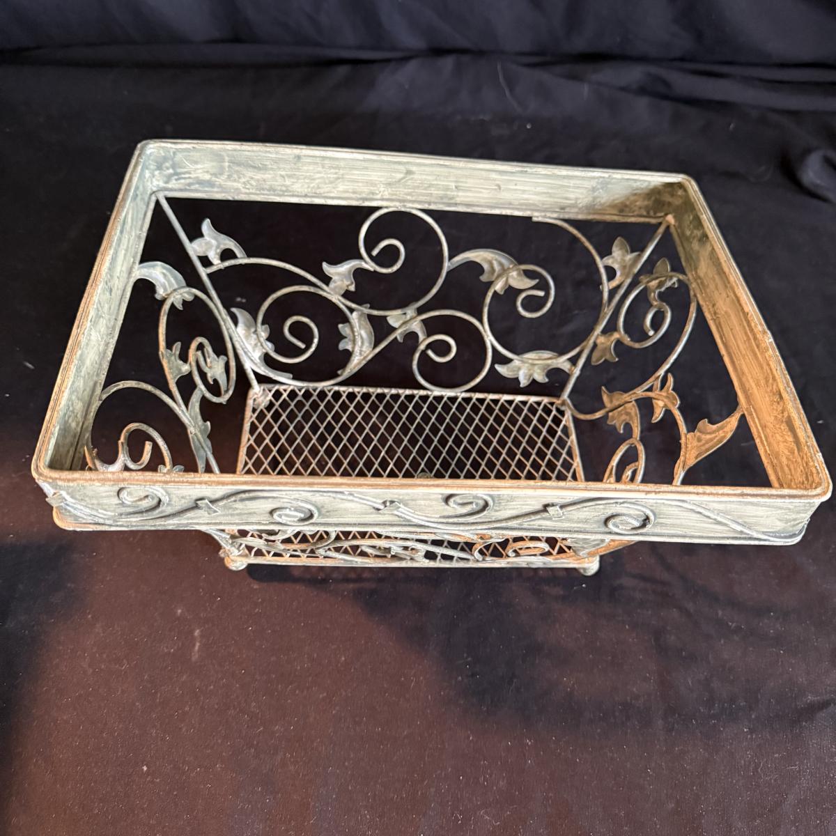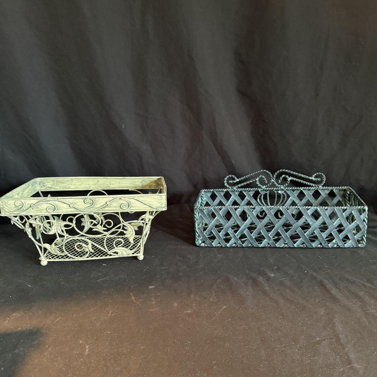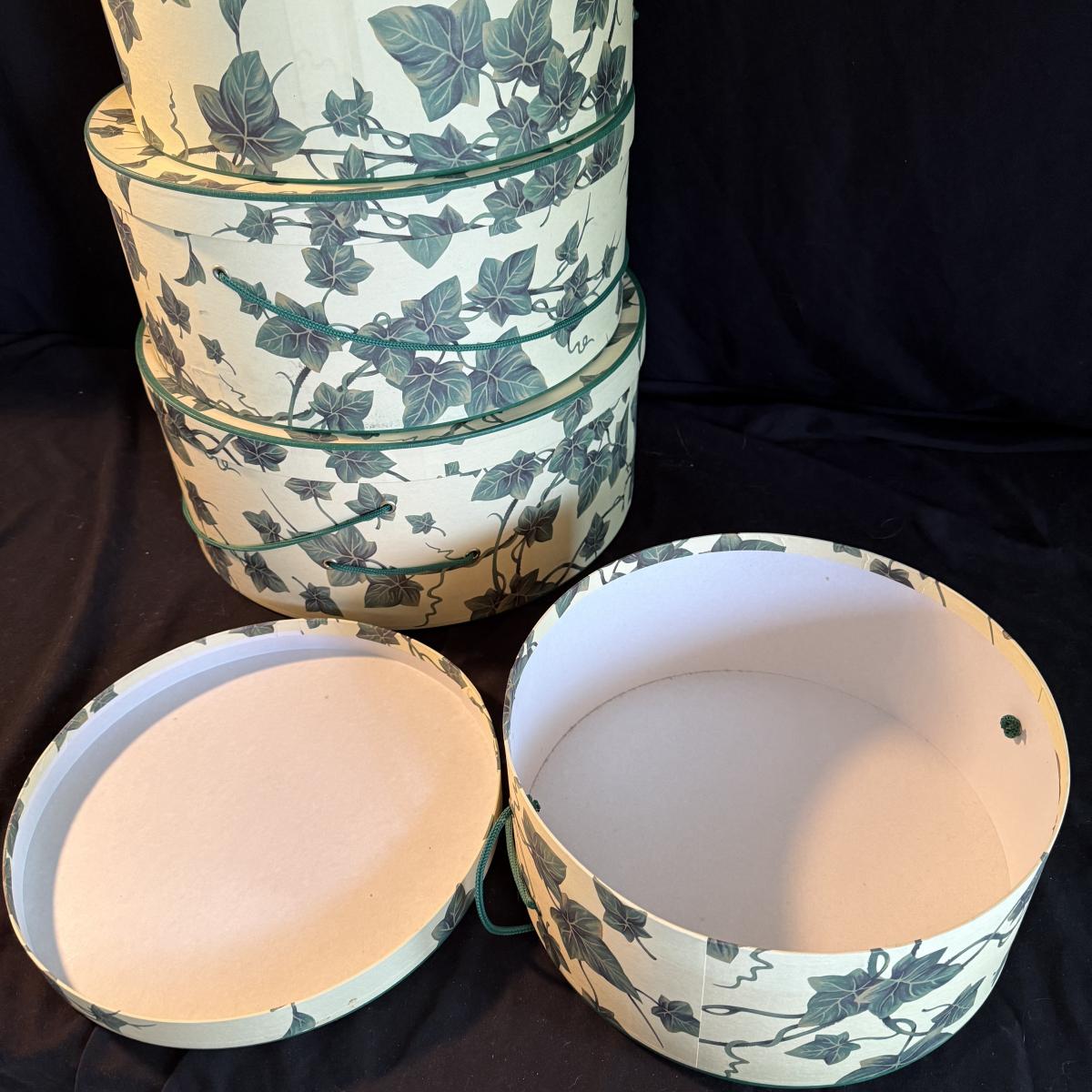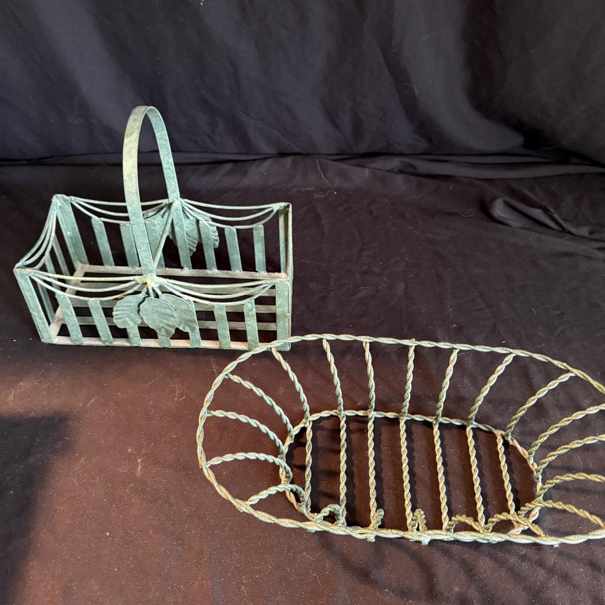 This lot contains 12 soft green home decor items. First we have a set of stacking decorative hat boxes. Each box has a ribbon handle and a removable lid. The largest measures 16”D x 7”H and the smallest measures 12”D x 5”H. Also included are five green baskets, four of which are metal and one that is wood with a linen lining. One of the metal baskets is missing a round foot, see pictures. Moving on we have an ornate wooden hanging shelf that measures 23.5” x 4” x 4.75”H. This shelf has hardware to be hung. Last is a wooden apothecary that appears to be hand painted. It has three drawers and measures 11” x 6.5” x 12.75”H, one of the shelf knobs is missing. Local pickup only.