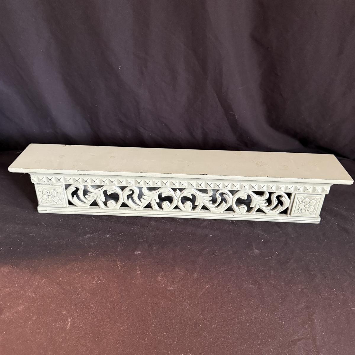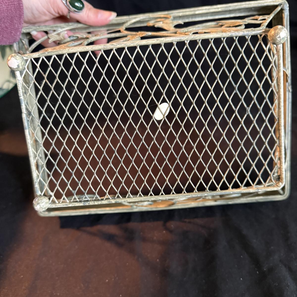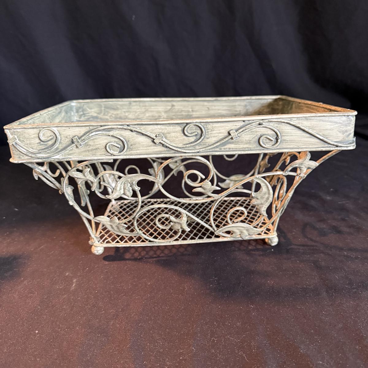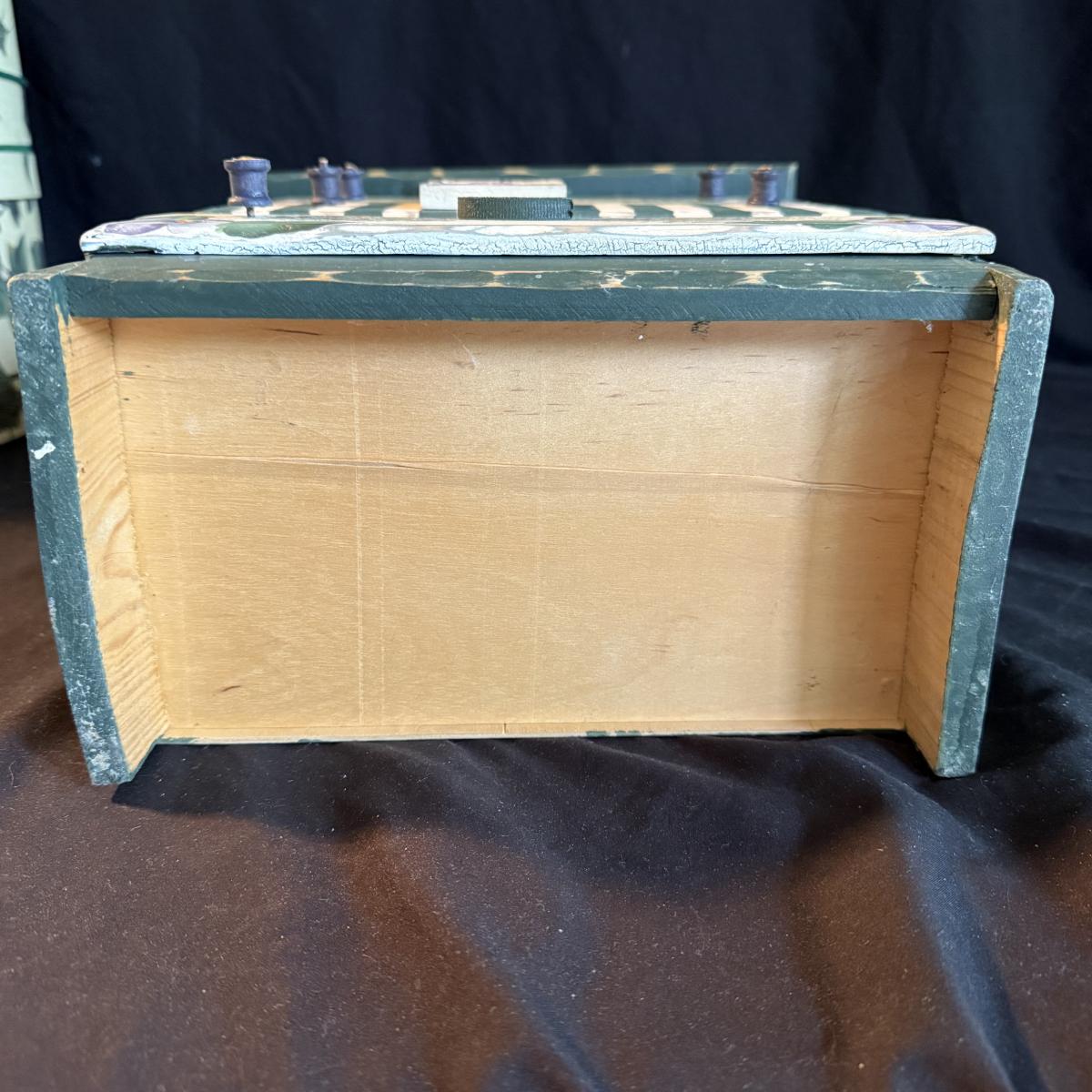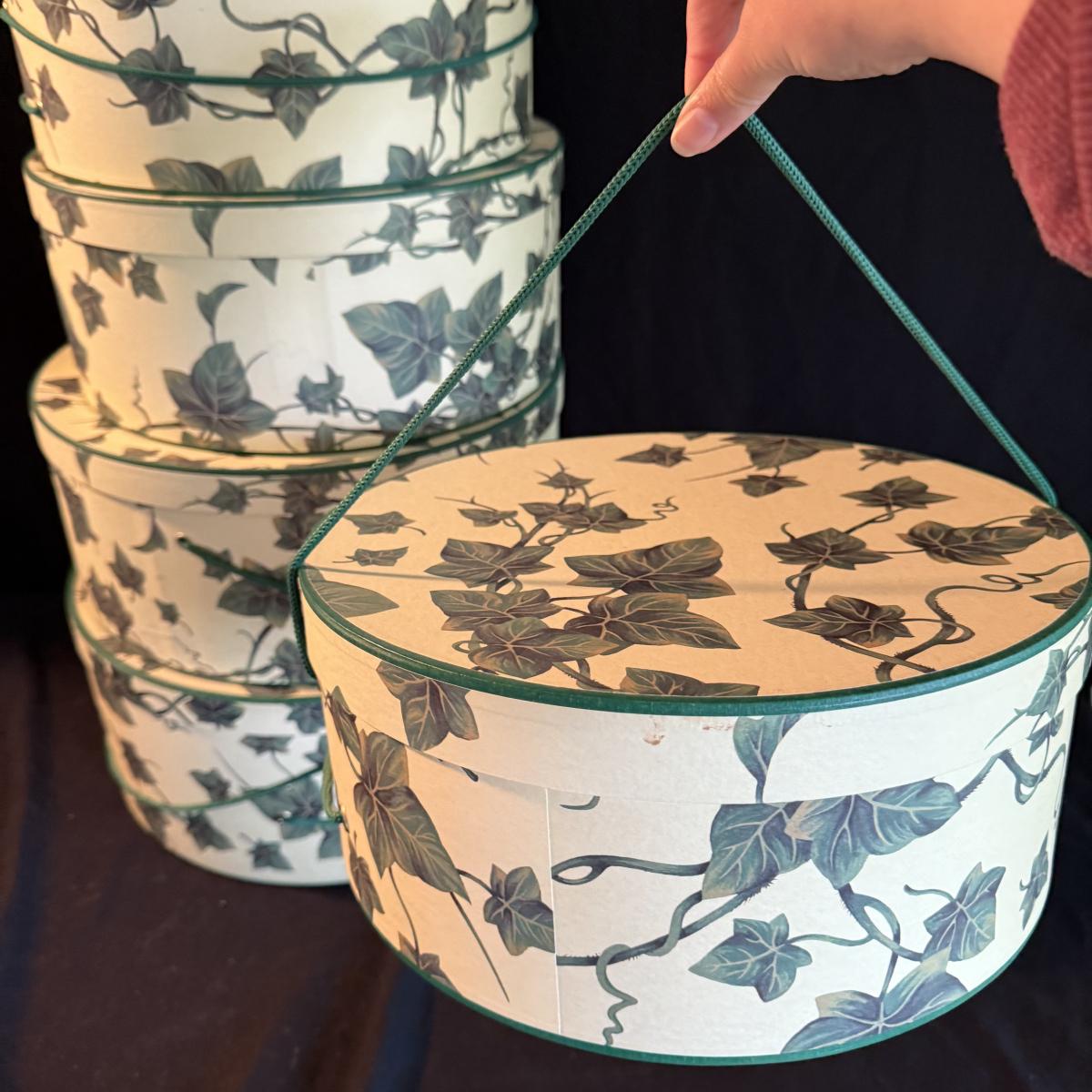 This lot contains 12 soft green home decor items. First we have a set of stacking decorative hat boxes. Each box has a ribbon handle and a removable lid. The largest measures 16”D x 7”H and the smallest measures 12”D x 5”H. Also included are five green baskets, four of which are metal and one that is wood with a linen lining. One of the metal baskets is missing a round foot, see pictures. Moving on we have an ornate wooden hanging shelf that measures 23.5” x 4” x 4.75”H. This shelf has hardware to be hung. Last is a wooden apothecary that appears to be hand painted. It has three drawers and measures 11” x 6.5” x 12.75”H, one of the shelf knobs is missing. Local pickup only.