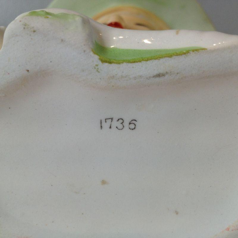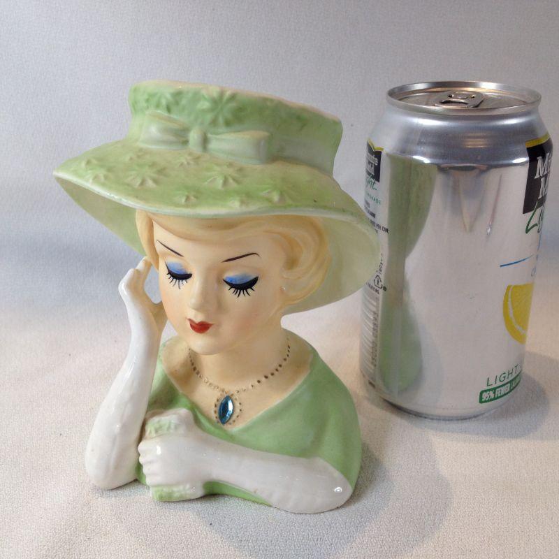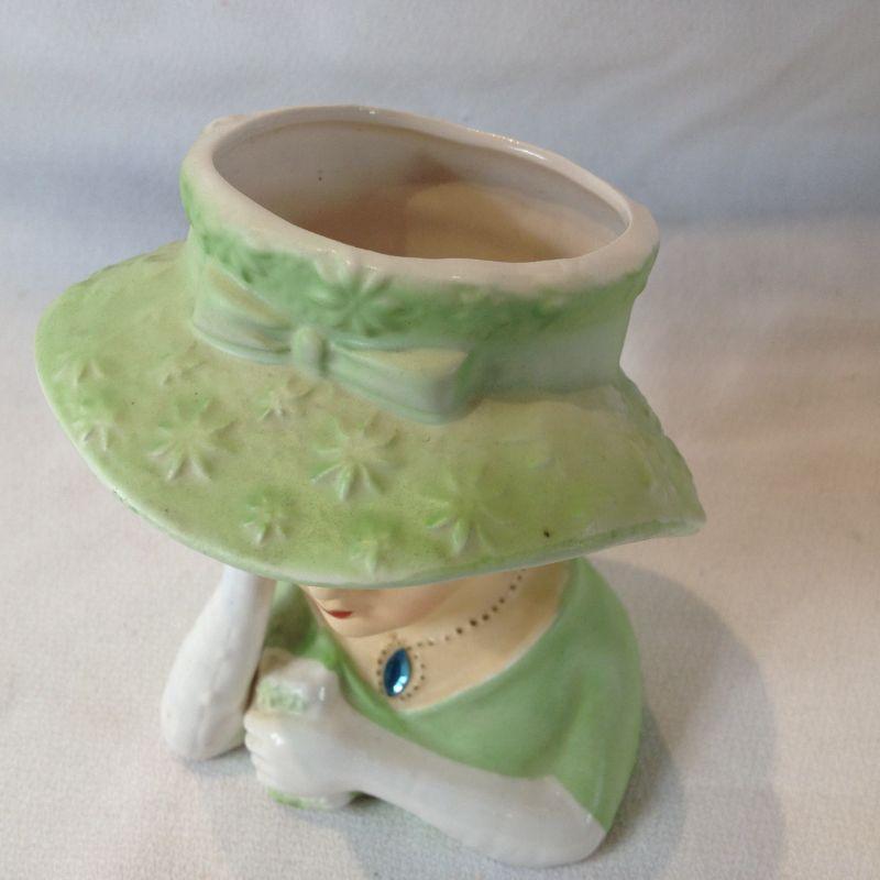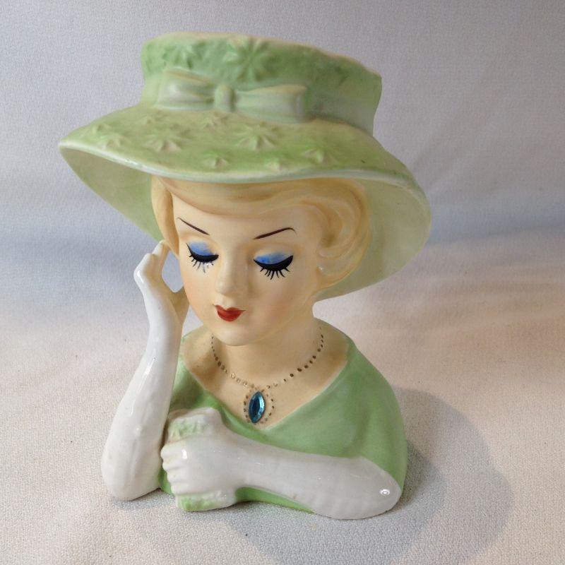 This lot is for a good example of the classic Head Vase. Depicting a Pretty Lady in a Green Dress. This is a very pretty head vase with a nice "gem" necklace. Only markings on this vase are the numbers 1735. In very good condition