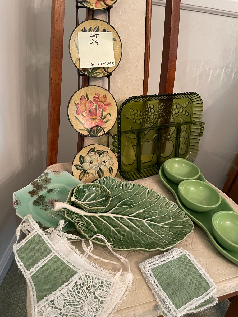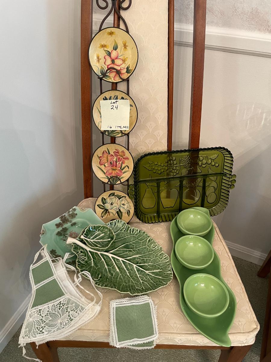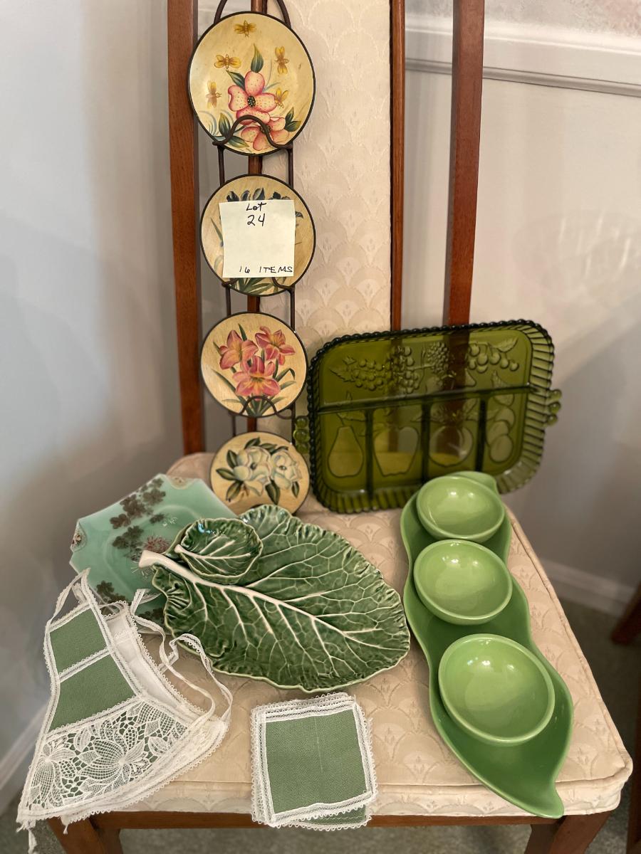 Delightful assortment of decorative plates and serving pieces & small wine related textiles - 16 piece