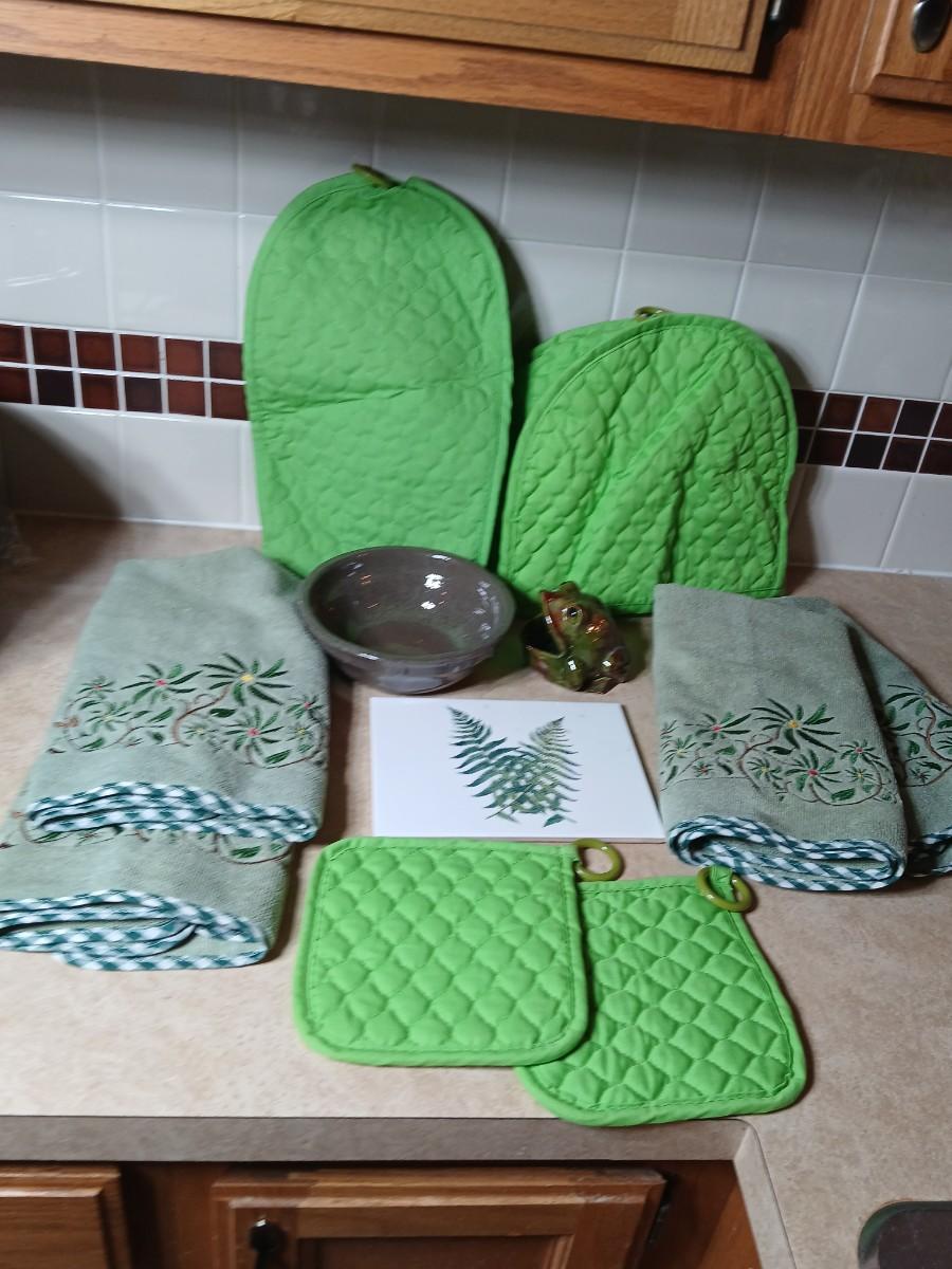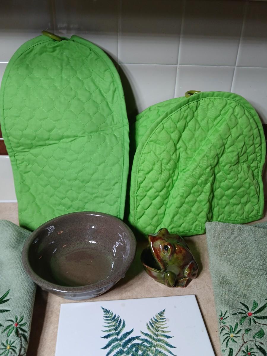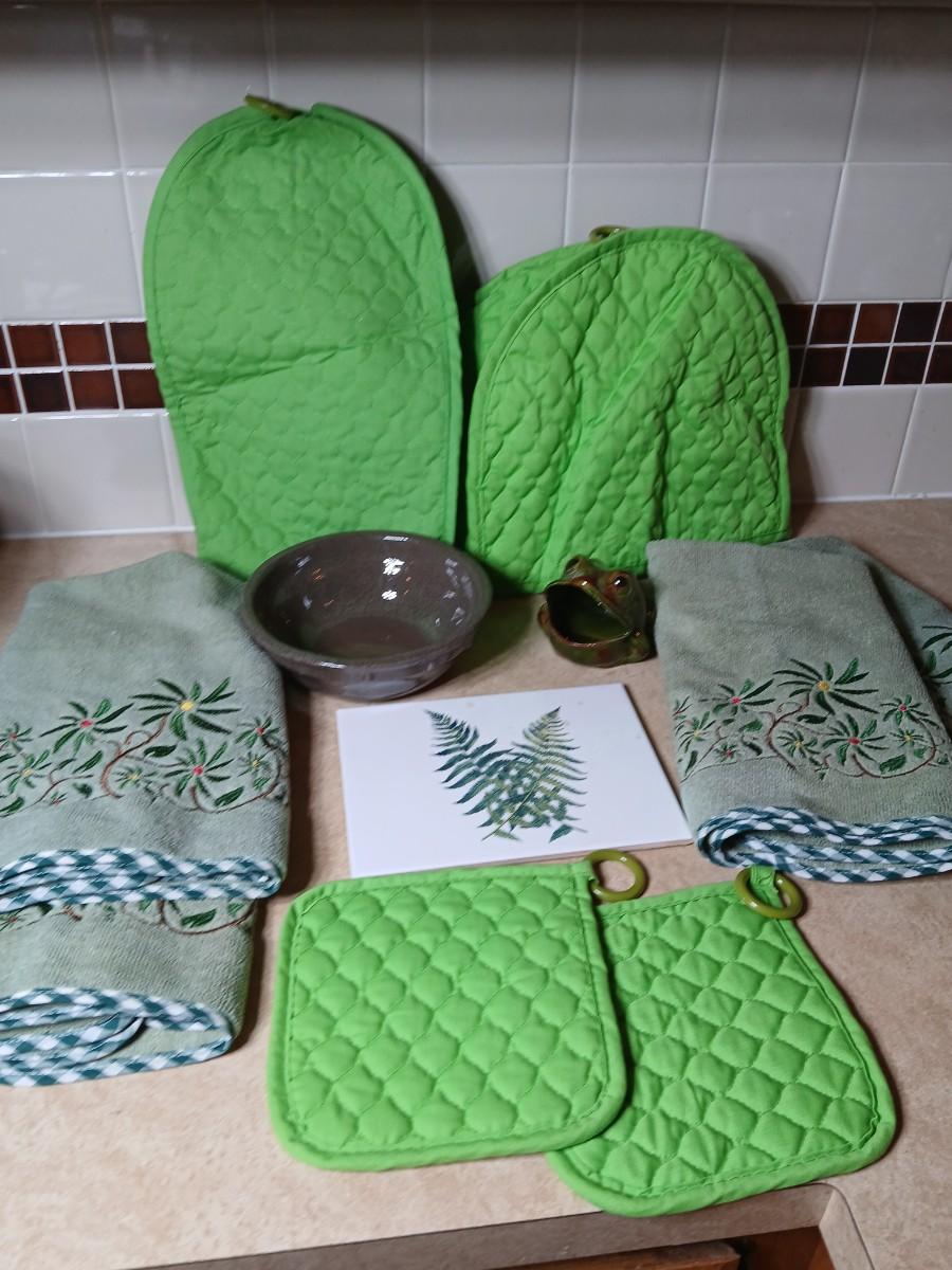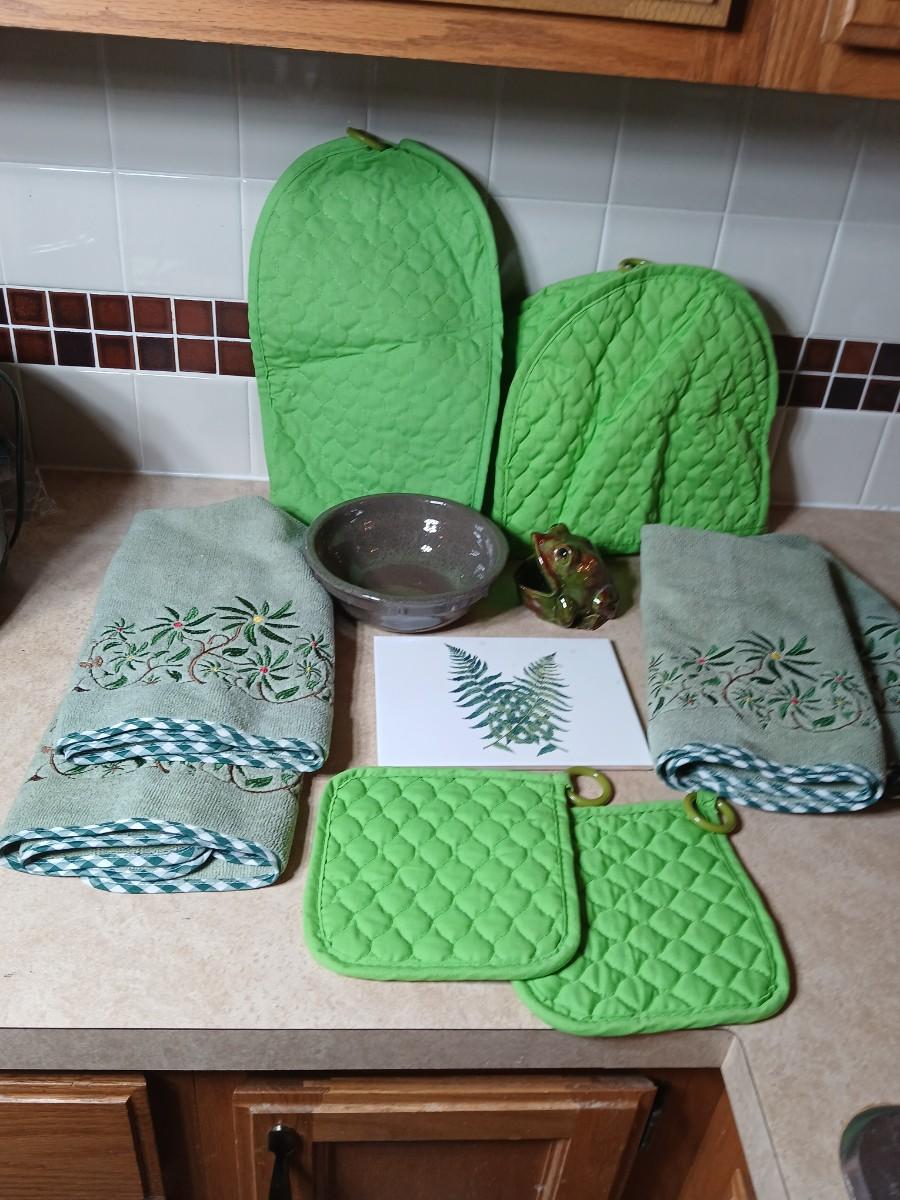 Green fabric appliance covers, with dish drying towels and soap dish frog
