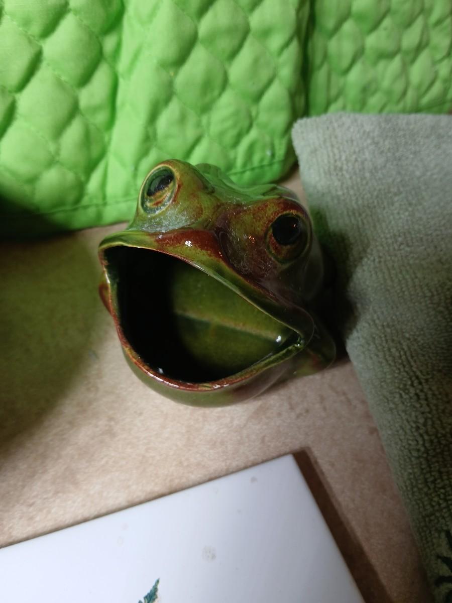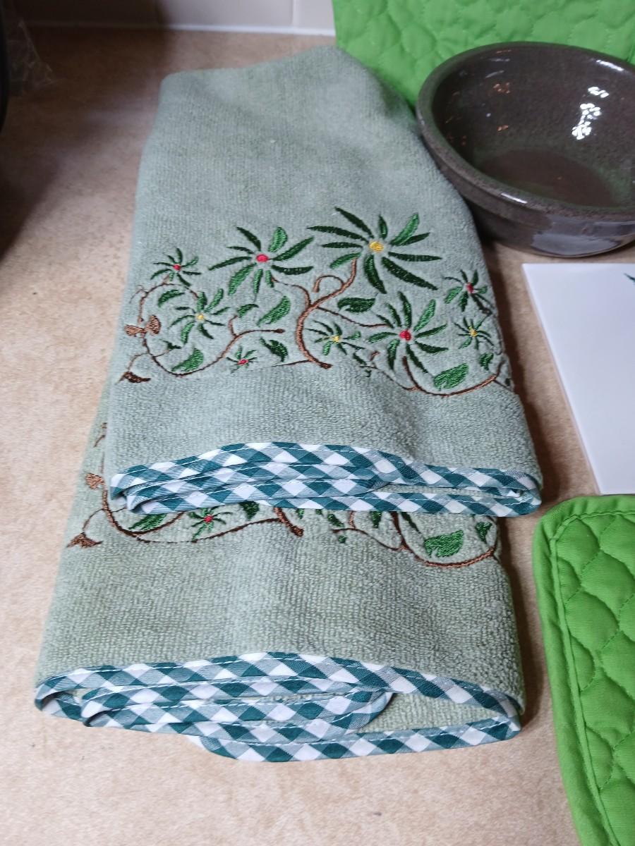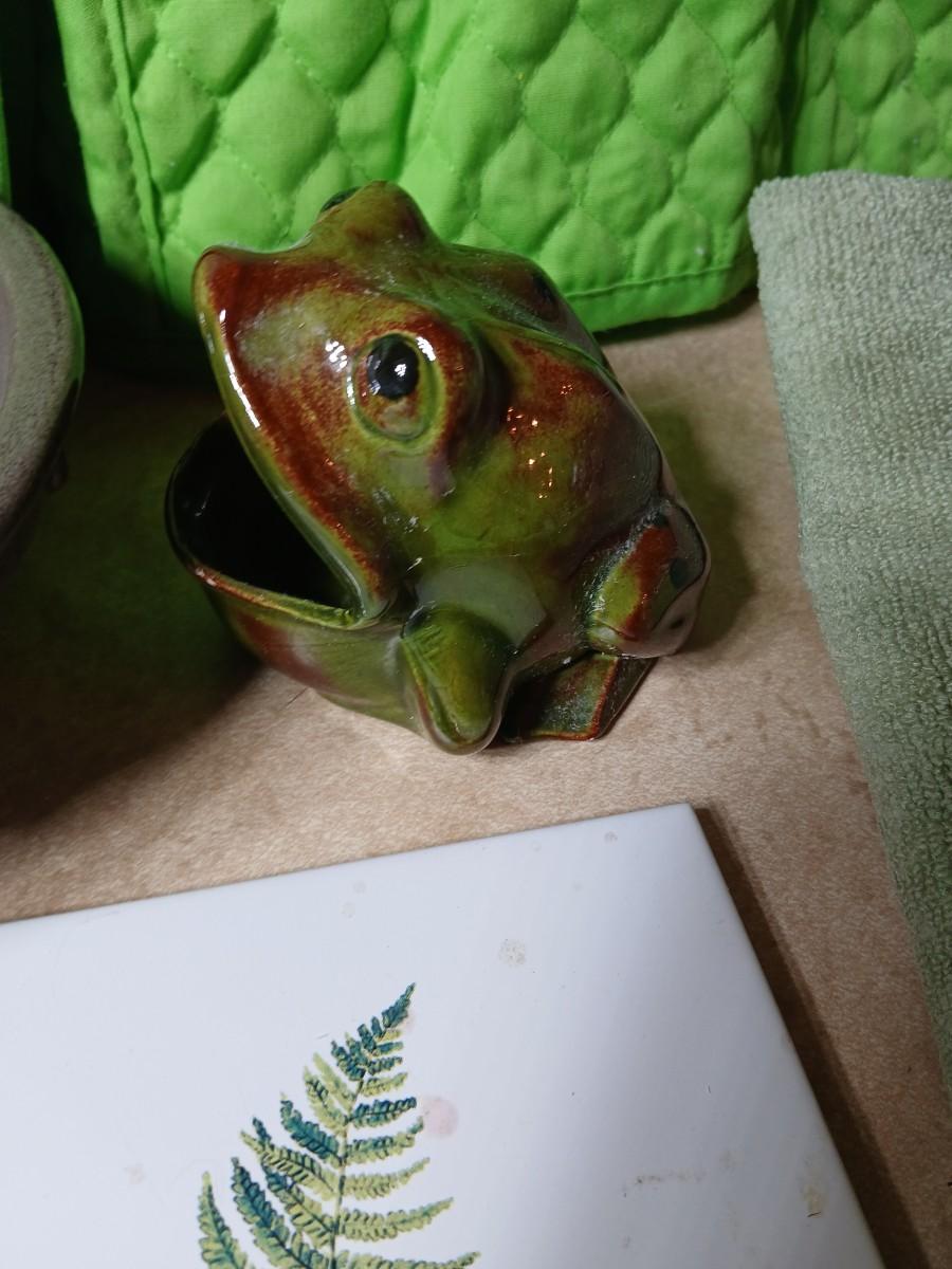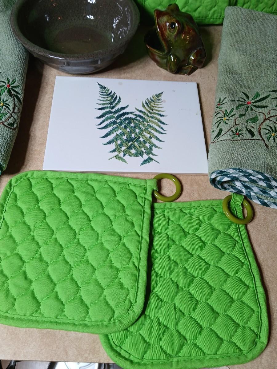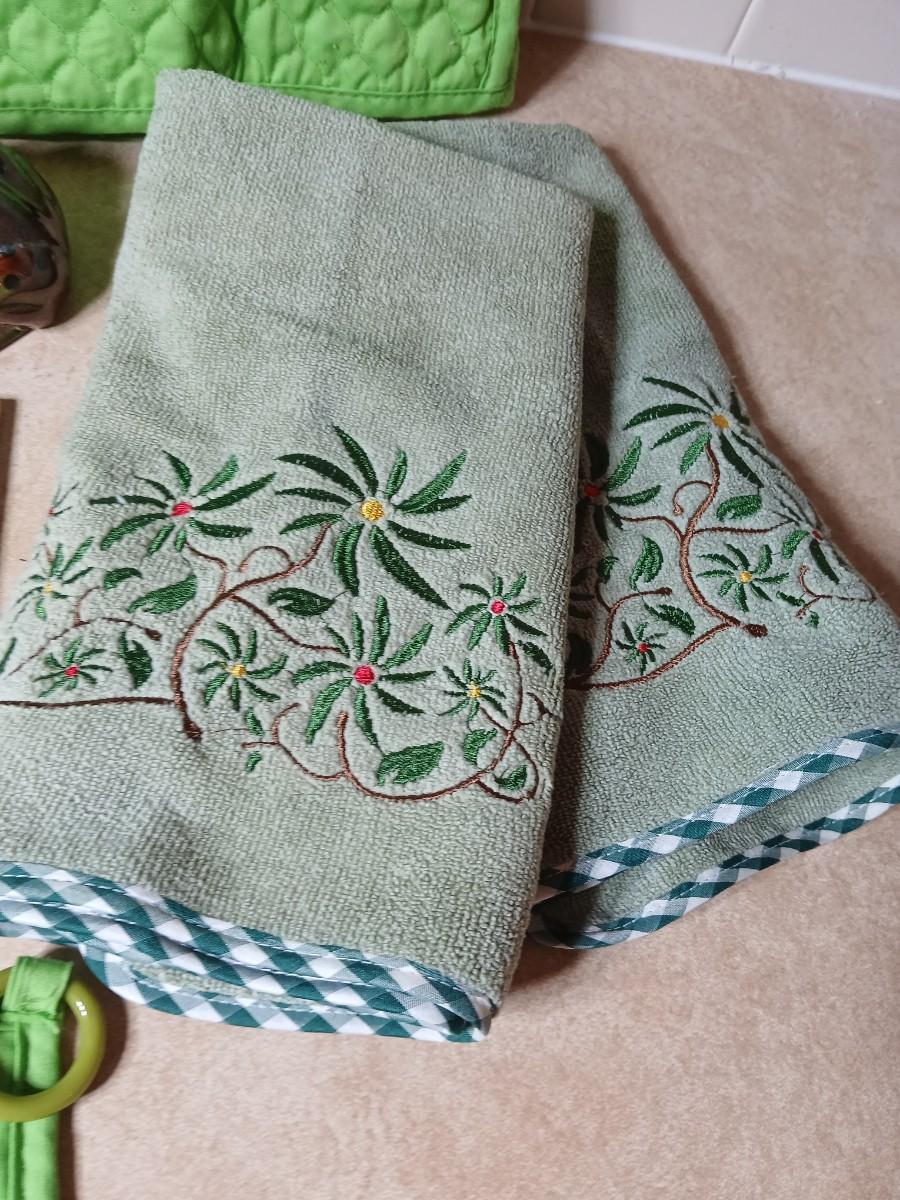 Green fabric appliance covers, with dish drying towels and soap dish frog