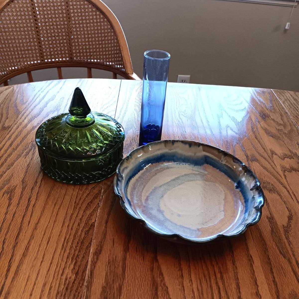 GREEN GLASS CANDY DISH, VASE AND CLAY BOWL